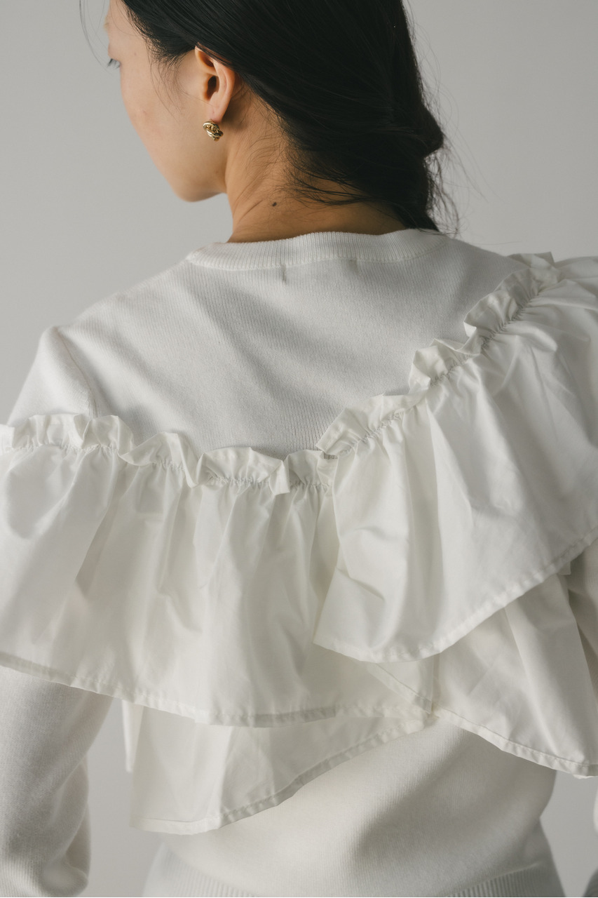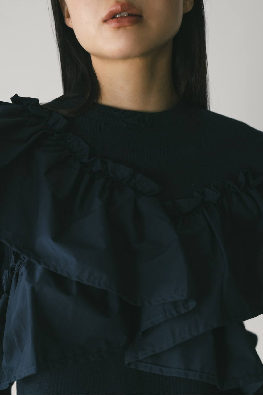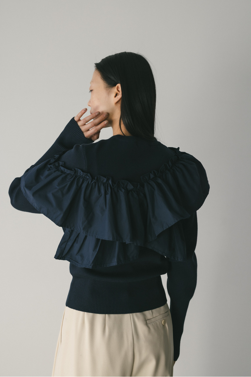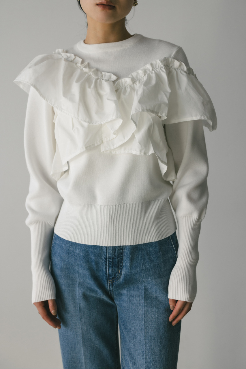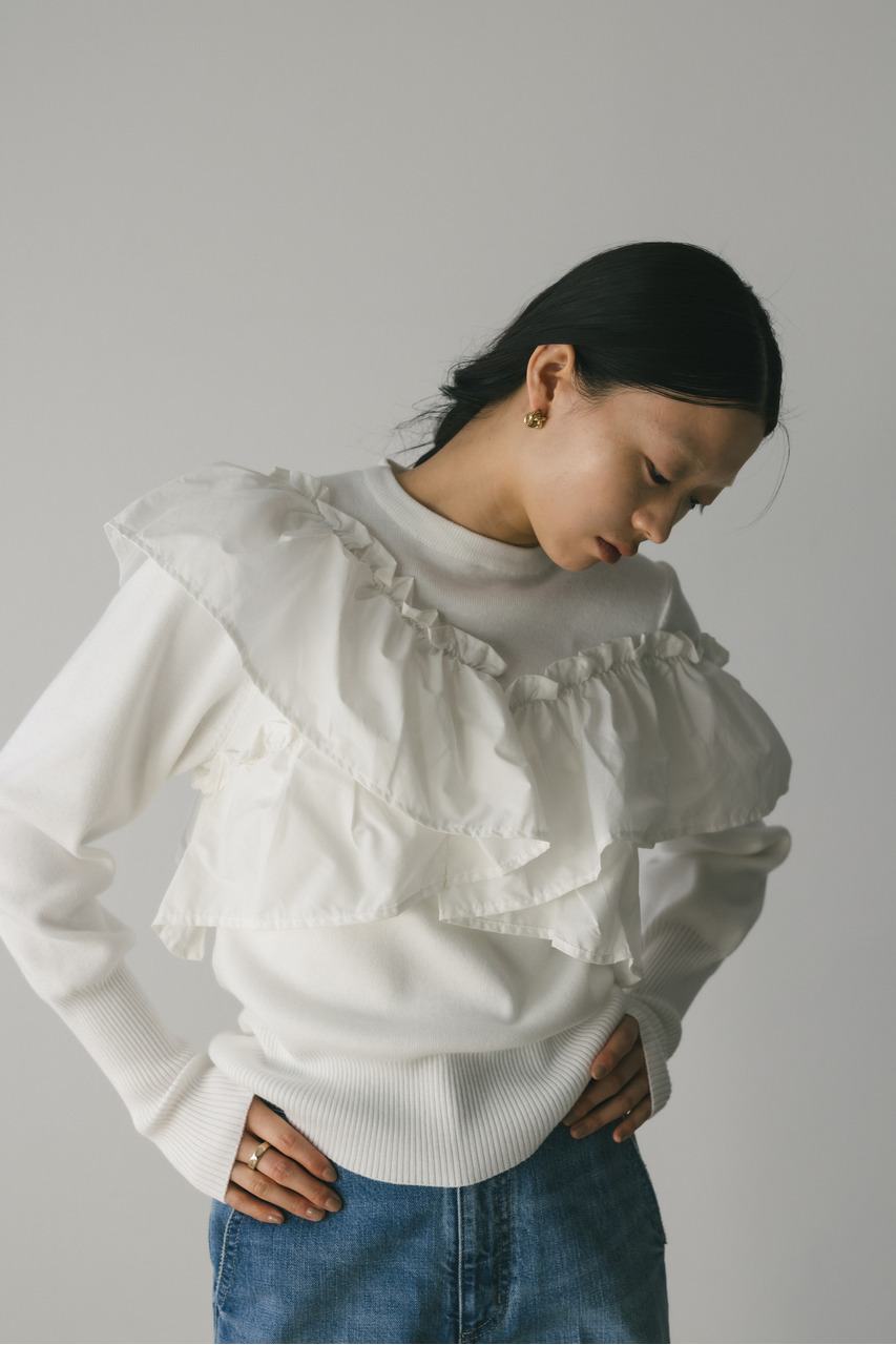 異素材のコンビネーションが華やかなフリルニットトップ。程よく張りのある布帛素材のフリルがモードな印象に導きます。インでもアウトでも着れるサイズ感がポイント。透け感なし、ストレッチあり。