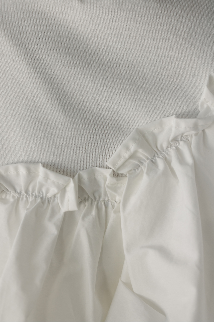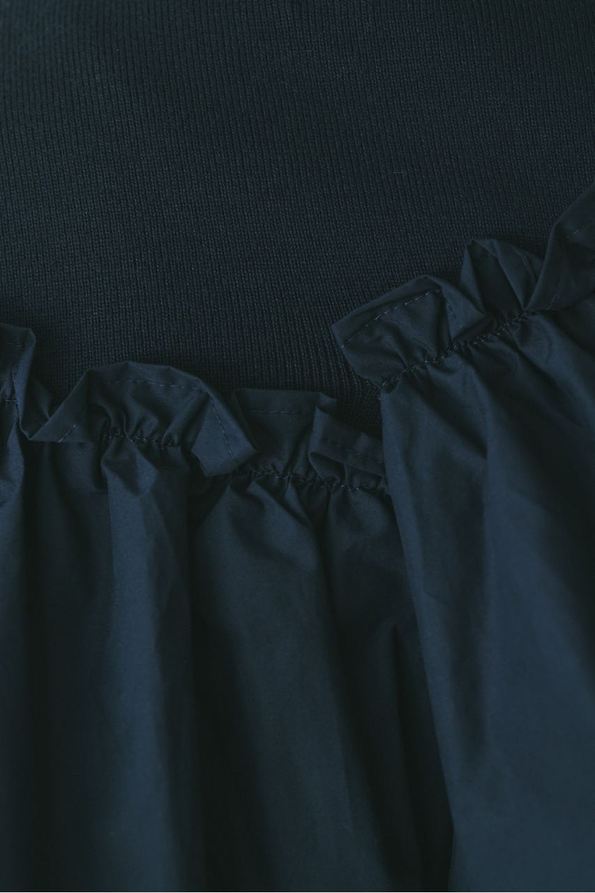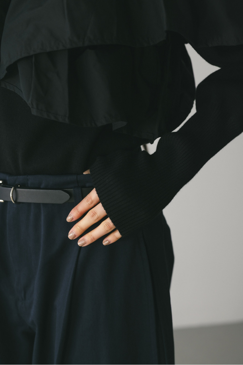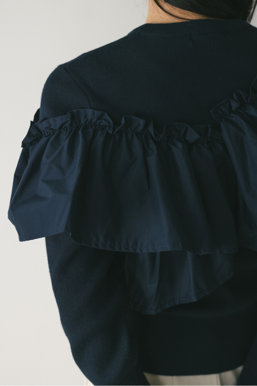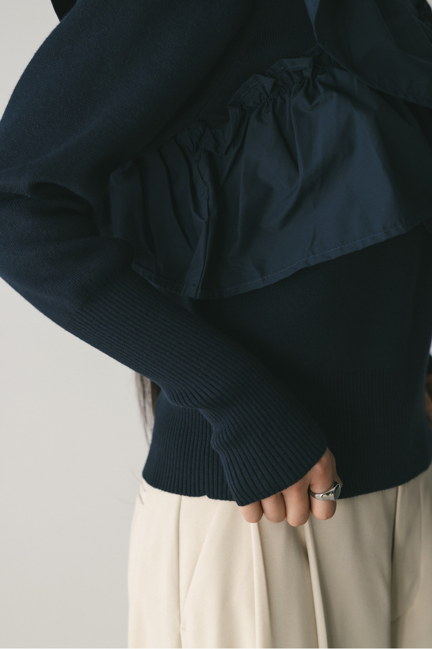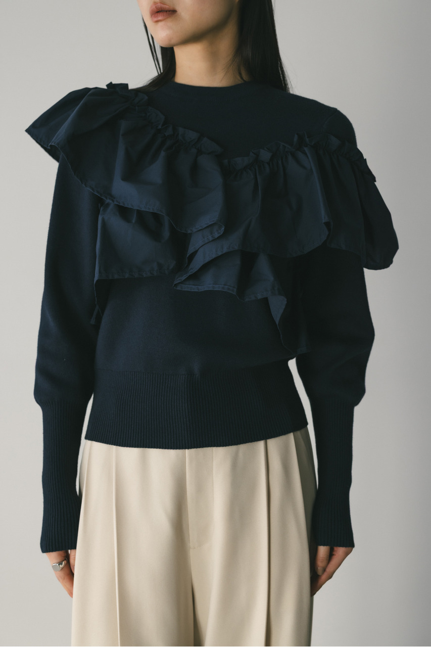 異素材のコンビネーションが華やかなフリルニットトップ。程よく張りのある布帛素材のフリルがモードな印象に導きます。インでもアウトでも着れるサイズ感がポイント。透け感なし、ストレッチあり。
