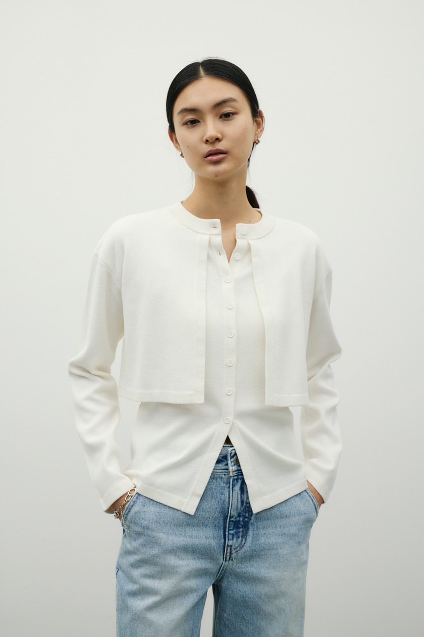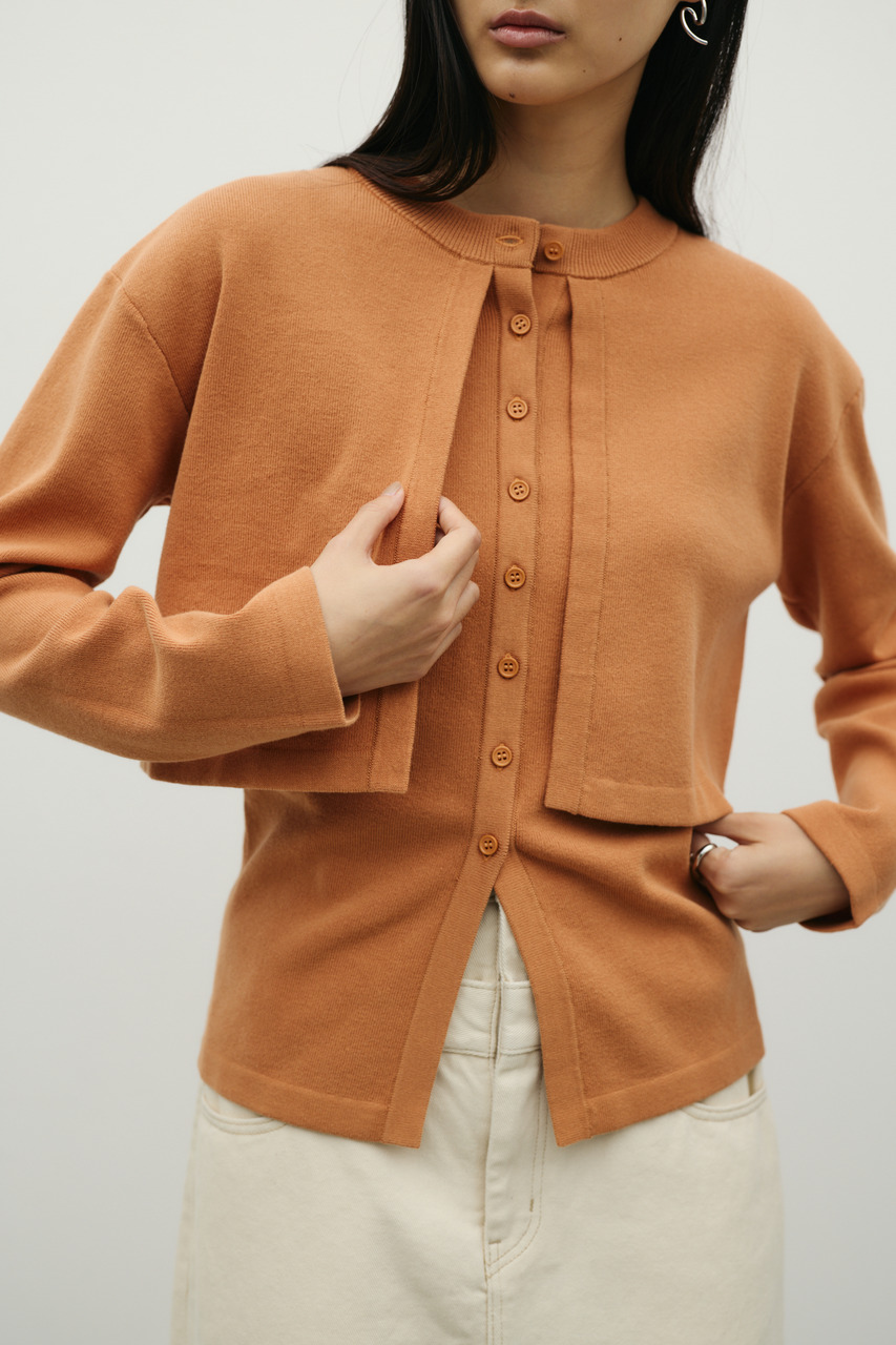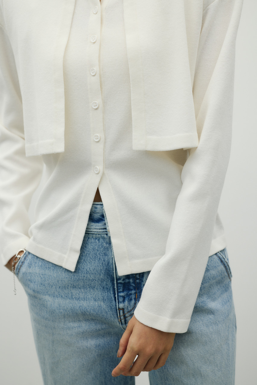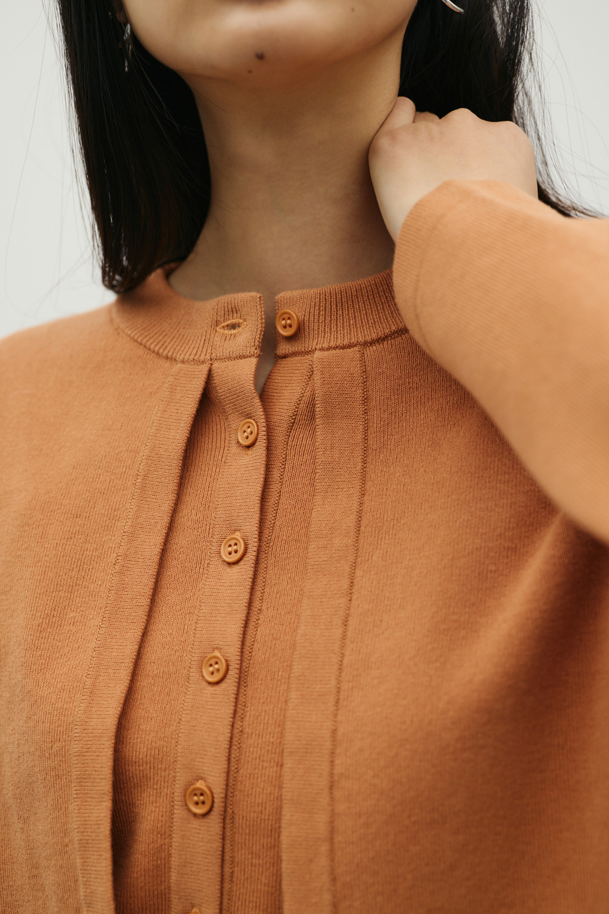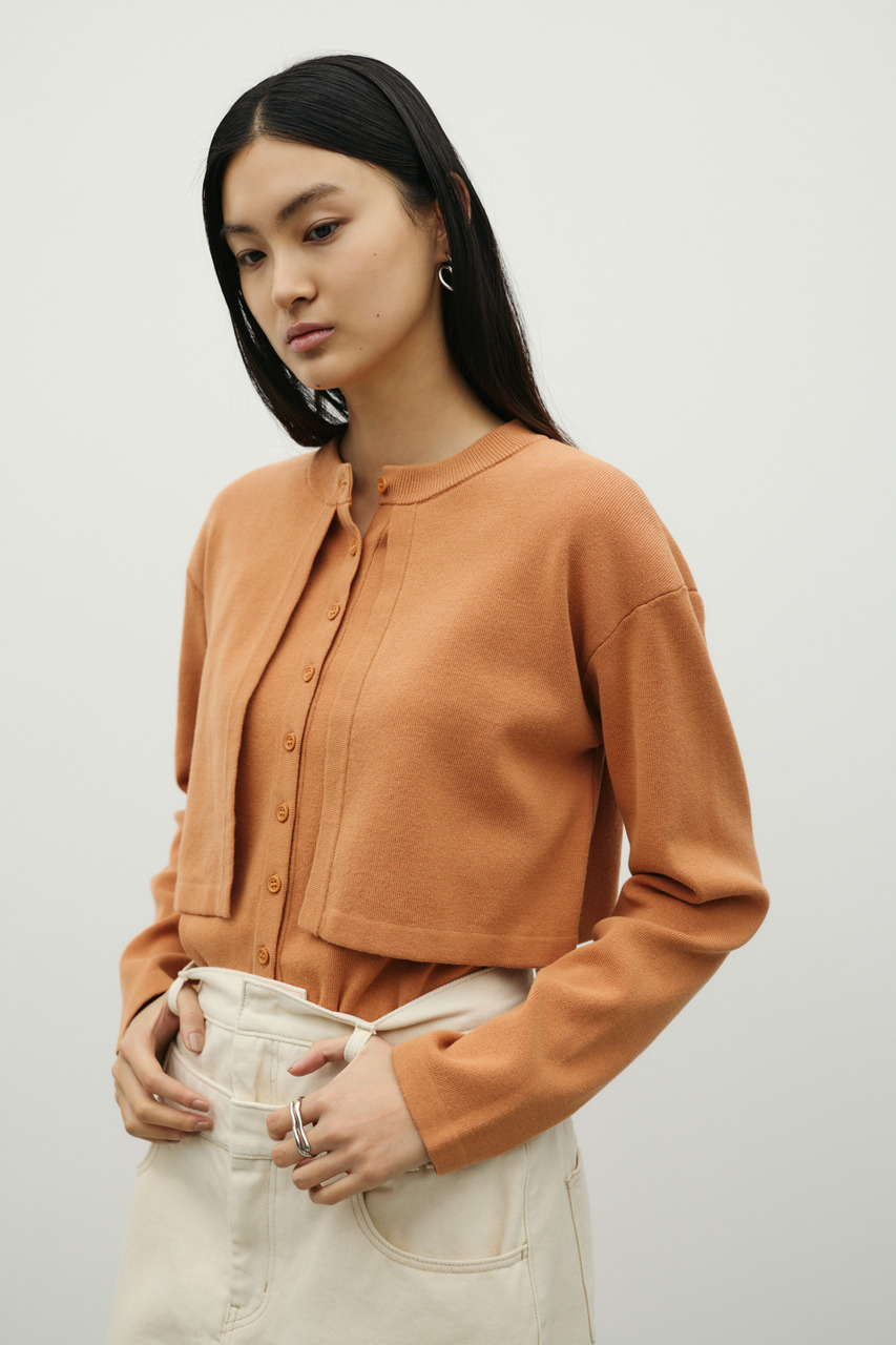重ね着しているようなデザインが魅力のレイヤード風ニットカーディガン。1枚でコーディネートが完成し、簡単にこなれた印象を演出します。やわらかなニット素材で着心地が良く、季節の変わり目にも活躍。パンツにもスカートにも合わせやすく、シーン問わず使える一枚です。透け感なし、ストレッチあり。