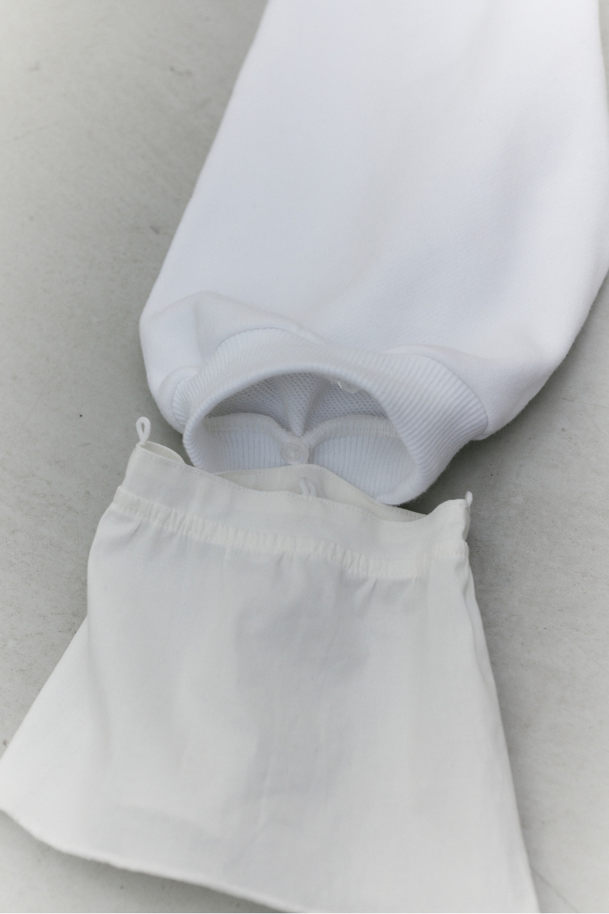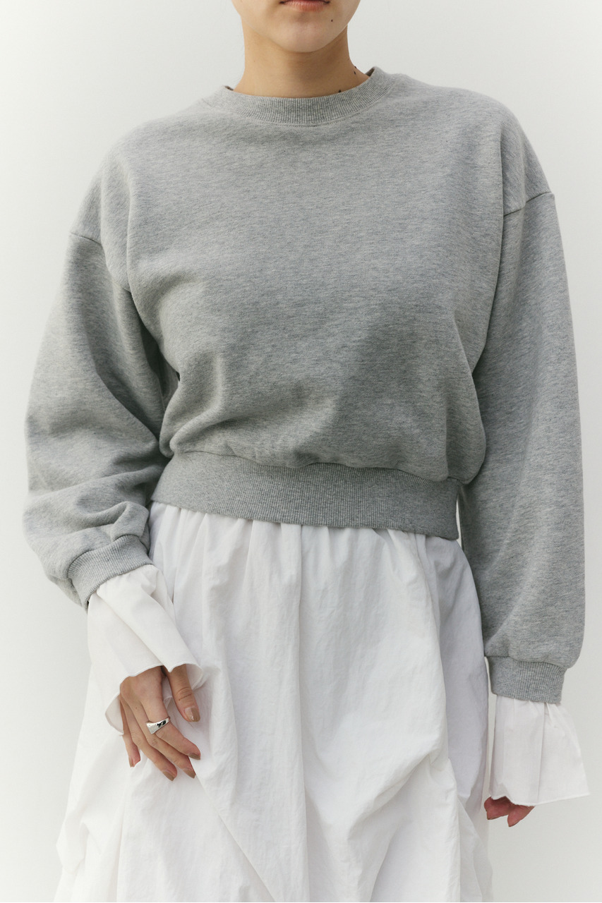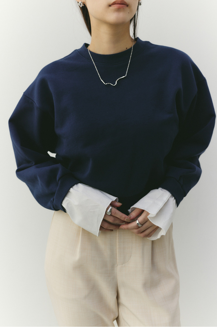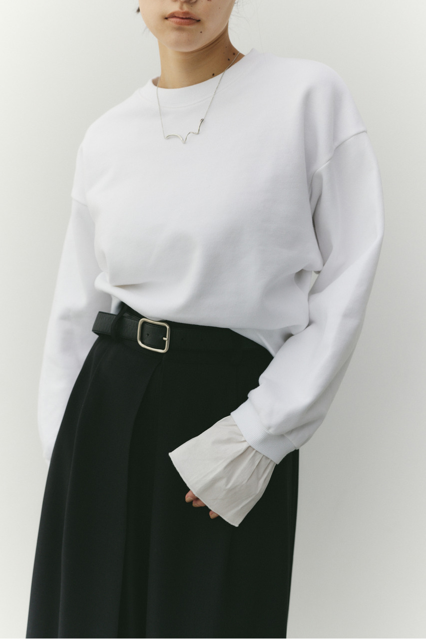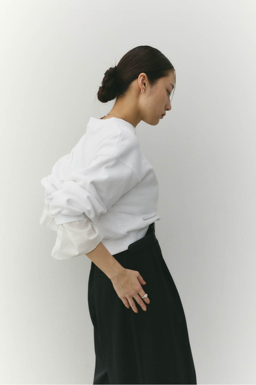 フリルデザインのカフスが女性らしさを引き立てるスウェットトップ。カフスは取り外し可能な仕様で、気分やシーンに合わせて印象を変えられます。カフスを外せばシンプルなスウェットとして着用でき、デイリー使いにも最適。程よい厚みのスウェット素材で着心地が良く、カジュアルながらも華やかさのある一枚です。透け感なし、ストレッチあり。