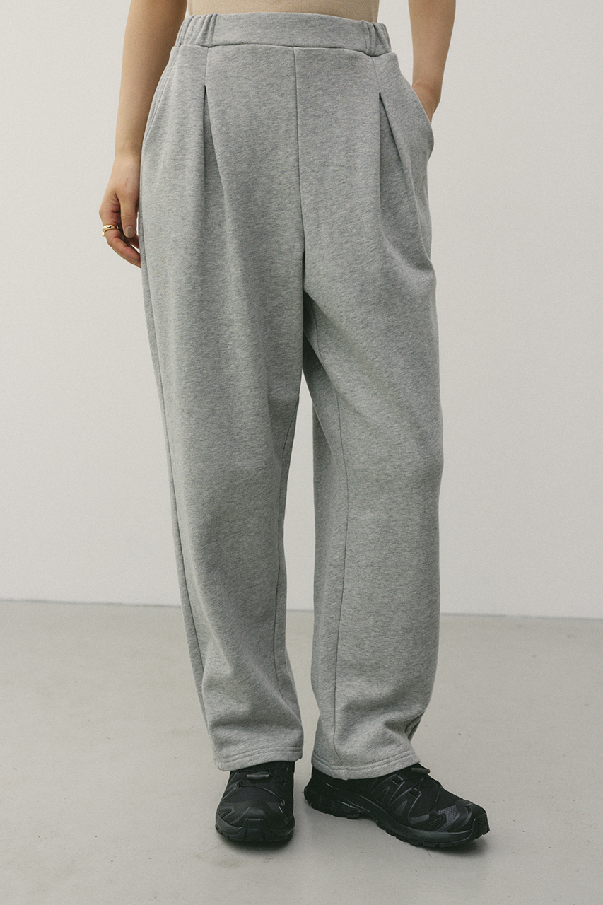 タックデザインとバレルシルエットが特徴のスウェットパンツ。腰まわりに程よいゆとりを持たせつつ、立体感のあるフォルムでトレンドライクな着こなしを演出します。やわらかなスウェット素材を使用したリラックス感のある履き心地も魅力。シンプルなトップスと合わせるだけで、こなれたカジュアルスタイルが完成する一枚です。透け感なし、ストレッチあり。