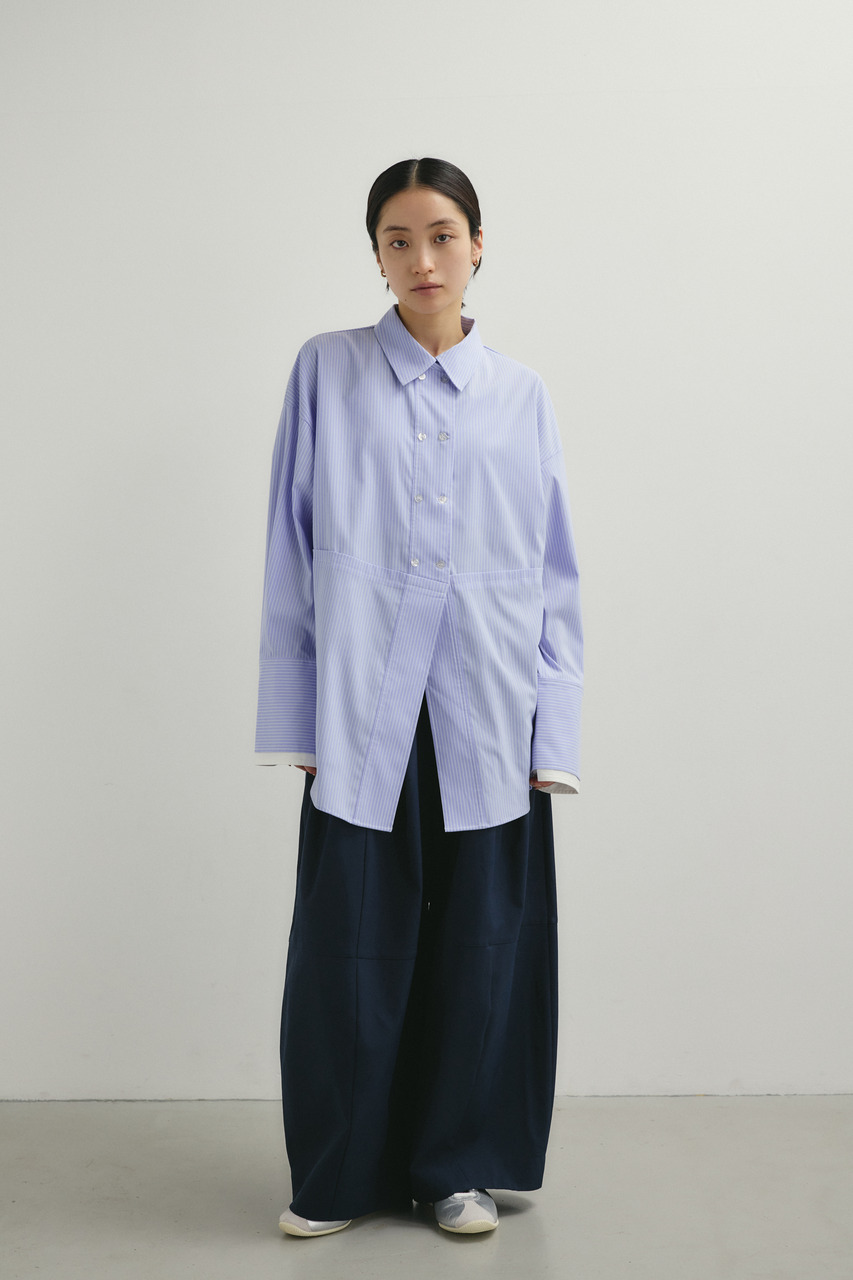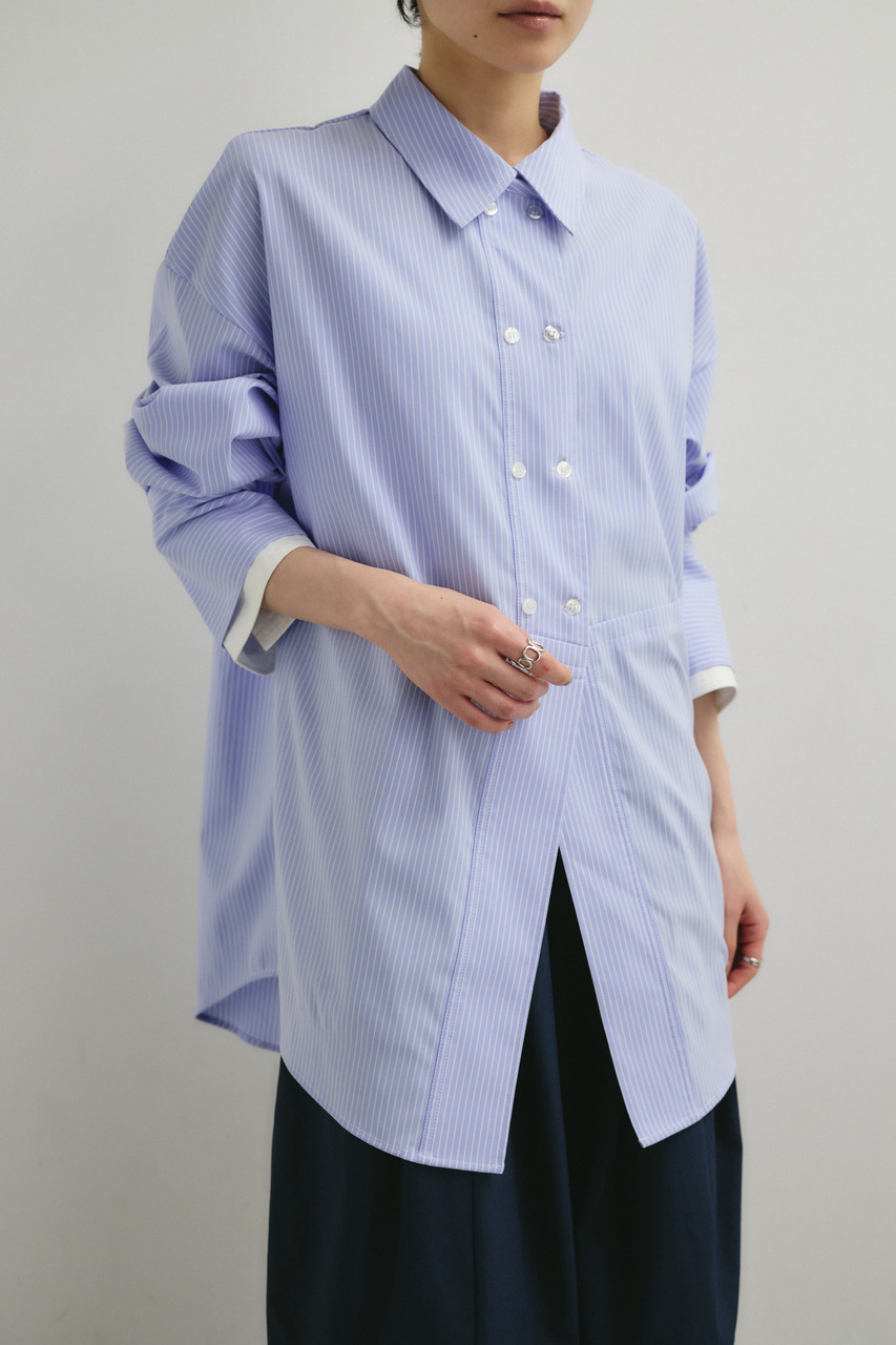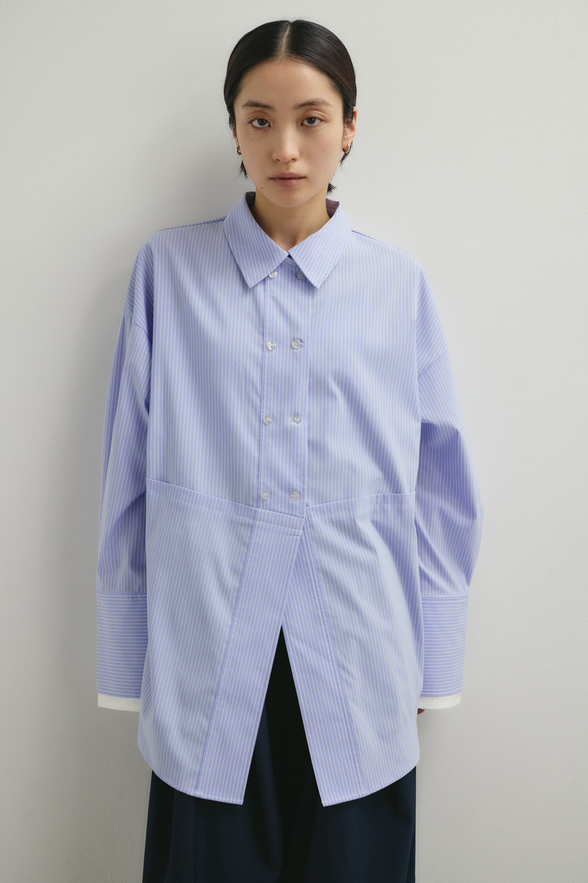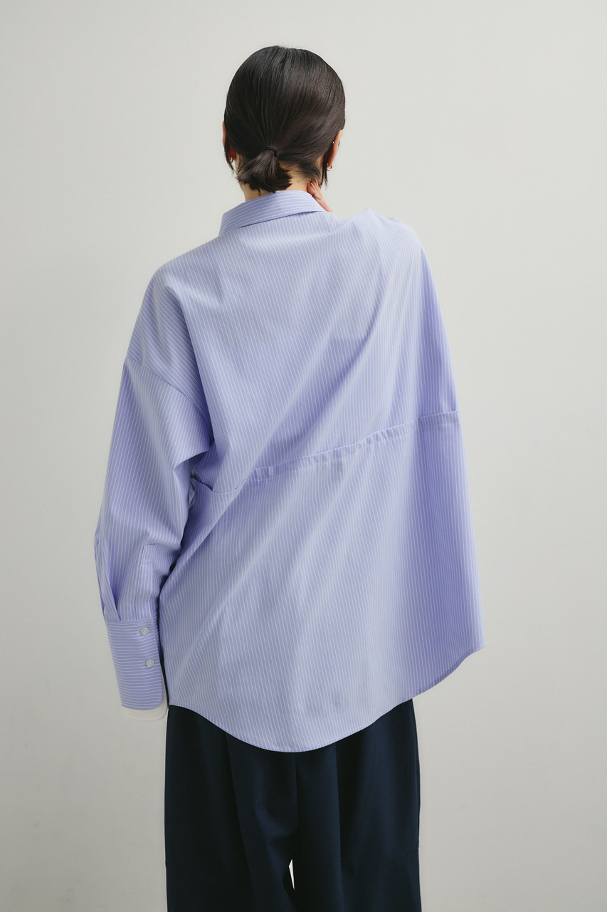 裾広がりのデザインが、一枚で雰囲気が出るオーバーサイズシャツ。ボックスシルエットがモードな印象に導きます。袖口の配色レイヤードデザインがポイント。アウターの中に入れて裾を出すなどレイヤードスタイリングが幅広く楽しめる一枚です。ストレッチなし、透け感WHTややあり。