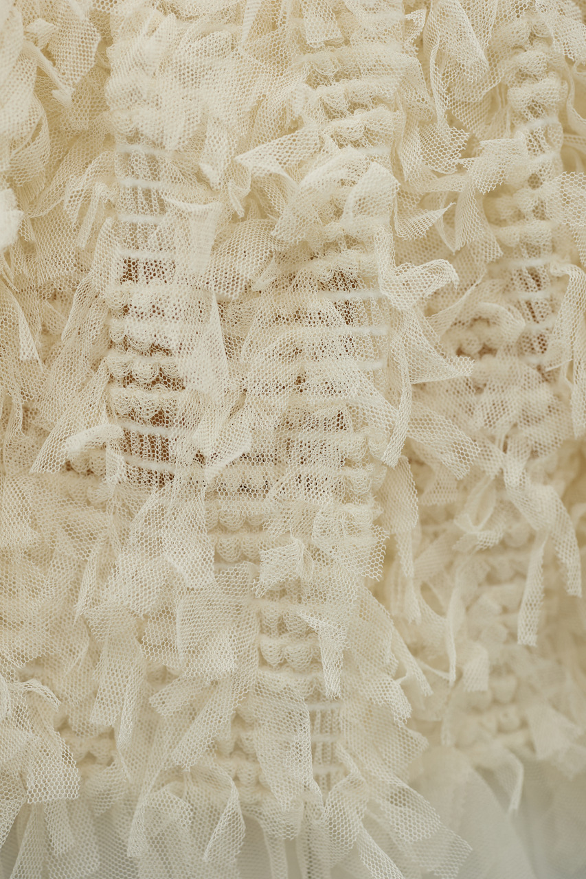 フリル素材で仕上げた動きが可愛いチュールキャミソール。トップスやワンピースに重ねるだけで一気にこなれ感を演出。短すぎない丈感で、幅広くスタイリングに使いやすいサイズになっています。フロントは緩やかなVネックなのでキャミソール一枚で着る際も程よい抜け感が出ます。ストレッチなし、透け感あり。