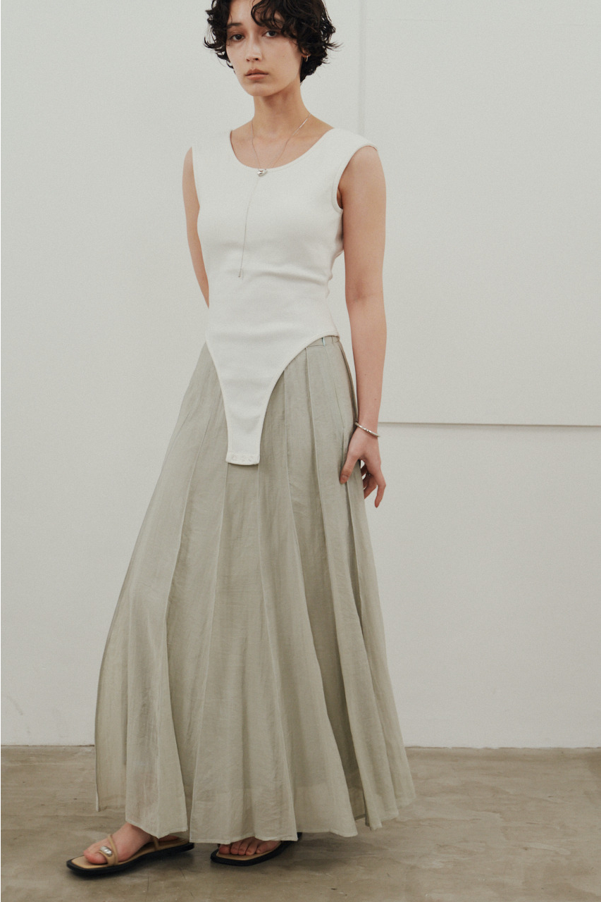 表情感のあるシアー素材を裾にかけてピンタックパネルで広げた存在感のあるスカート。一枚でスタイリングに華やかさをプラス。バックゴム仕様なので楽に着用頂けます。透け感あり(裏地付き)、ストレッチなし。