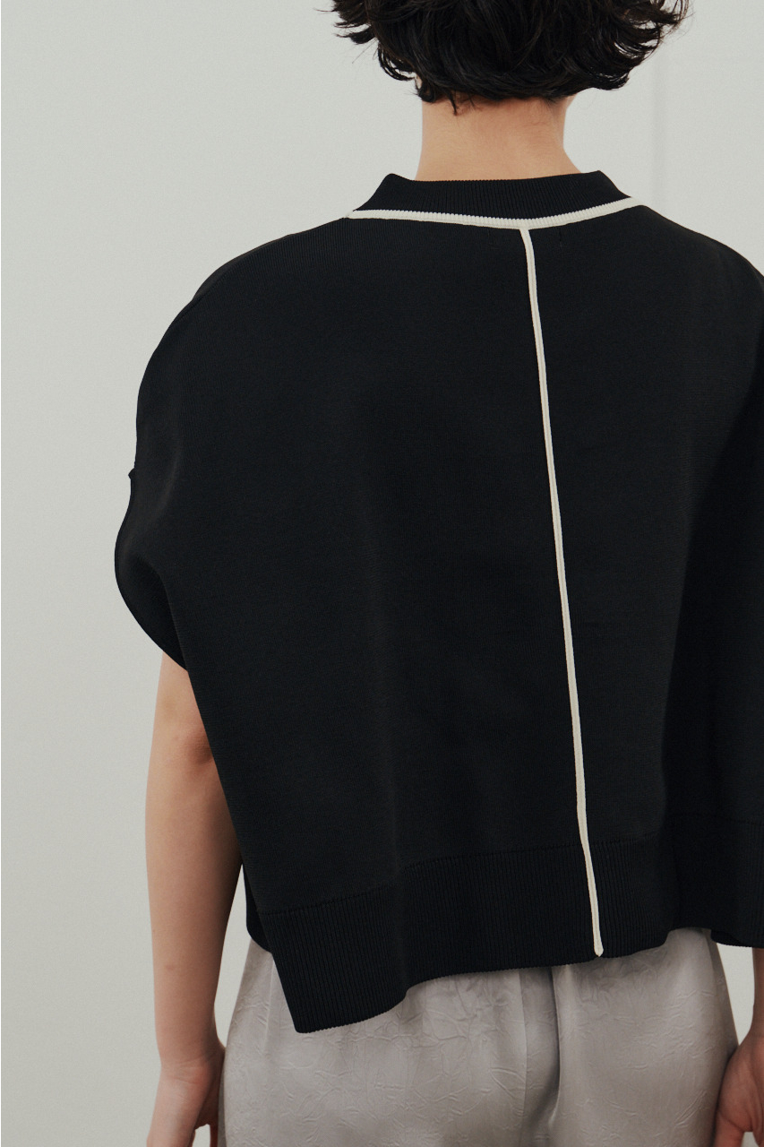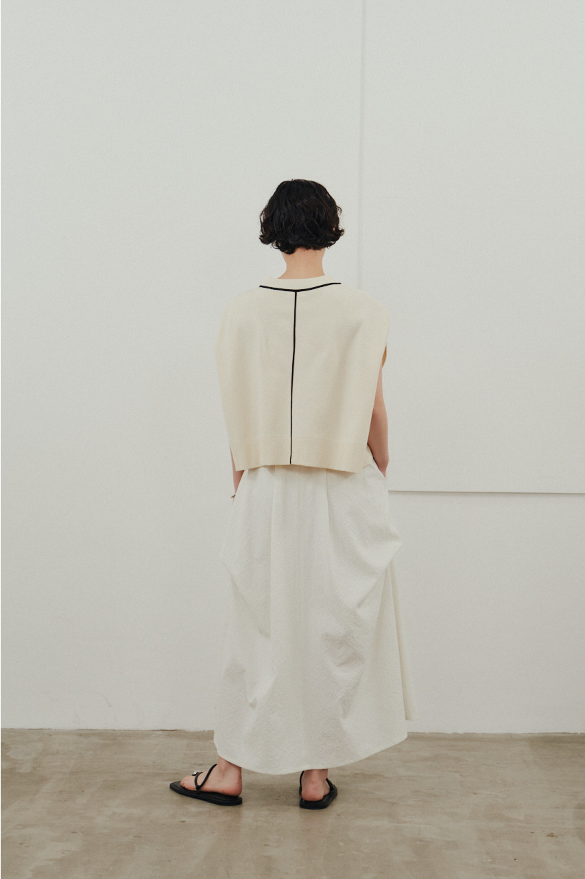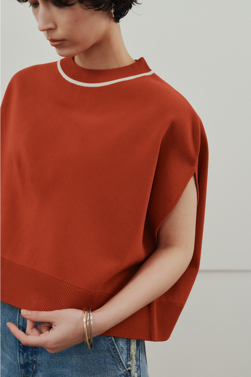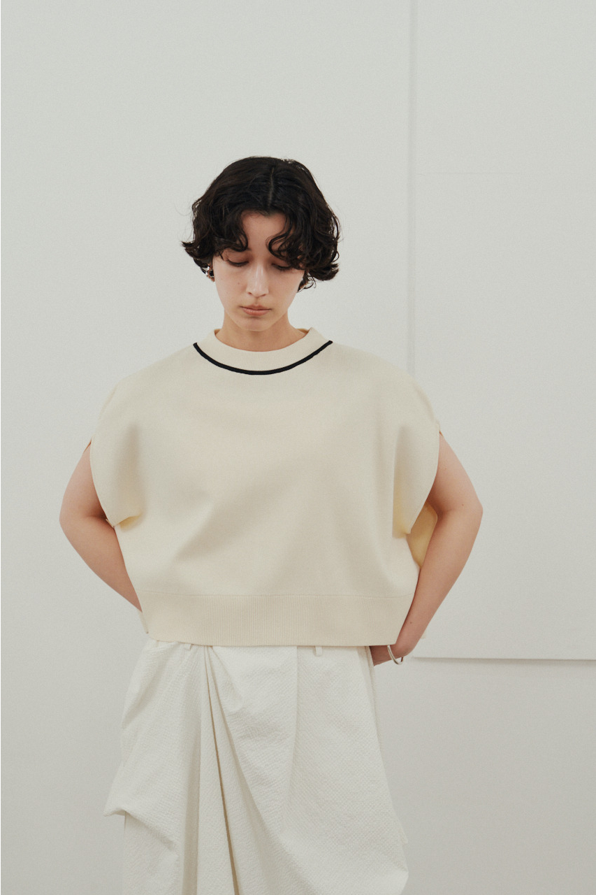 程よく張りのある素材で軽やかに着用できるニットトップス。配色のパイピングデザインがシンプルながらもモードな印象に導いてくれます。肩をあえて落としたノースリーブとゆったりしたサイズ感で、自然に体型カバーが叶います。バランスのとりやすい丈感なのでボトムを選ばず幅広いスタイリングが楽しめる一枚です。透け感なし。ストレッチあり。