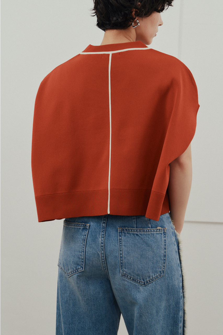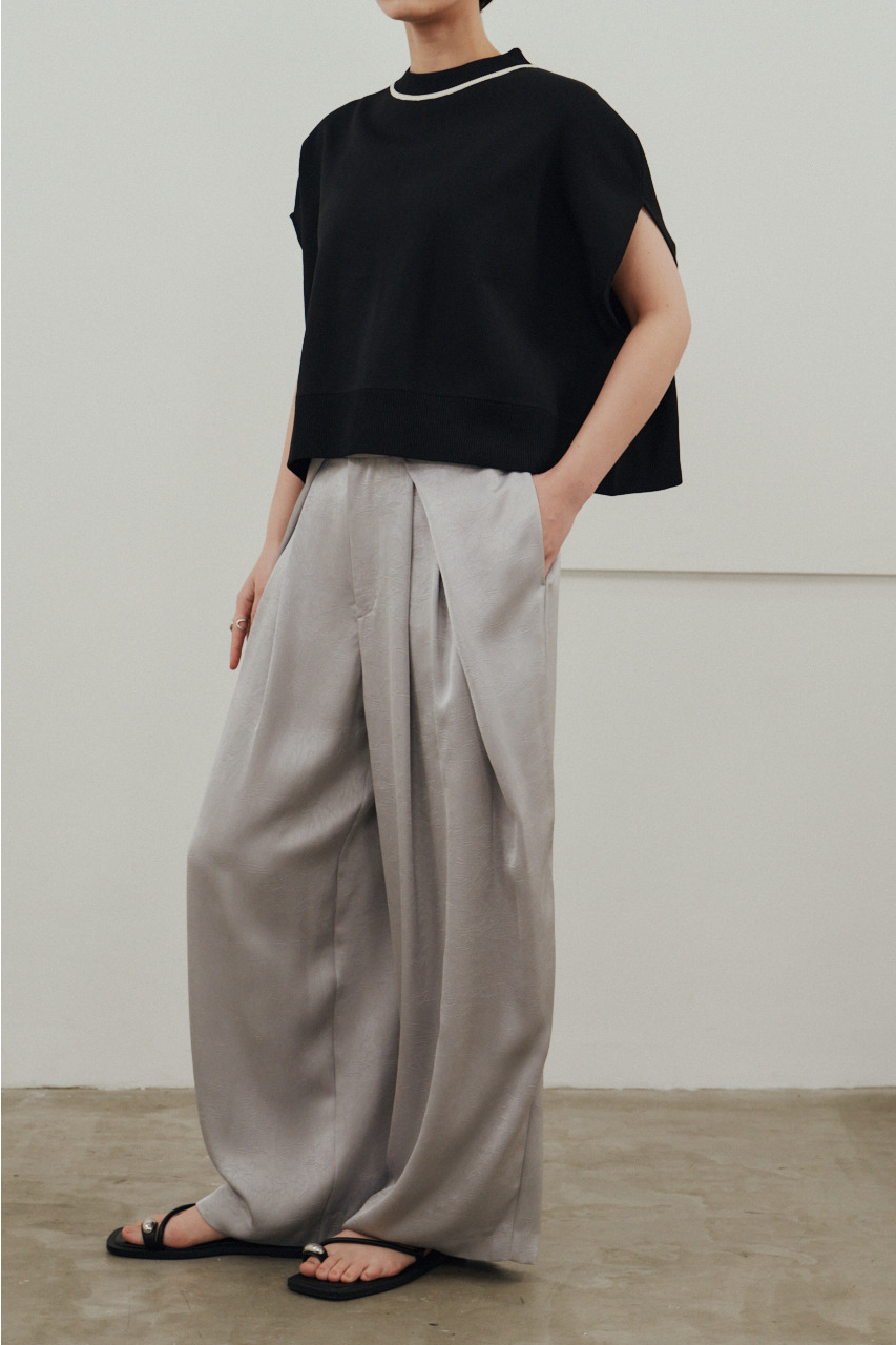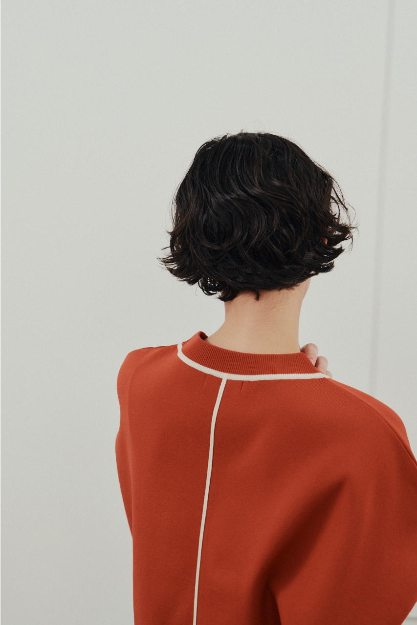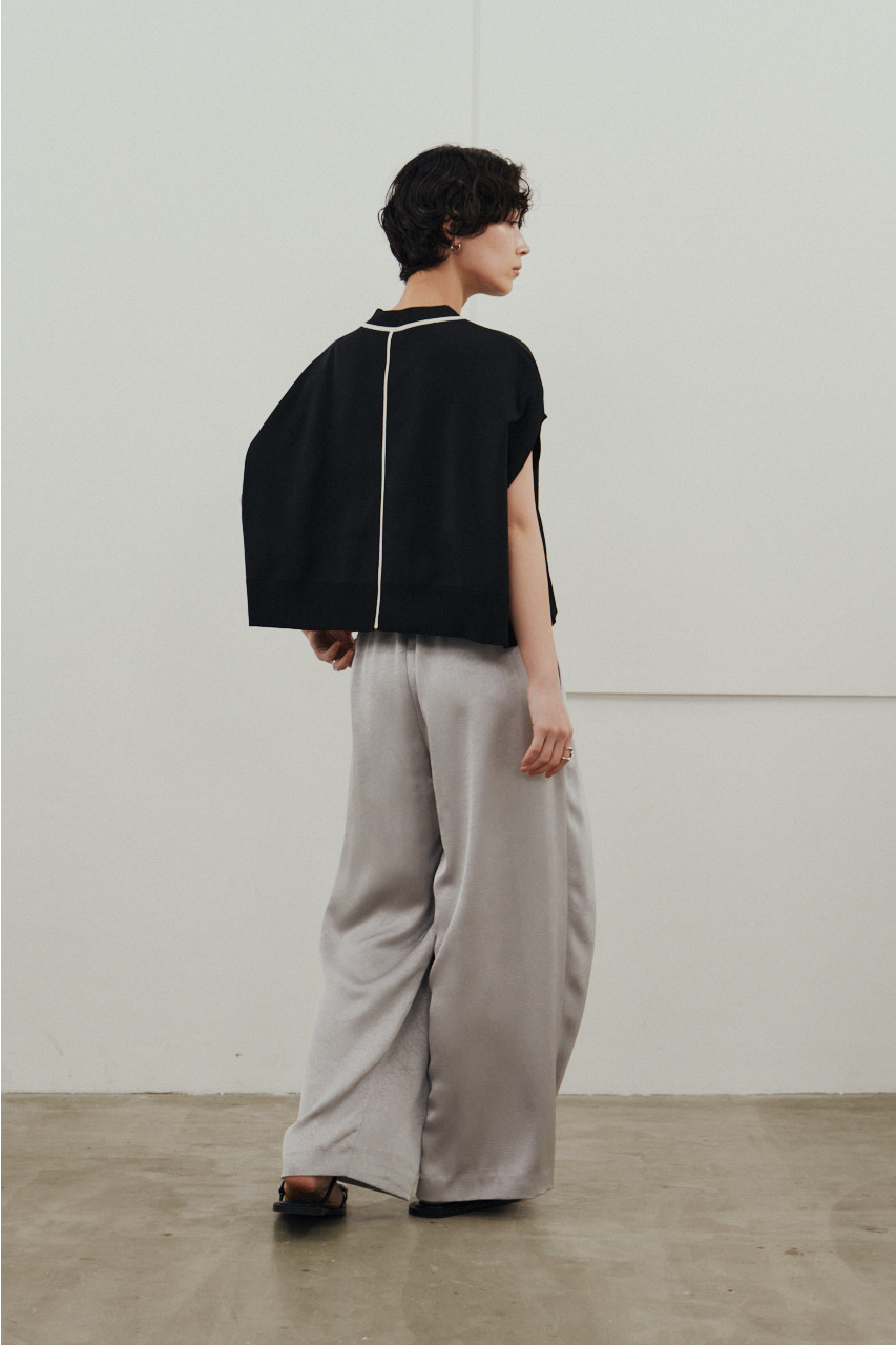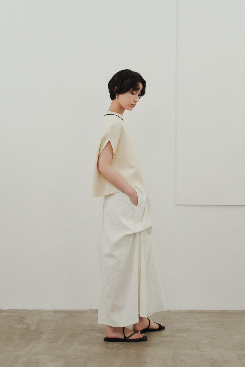 程よく張りのある素材で軽やかに着用できるニットトップス。配色のパイピングデザインがシンプルながらもモードな印象に導いてくれます。肩をあえて落としたノースリーブとゆったりしたサイズ感で、自然に体型カバーが叶います。バランスのとりやすい丈感なのでボトムを選ばず幅広いスタイリングが楽しめる一枚です。透け感なし。ストレッチあり。