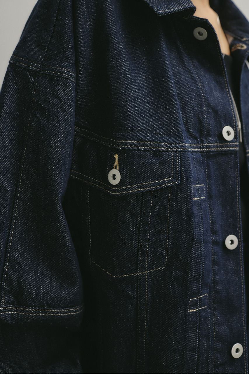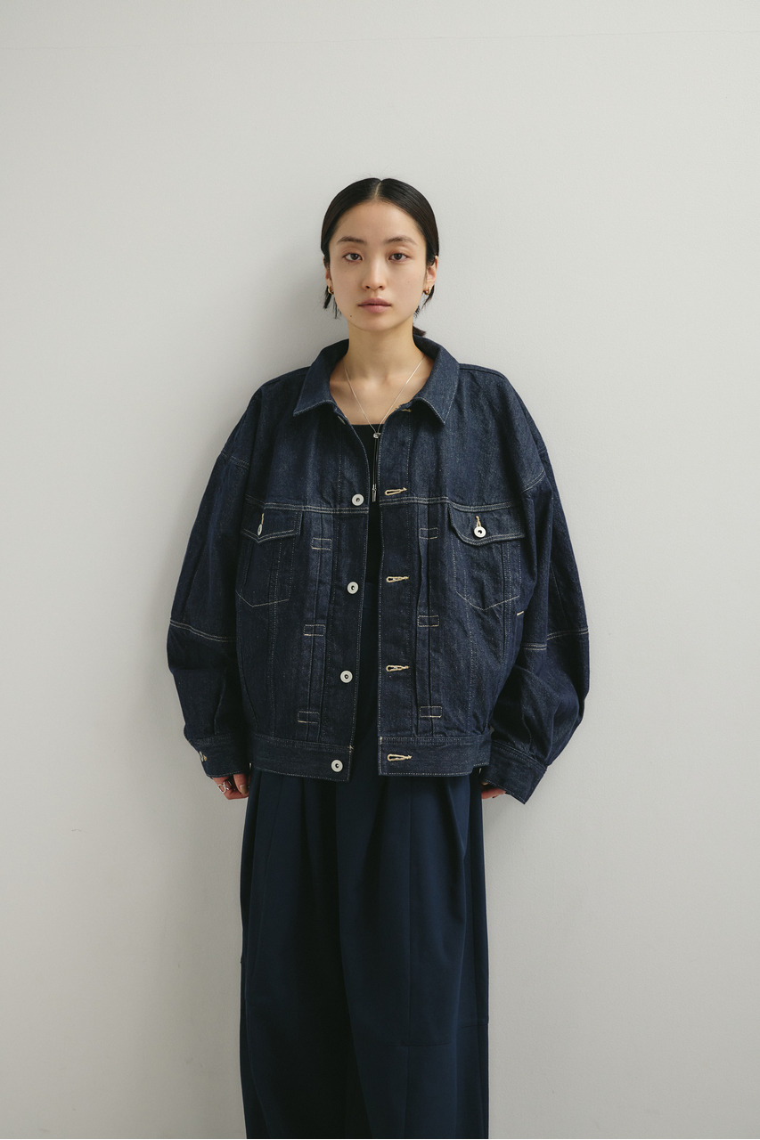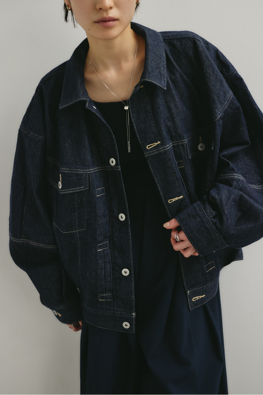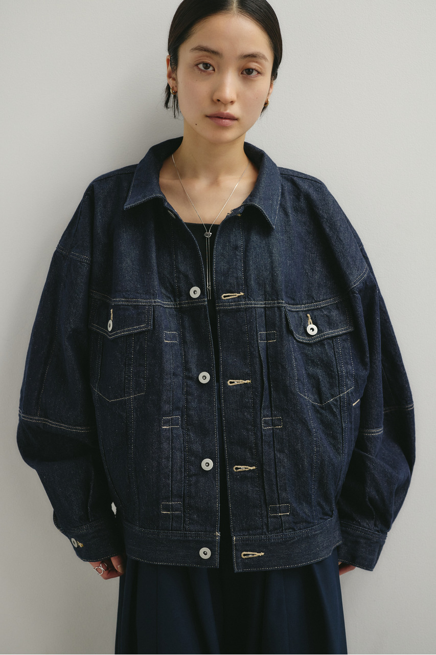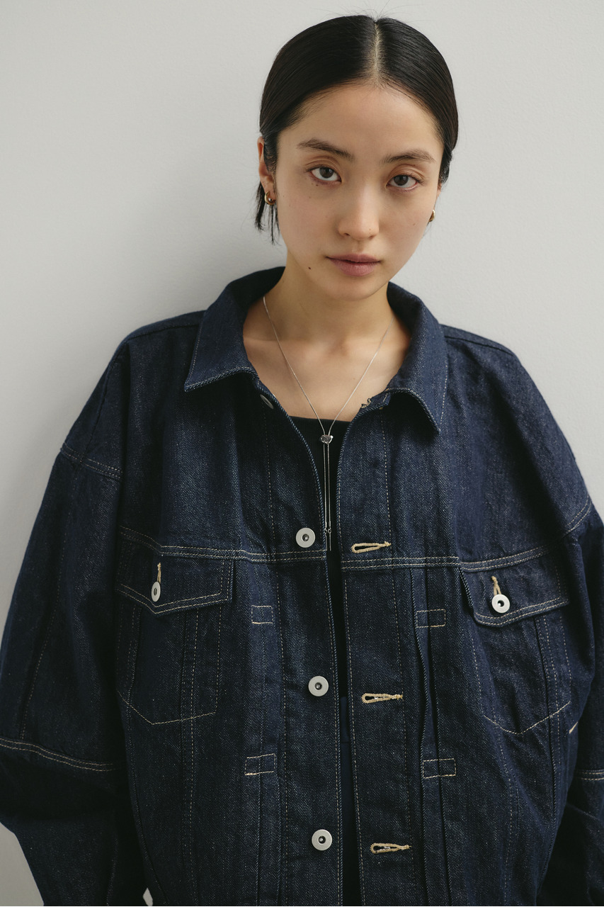 オーバーサイズのゆったりとしたフォルムが特徴的なデニムジャケット。ゆったりとしながらも構築的なシルエットで、着るだけで様になる一枚。500JSR11-0901(ダブルウエストデニムスカート)とセットアップ着用可能。透け感なし、ストレッチなし。