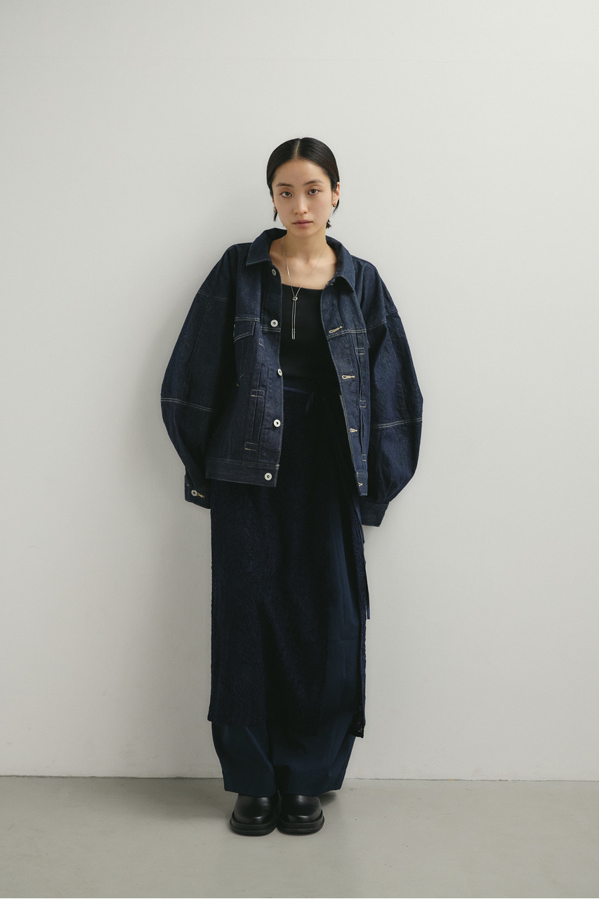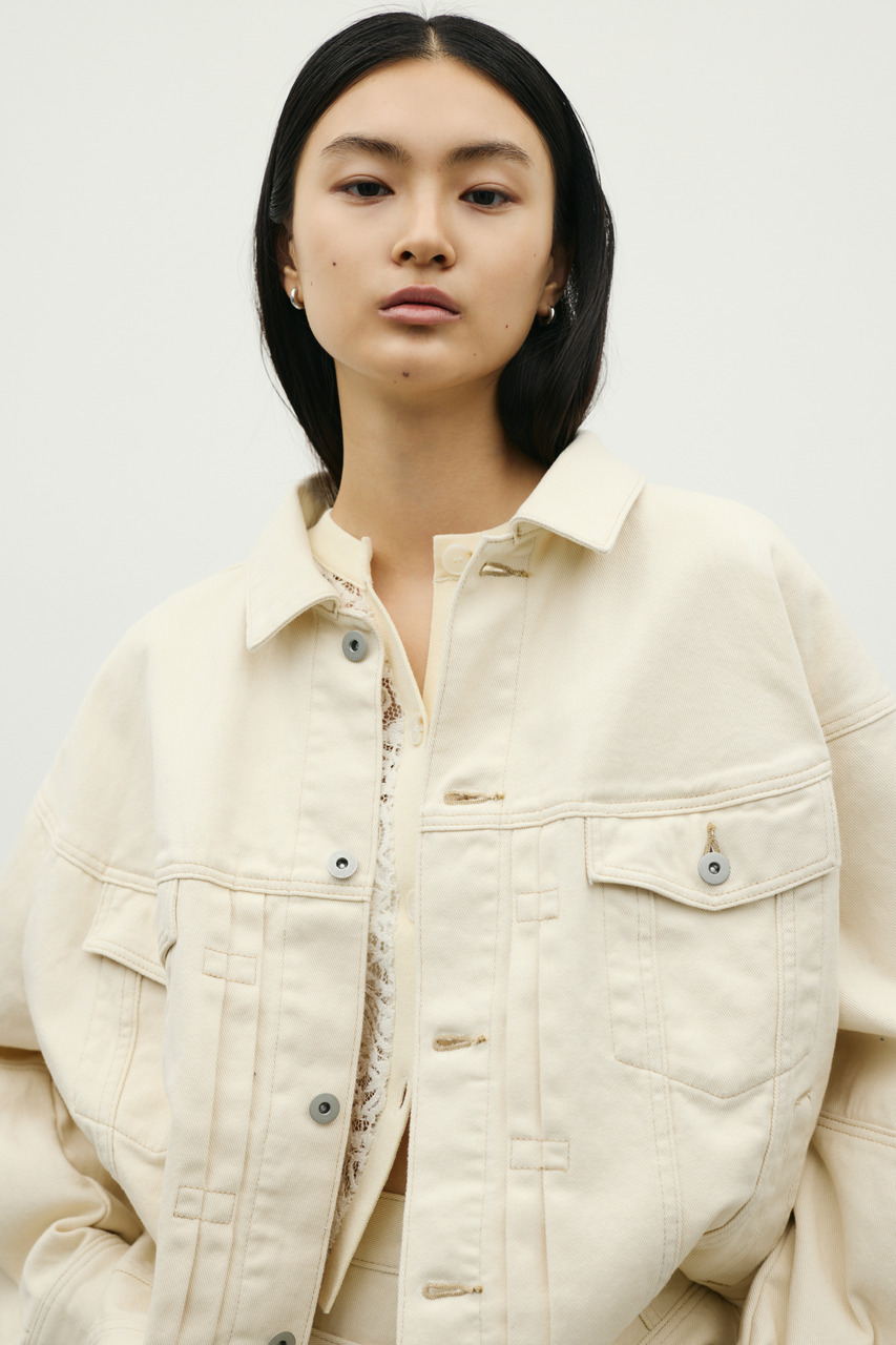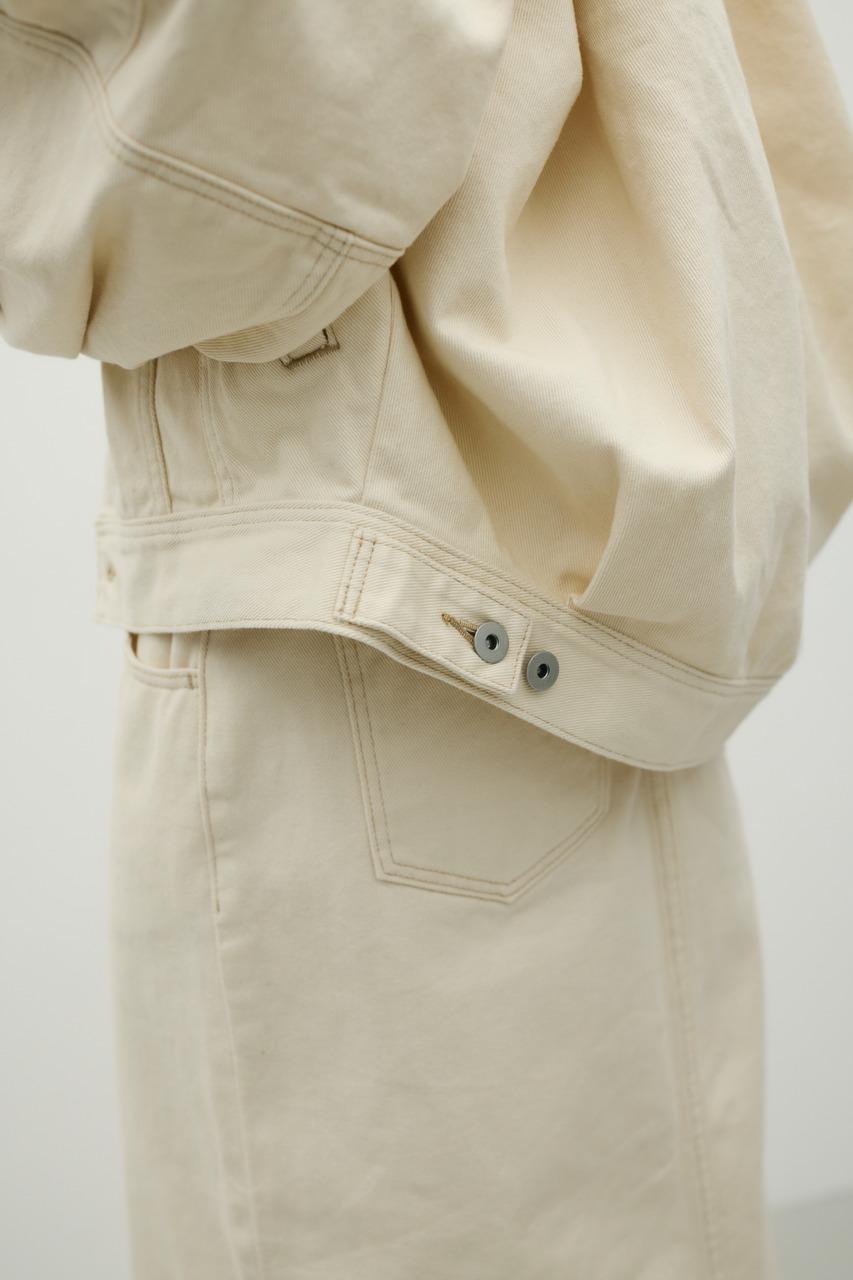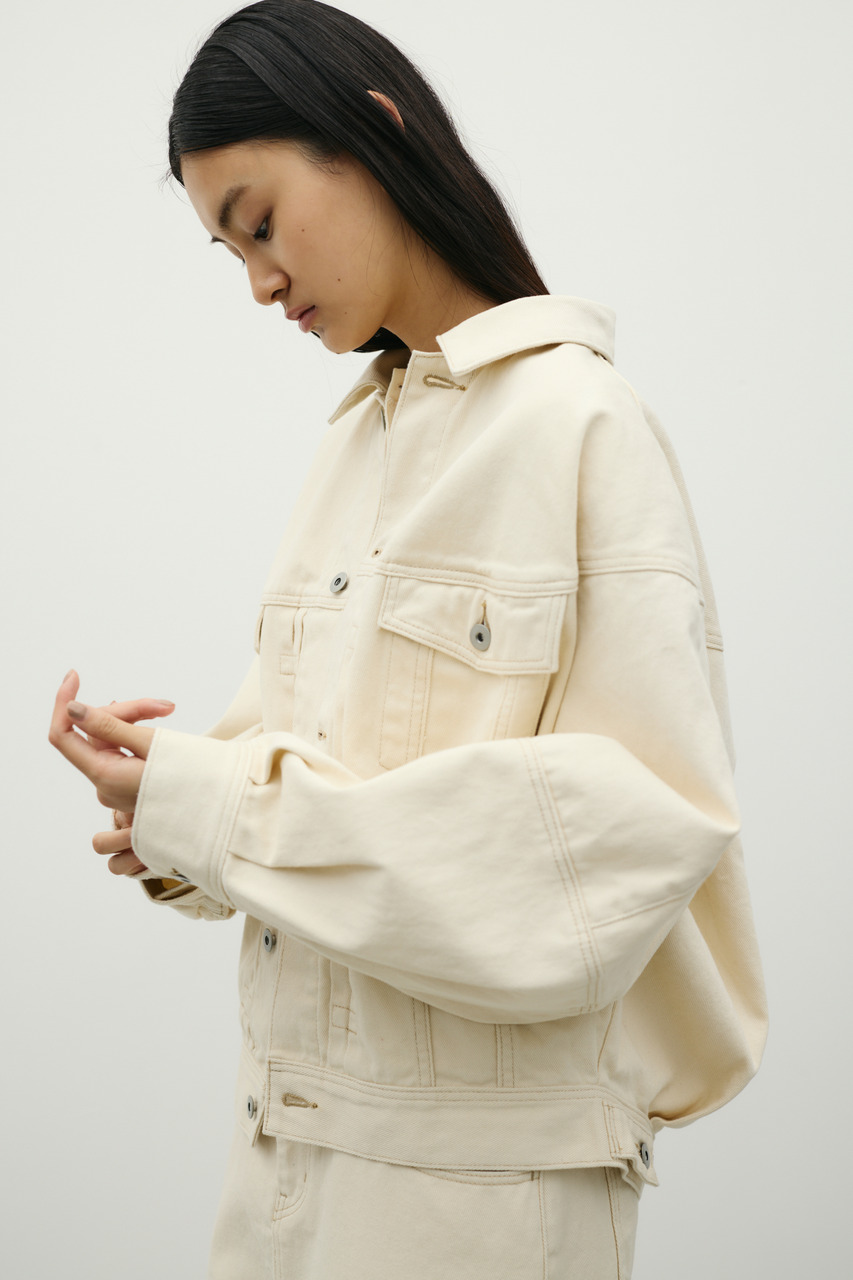 オーバーサイズのゆったりとしたフォルムが特徴的なデニムジャケット。ゆったりとしながらも構築的なシルエットで、着るだけで様になる一枚。500JSR11-0901(ダブルウエストデニムスカート)とセットアップ着用可能。透け感なし、ストレッチなし。