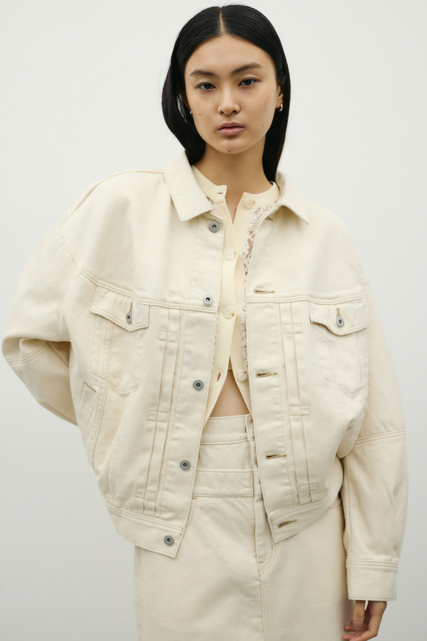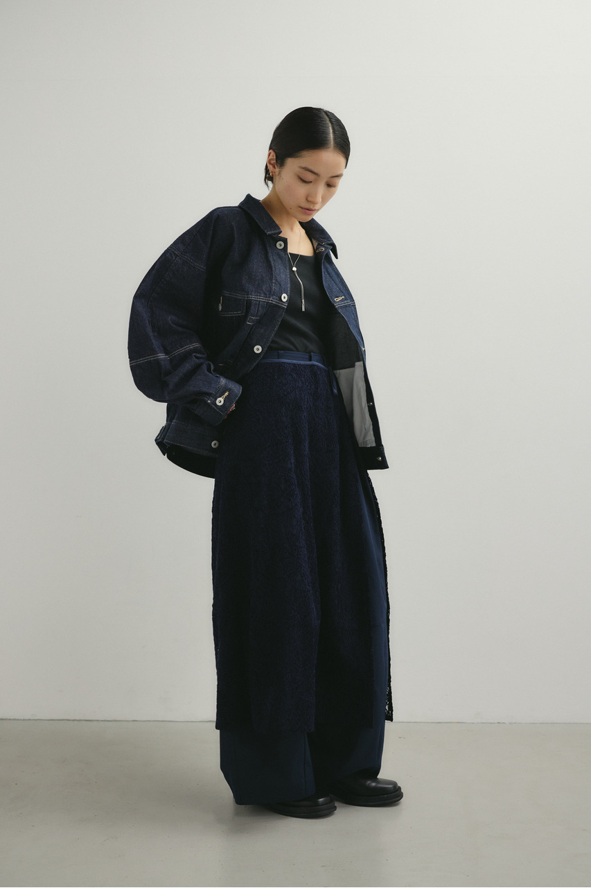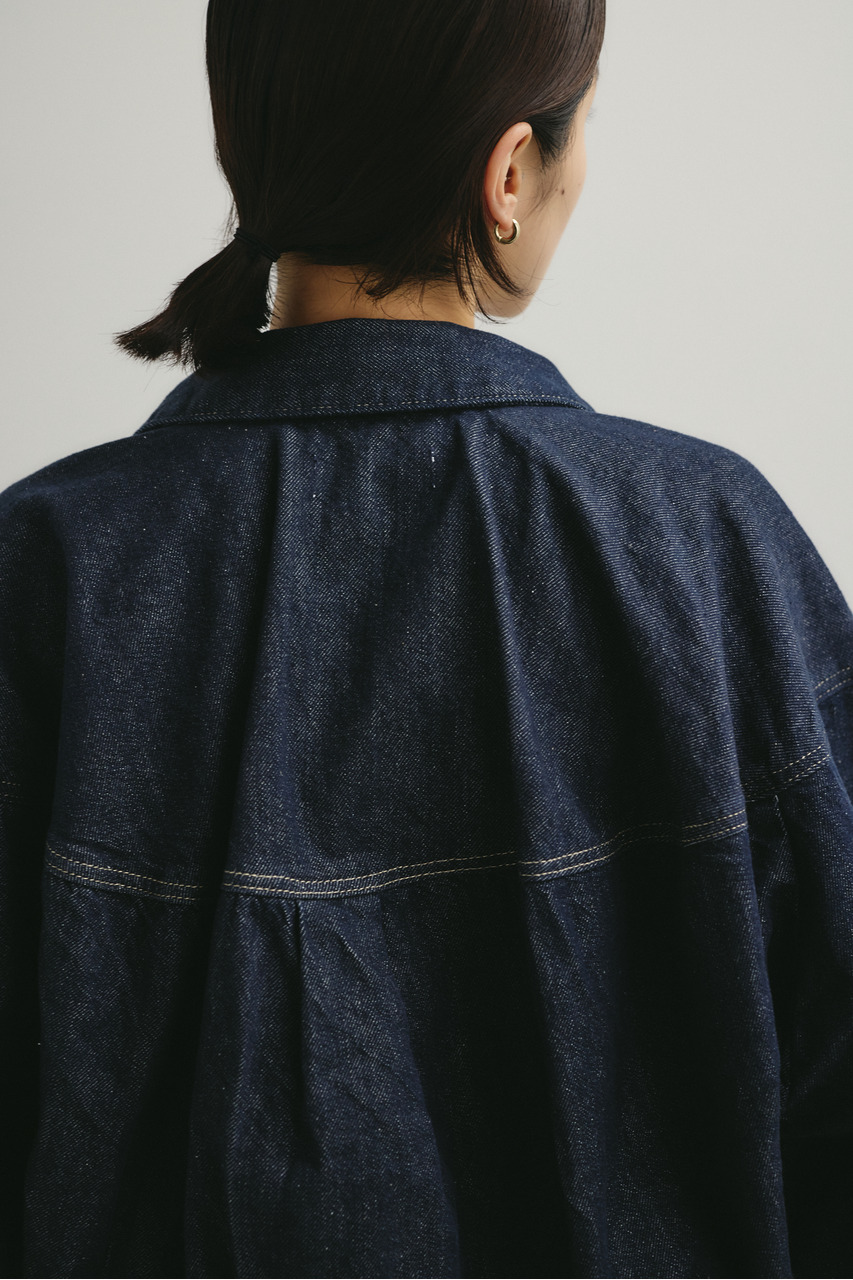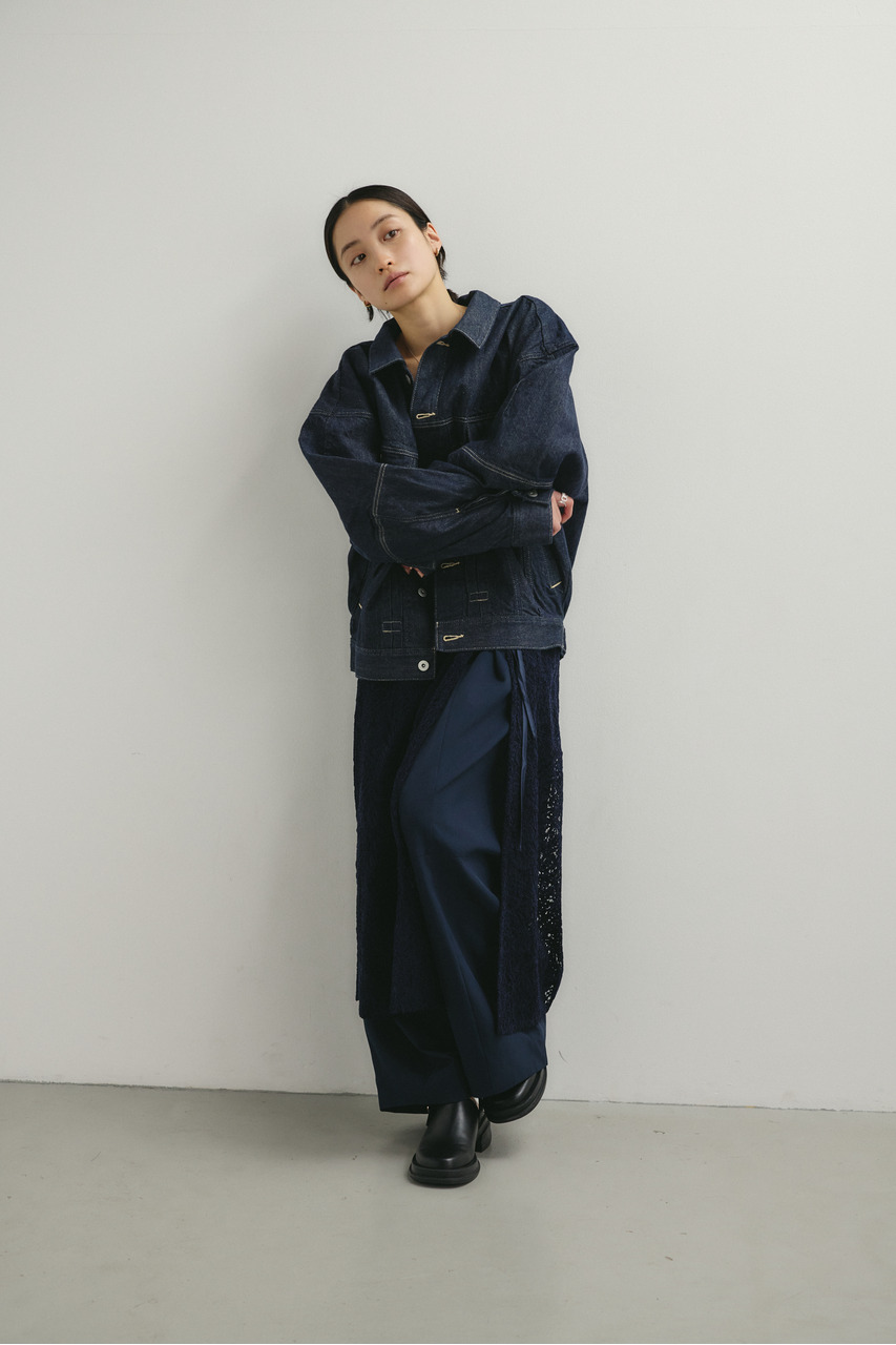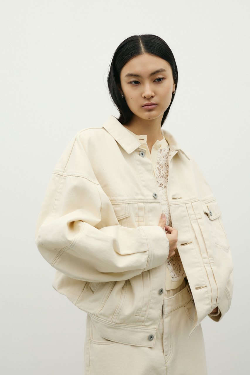 オーバーサイズのゆったりとしたフォルムが特徴的なデニムジャケット。ゆったりとしながらも構築的なシルエットで、着るだけで様になる一枚。500JSR11-0901(ダブルウエストデニムスカート)とセットアップ着用可能。透け感なし、ストレッチなし。