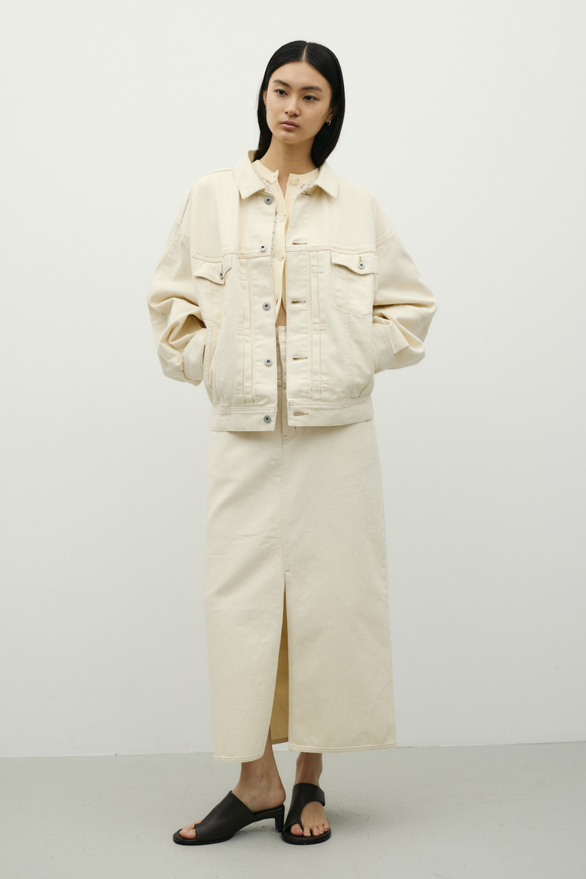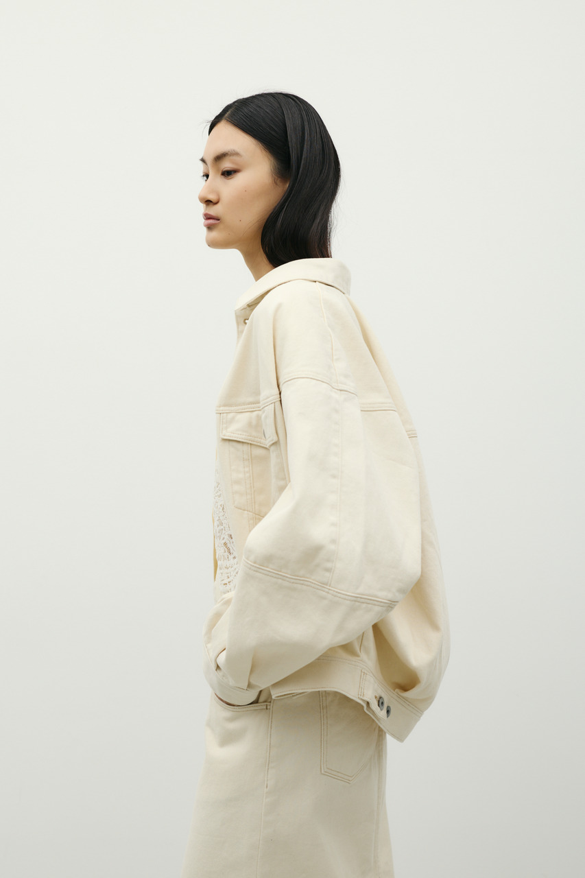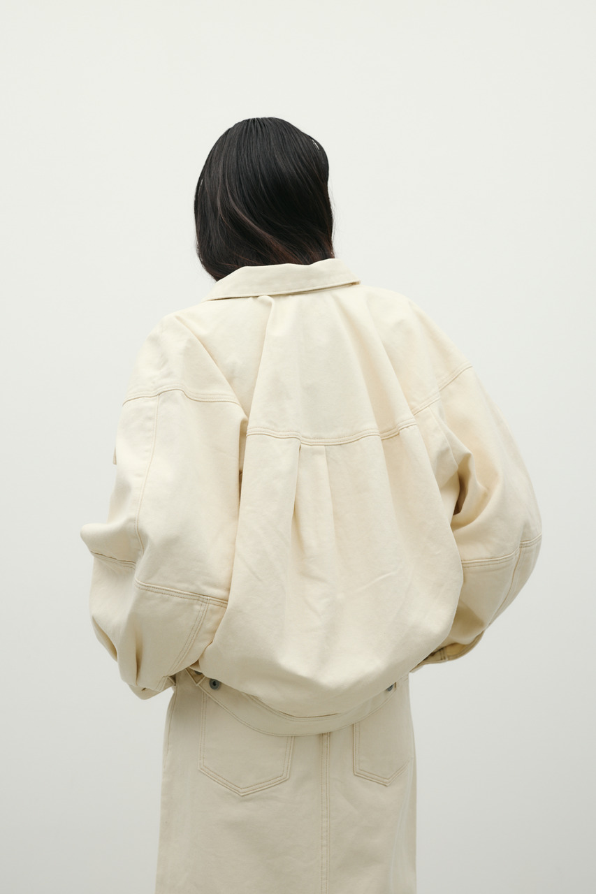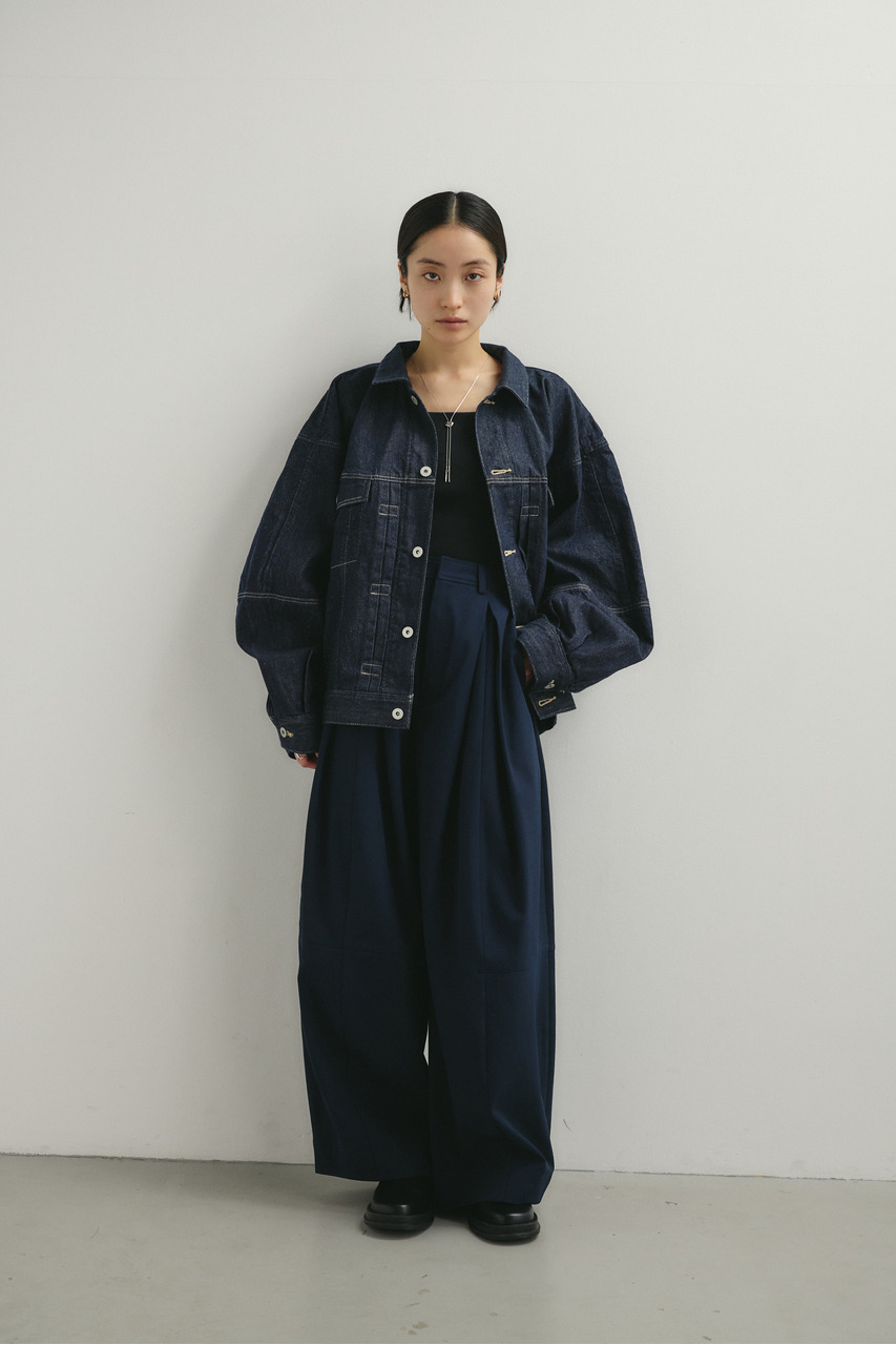 オーバーサイズのゆったりとしたフォルムが特徴的なデニムジャケット。ゆったりとしながらも構築的なシルエットで、着るだけで様になる一枚。500JSR11-0901(ダブルウエストデニムスカート)とセットアップ着用可能。透け感なし、ストレッチなし。