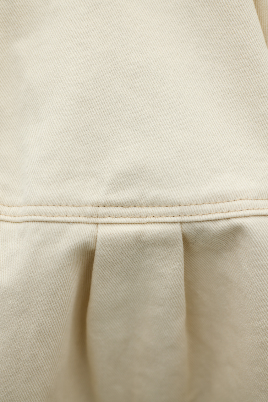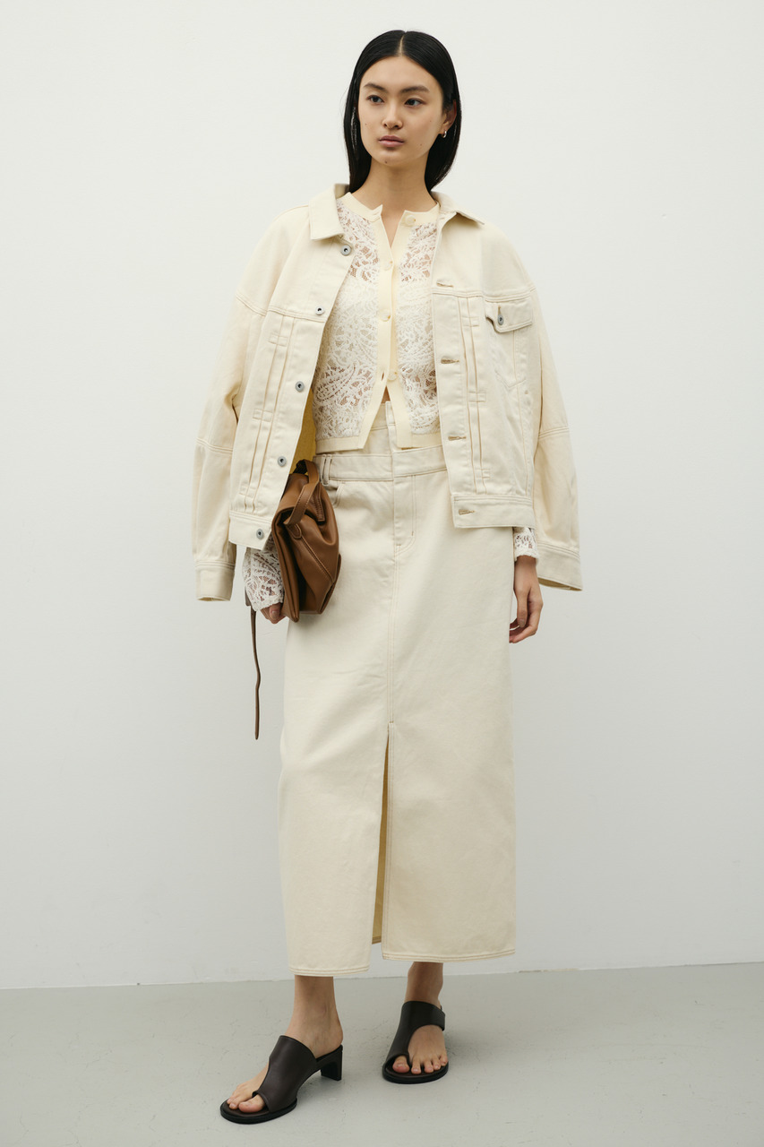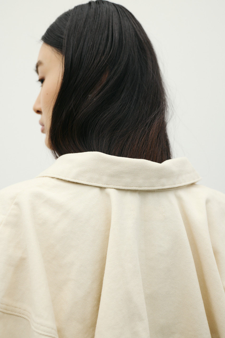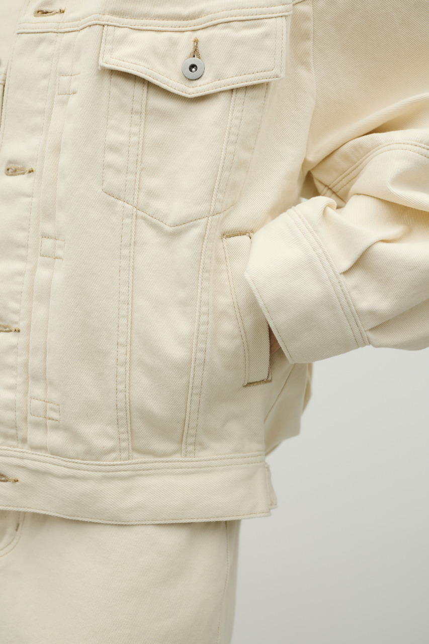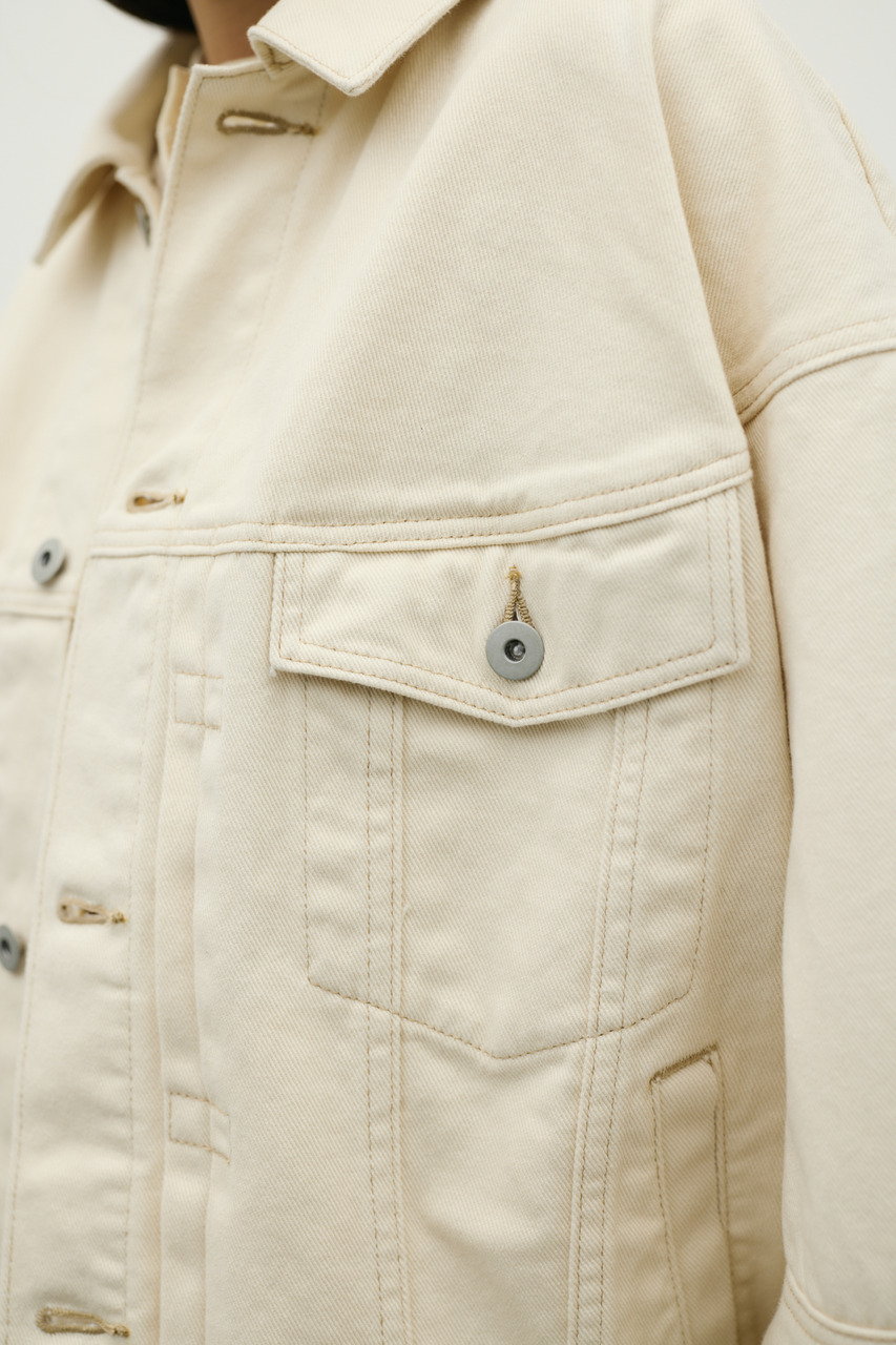 オーバーサイズのゆったりとしたフォルムが特徴的なデニムジャケット。ゆったりとしながらも構築的なシルエットで、着るだけで様になる一枚。500JSR11-0901(ダブルウエストデニムスカート)とセットアップ着用可能。透け感なし、ストレッチなし。