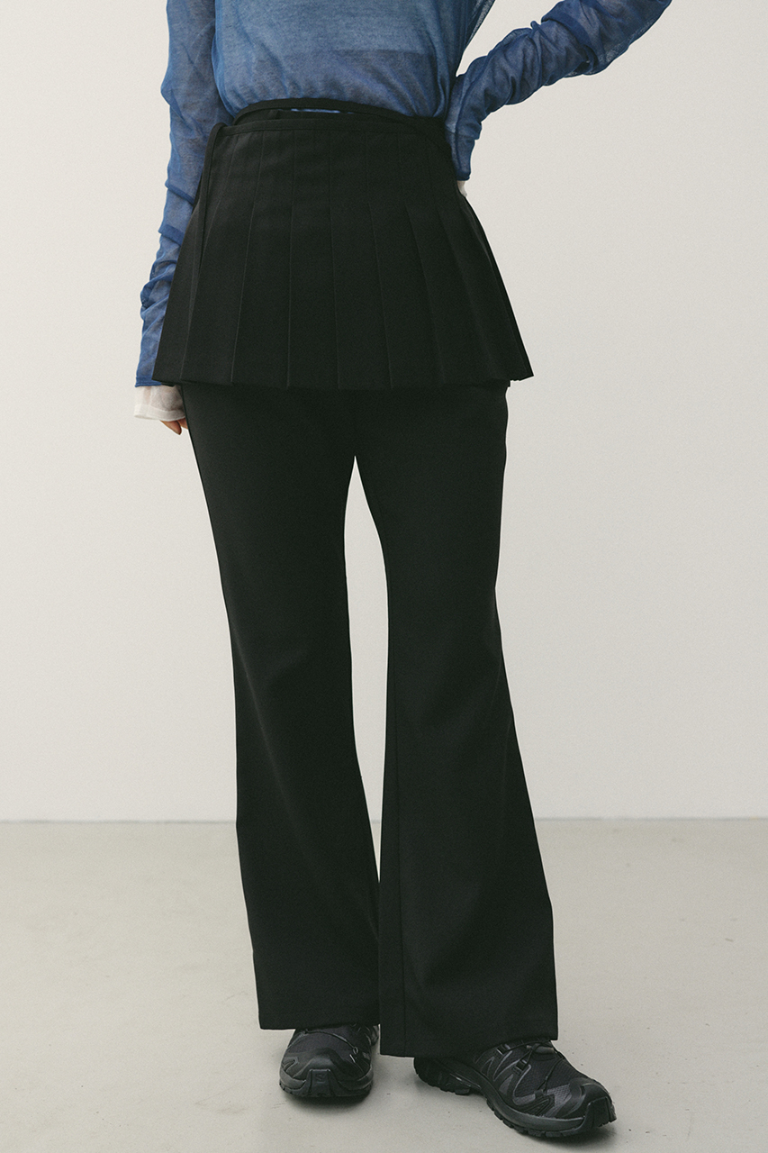 単品使いも可能なラッププリーツスカートとフレアパンツがセットになった2ピースアイテム。膝から裾にかけて広がるフレアシルエットのパンツが、脚のラインをすっきりと美しく見せます。プリーツスカートは気分やスタイリングに合わせて紐を一重巻き・二重巻きとアレンジが可能。セットでの着用はもちろん、お手持ちのパンツとレイヤードするなど、幅広いコーディネートが楽しめる一枚です。裏地付き。500JSO30-3211(テーラーカラーオープンシャツ)とのスタイリングがおすすめです。ストレッチややあり、透け感なし。