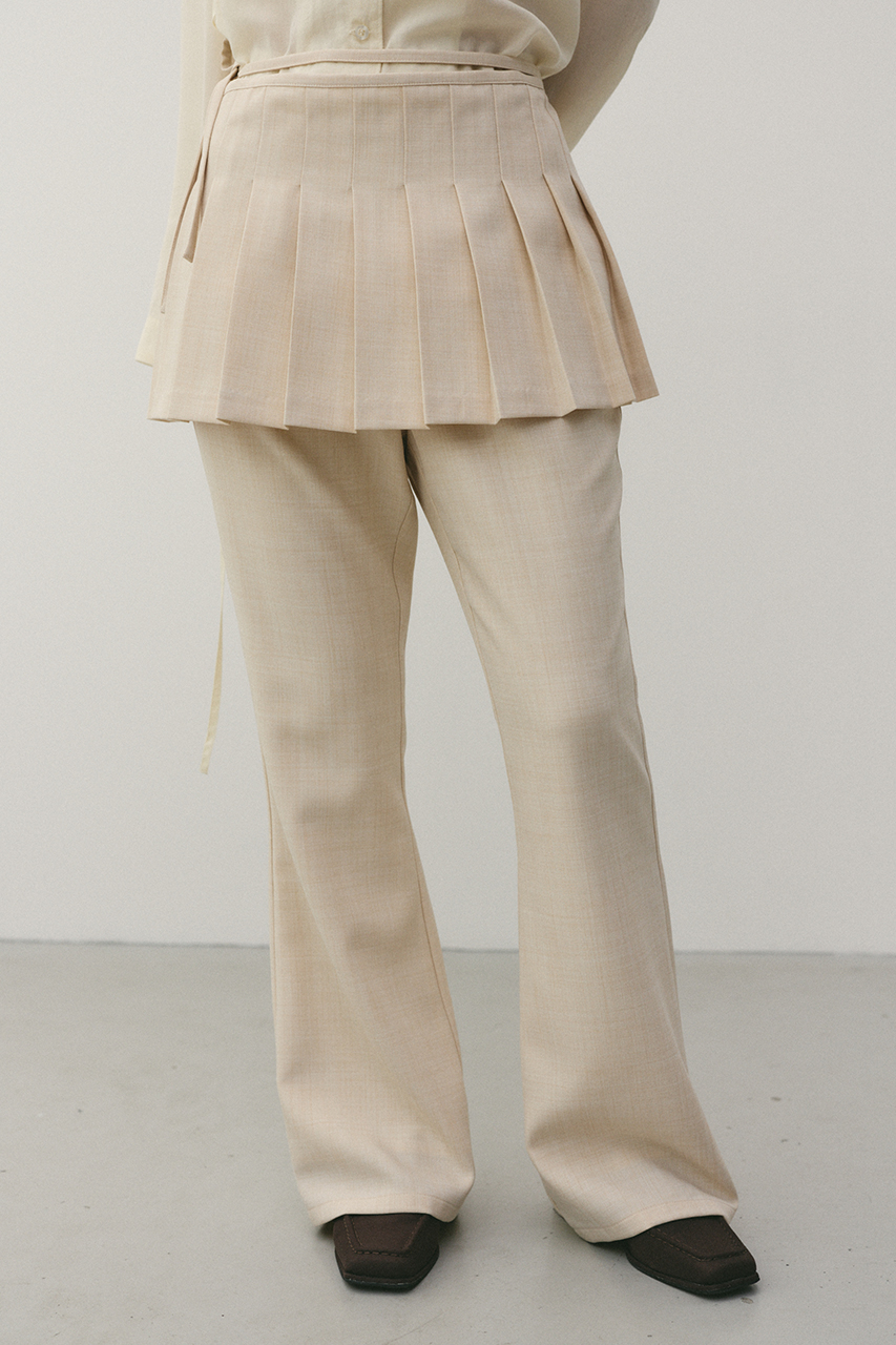 単品使いも可能なラッププリーツスカートとフレアパンツがセットになった2ピースアイテム。膝から裾にかけて広がるフレアシルエットのパンツが、脚のラインをすっきりと美しく見せます。プリーツスカートは気分やスタイリングに合わせて紐を一重巻き・二重巻きとアレンジが可能。セットでの着用はもちろん、お手持ちのパンツとレイヤードするなど、幅広いコーディネートが楽しめる一枚です。裏地付き。500JSO30-3211(テーラーカラーオープンシャツ)とのスタイリングがおすすめです。ストレッチややあり、透け感なし。