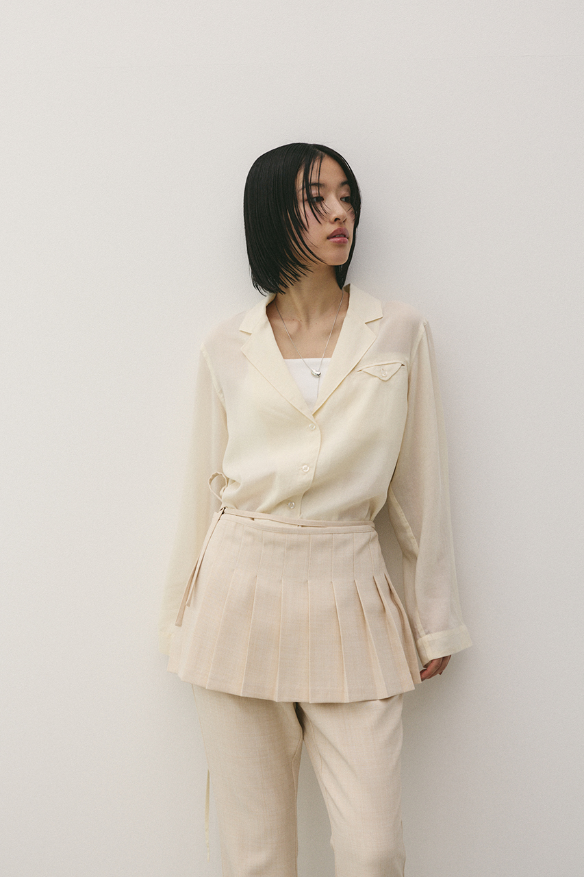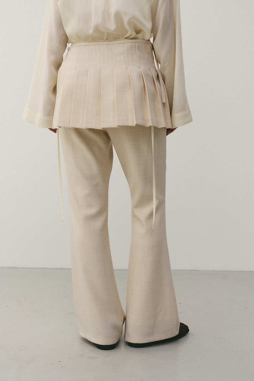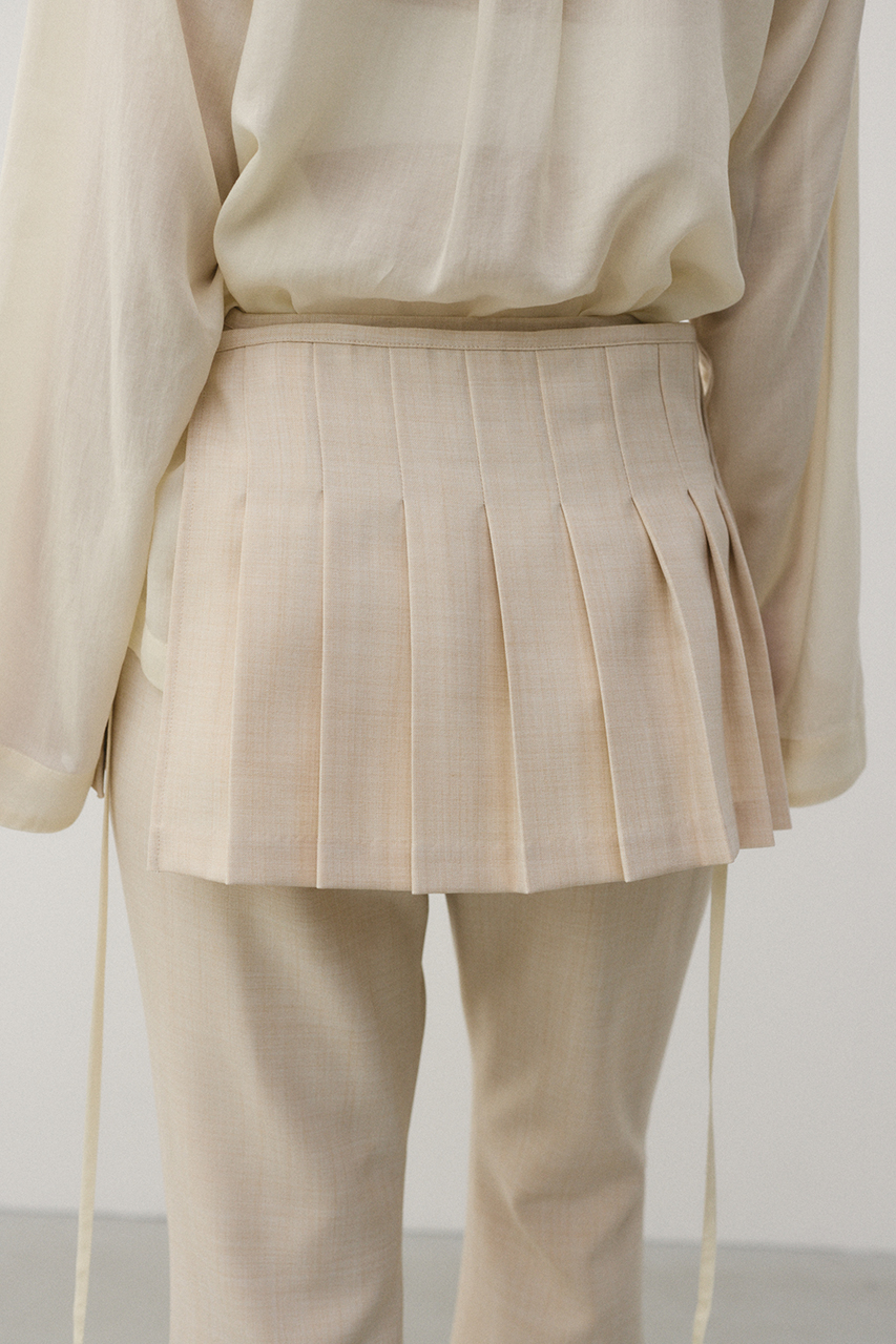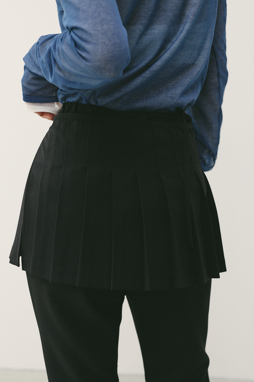 単品使いも可能なラッププリーツスカートとフレアパンツがセットになった2ピースアイテム。膝から裾にかけて広がるフレアシルエットのパンツが、脚のラインをすっきりと美しく見せます。プリーツスカートは気分やスタイリングに合わせて紐を一重巻き・二重巻きとアレンジが可能。セットでの着用はもちろん、お手持ちのパンツとレイヤードするなど、幅広いコーディネートが楽しめる一枚です。裏地付き。500JSO30-3211(テーラーカラーオープンシャツ)とのスタイリングがおすすめです。ストレッチややあり、透け感なし。