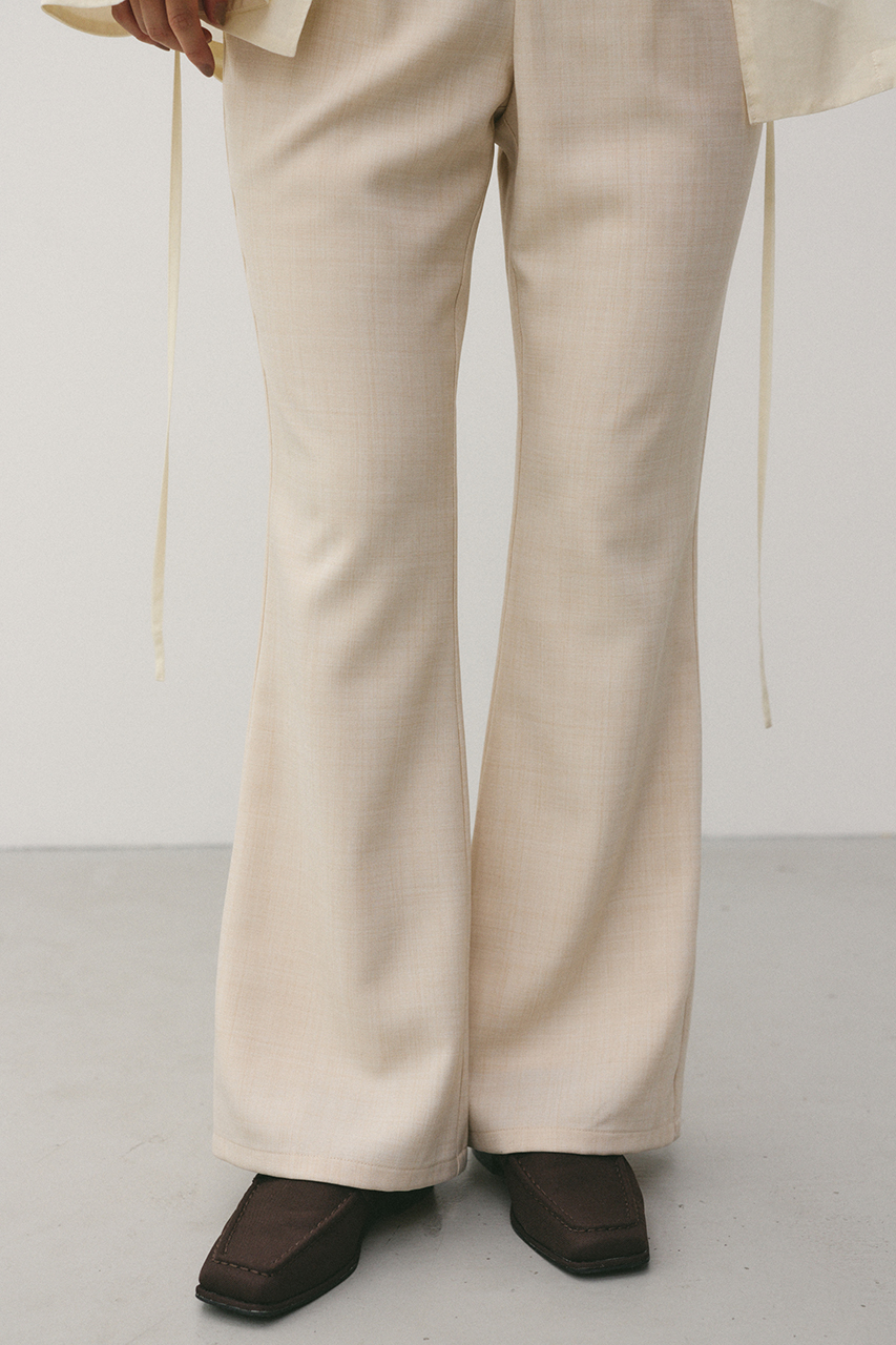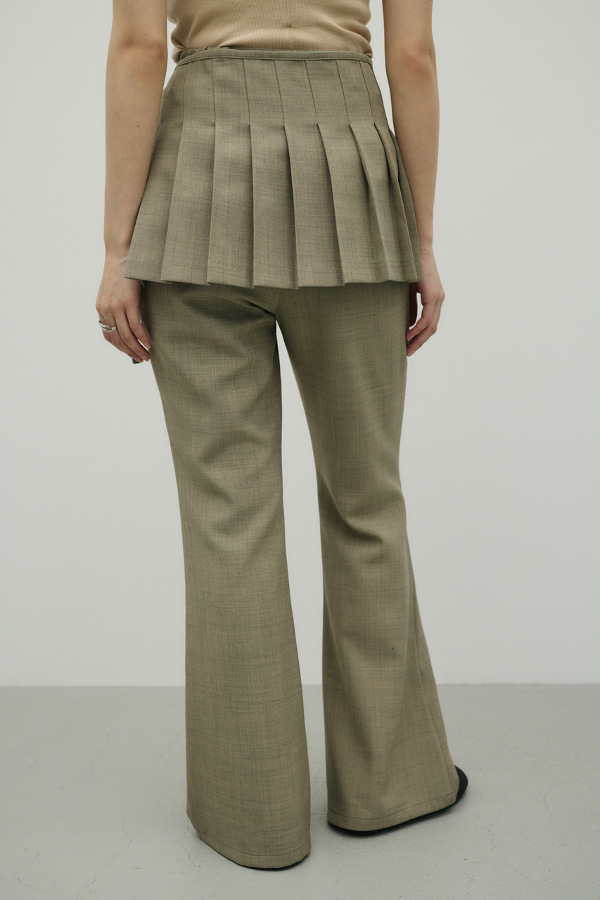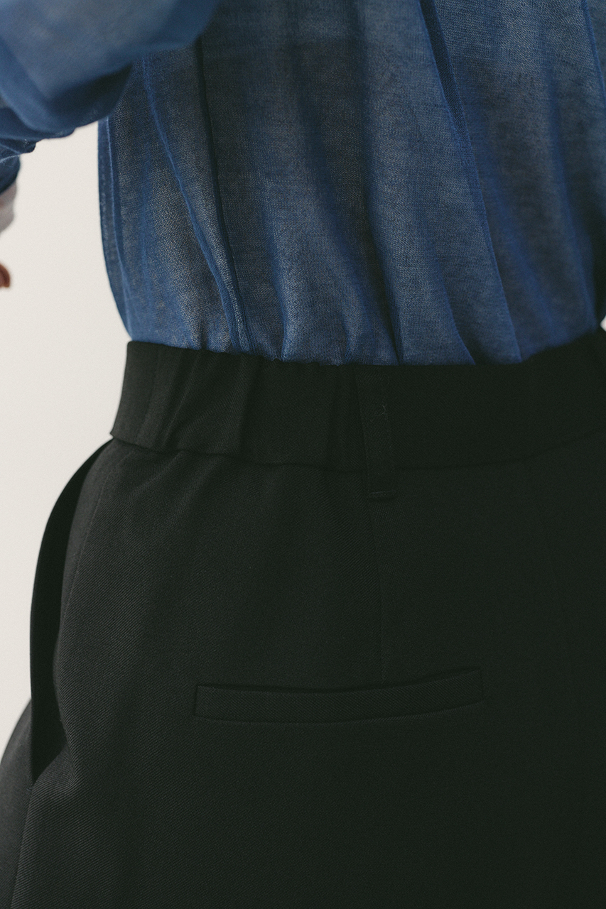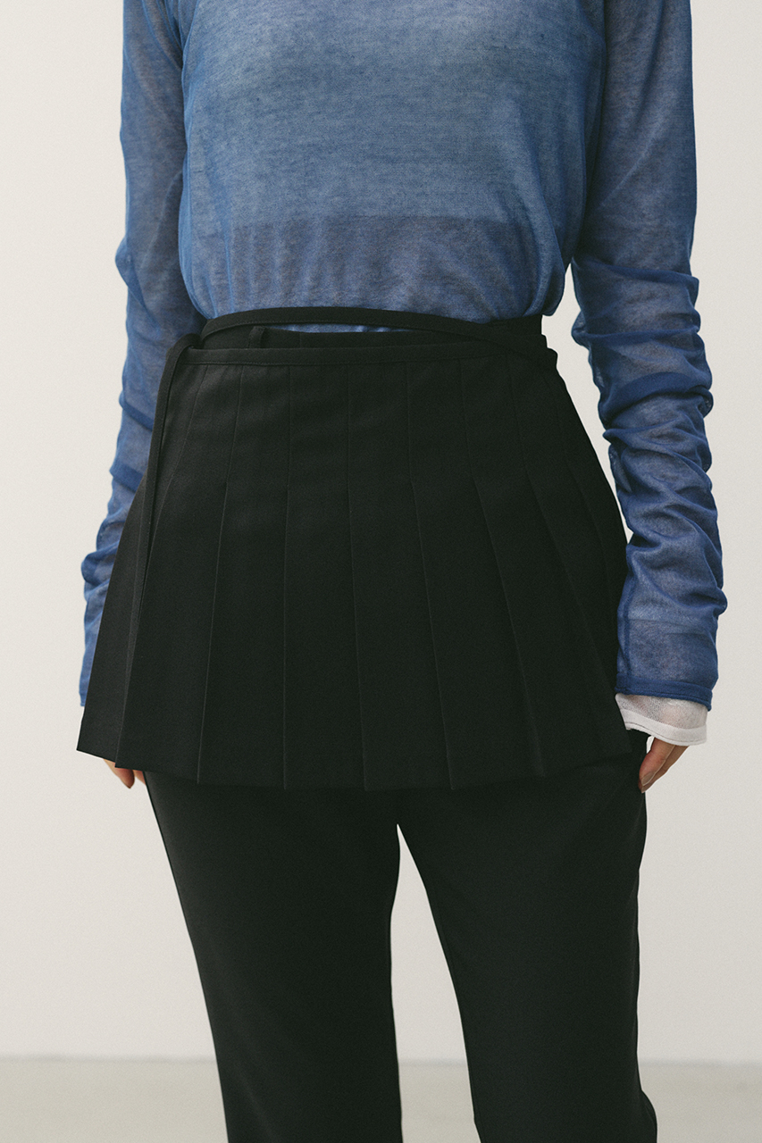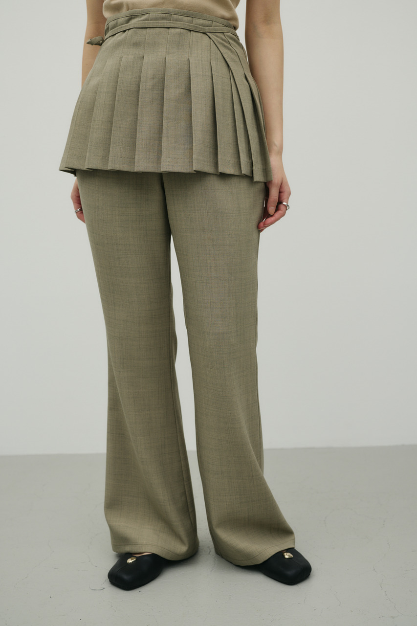 単品使いも可能なラッププリーツスカートとフレアパンツがセットになった2ピースアイテム。膝から裾にかけて広がるフレアシルエットのパンツが、脚のラインをすっきりと美しく見せます。プリーツスカートは気分やスタイリングに合わせて紐を一重巻き・二重巻きとアレンジが可能。セットでの着用はもちろん、お手持ちのパンツとレイヤードするなど、幅広いコーディネートが楽しめる一枚です。裏地付き。500JSO30-3211(テーラーカラーオープンシャツ)とのスタイリングがおすすめです。ストレッチややあり、透け感なし。