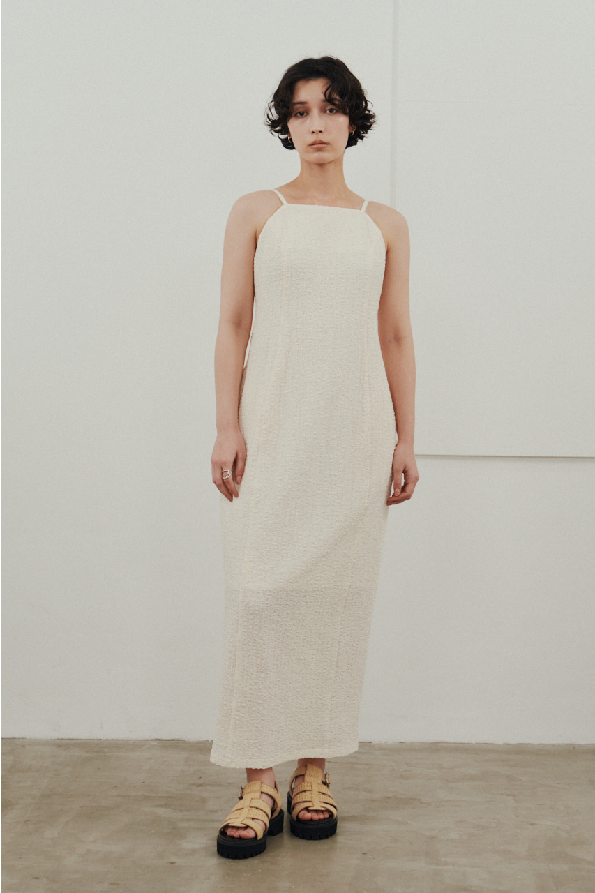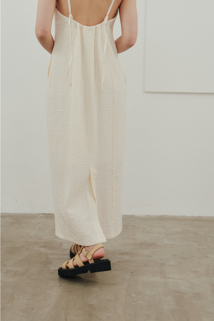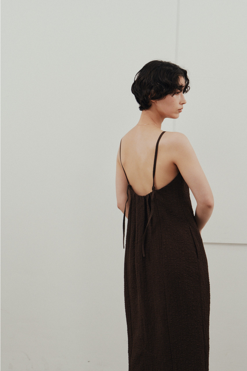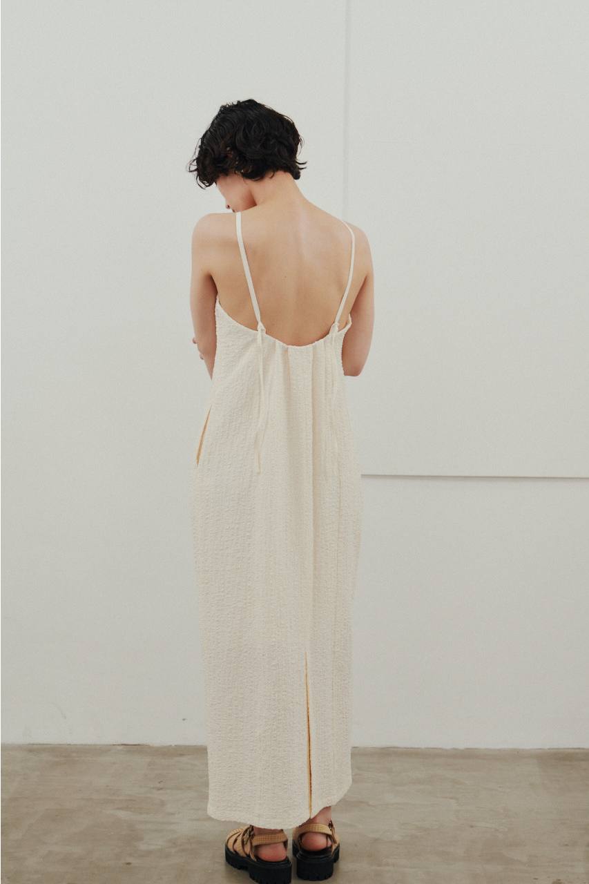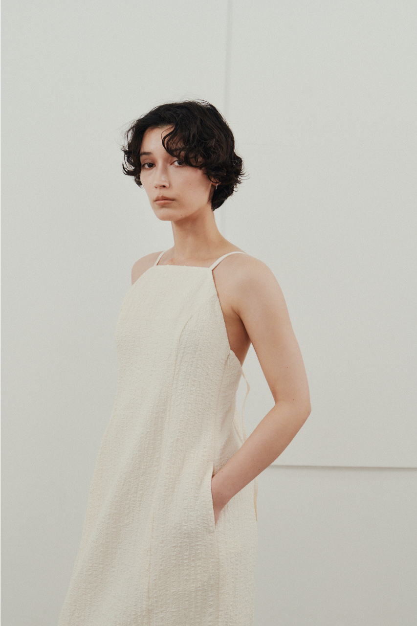 背中を大きく開けたバックオープンデザインが印象的なキャミワンピース。シンプルなフロントデザインとのコントラストで、バックスタイルは抜け感と存在感を演出。1枚でドレスライクに着こなすのはもちろん、Tシャツやシアートップスとのレイヤードでカジュアルダウンでの着用もおすすめ。リゾートからタウンユースまで幅広く活躍する、主役級の一枚です。