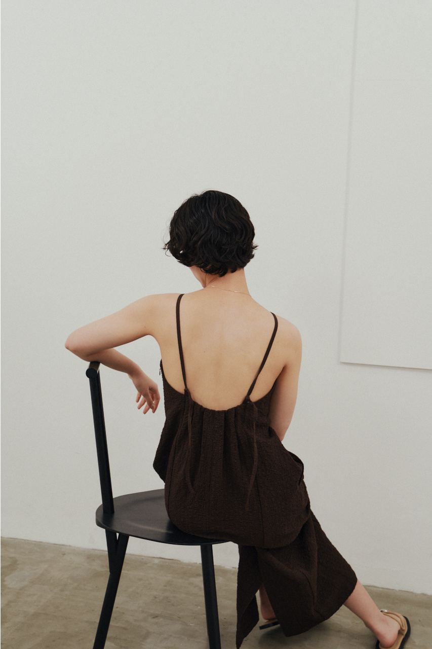 背中を大きく開けたバックオープンデザインが印象的なキャミワンピース。シンプルなフロントデザインとのコントラストで、バックスタイルは抜け感と存在感を演出。1枚でドレスライクに着こなすのはもちろん、Tシャツやシアートップスとのレイヤードでカジュアルダウンでの着用もおすすめ。リゾートからタウンユースまで幅広く活躍する、主役級の一枚です。