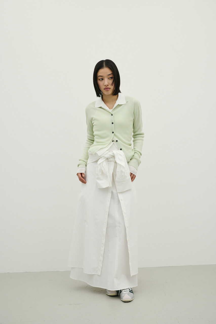 程よい抜け感を演出するスキッパーデザインが特徴のニットカーディガン。襟元の開きが顔まわりをすっきりと見せ、リラックス感ときちんと感を両立します。羽織りとしてはもちろん、フロントを閉じてトップス感覚でも着られる万能アイテム。さらりとしたタッチのニット素材で季節の変わり目にも重宝し、パンツにもスカートにも合わせやすいシルエットに仕上げています。シンプルながらも洗練された印象で、日常のスタイリングに取り入れやすい一枚です。透け感あり、ストレッチあり。