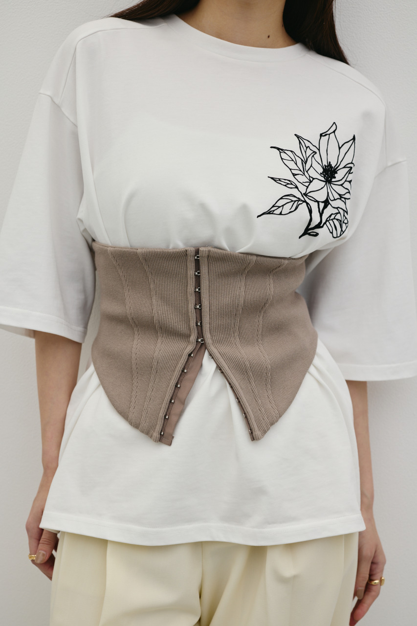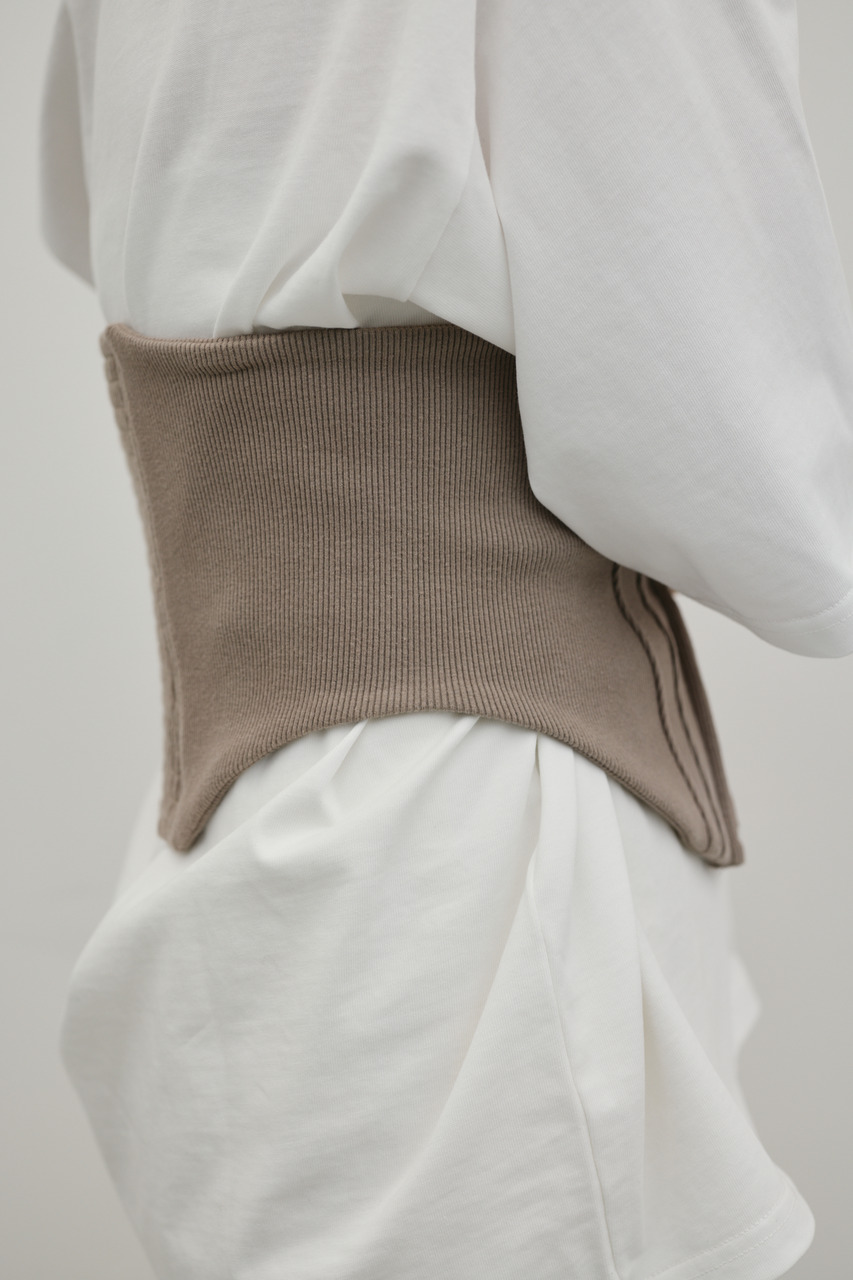 リブカット素材のコルセットビスチェ。程よいシェイプラインで身体になじみやすく、カジュアルなスタイリングにも女性らしいニュアンスを取り入れられる一枚。後ろはシャーリングゴムを入れて、厚手のカットーやシャツも重ねやすい仕様になっています。透け感なし、ストレッチなし。