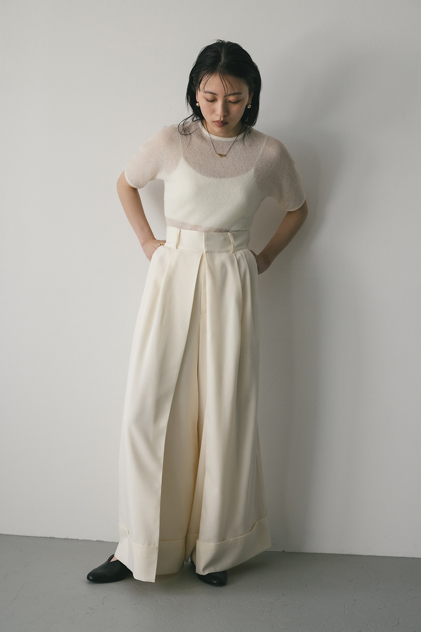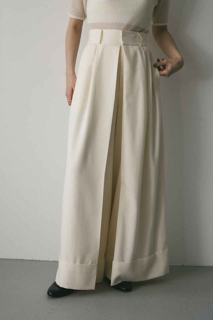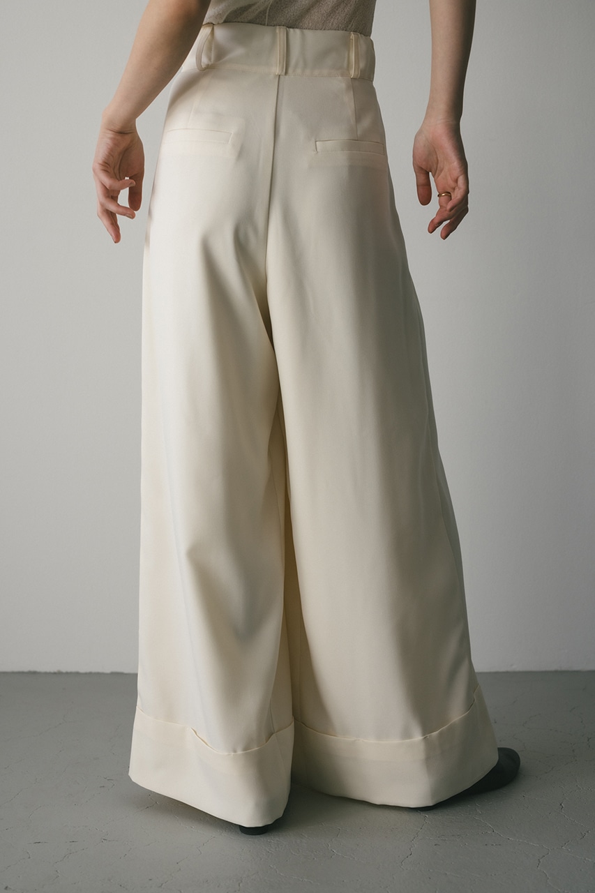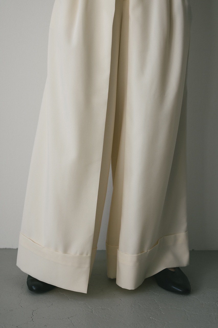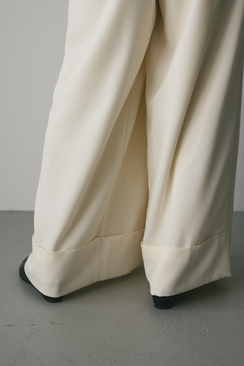 フロントタックとロールのビックデティールが可愛いワイドパンツ。スタイリングに映えるデティールで落ち着いた大人っぽい印象に導きます。ウエストサイドにゴム仕様でインスタイルでもすっきりとスタイリングして頂けます。透け感なし(IVO裏地入り)ストレッチなし。