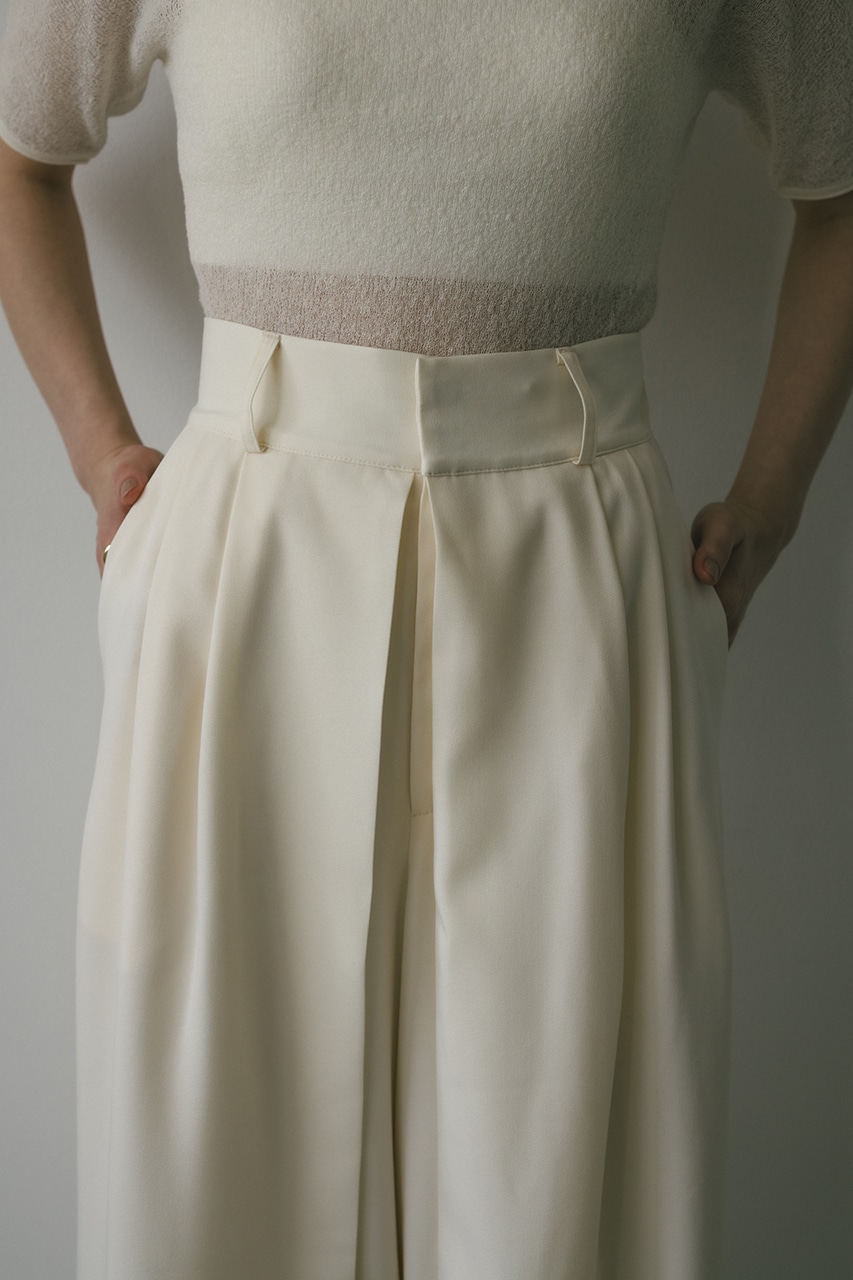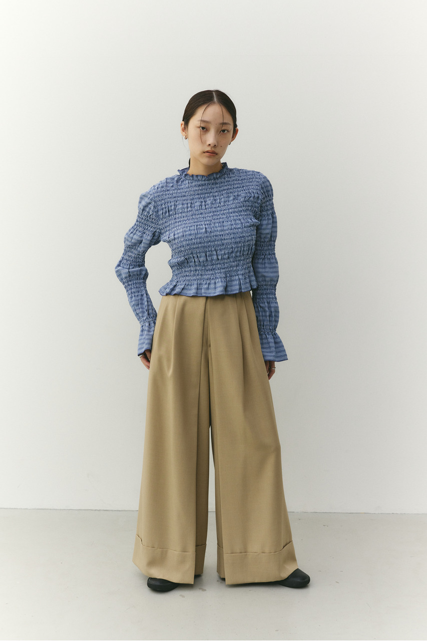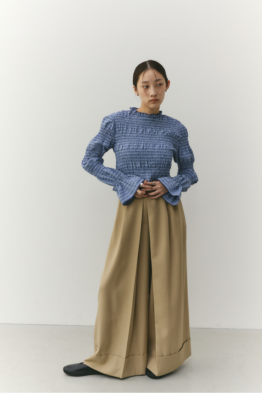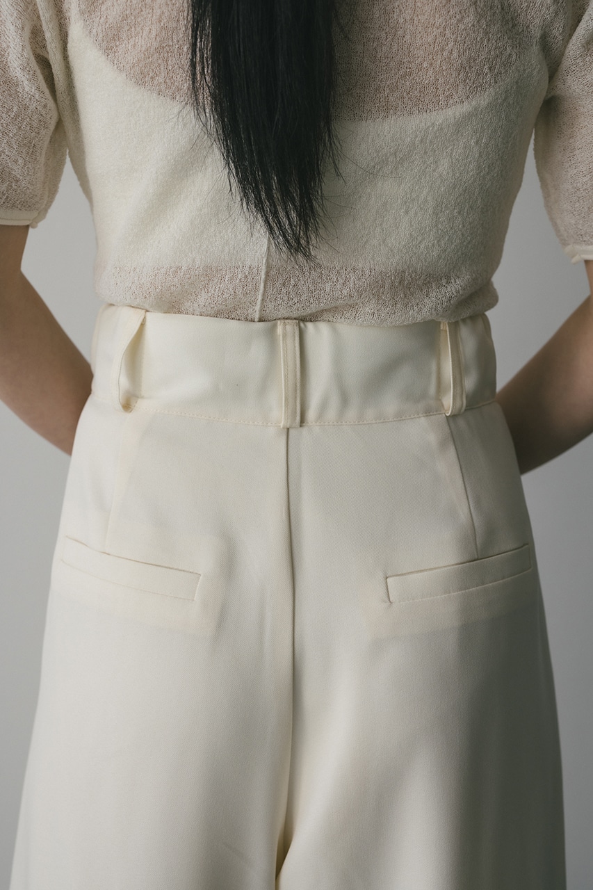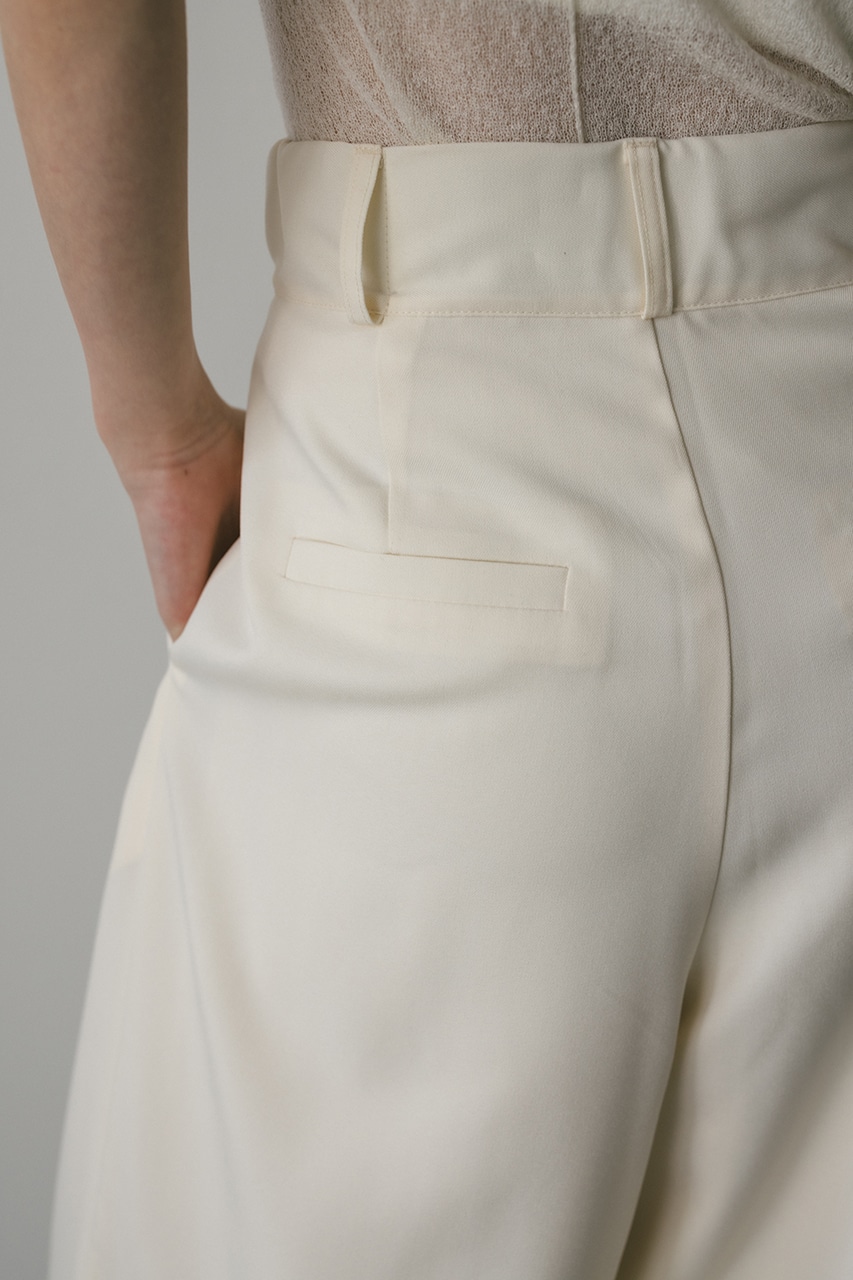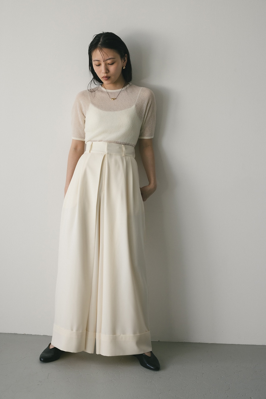 フロントタックとロールのビックデティールが可愛いワイドパンツ。スタイリングに映えるデティールで落ち着いた大人っぽい印象に導きます。ウエストサイドにゴム仕様でインスタイルでもすっきりとスタイリングして頂けます。透け感なし(IVO裏地入り)ストレッチなし。