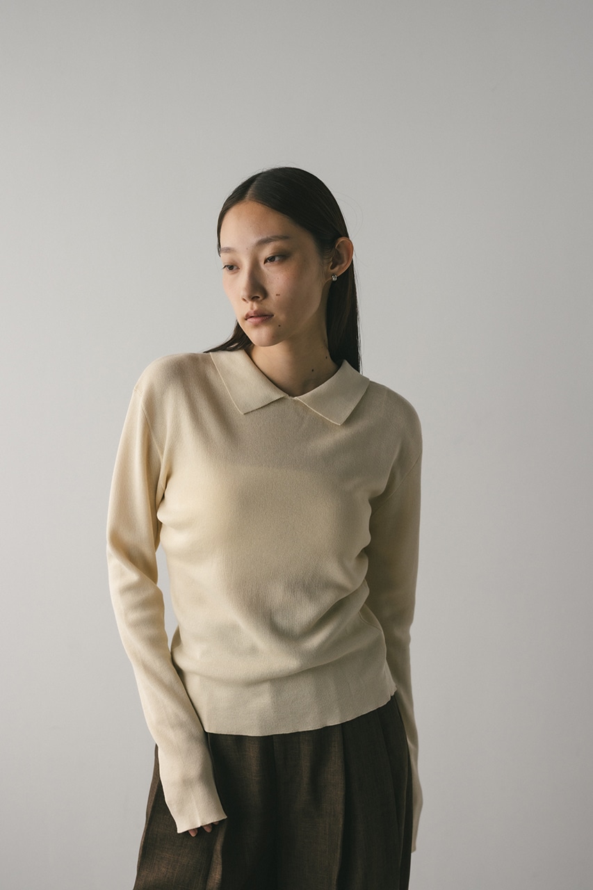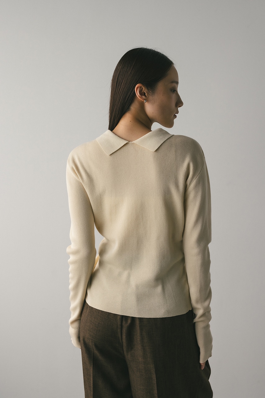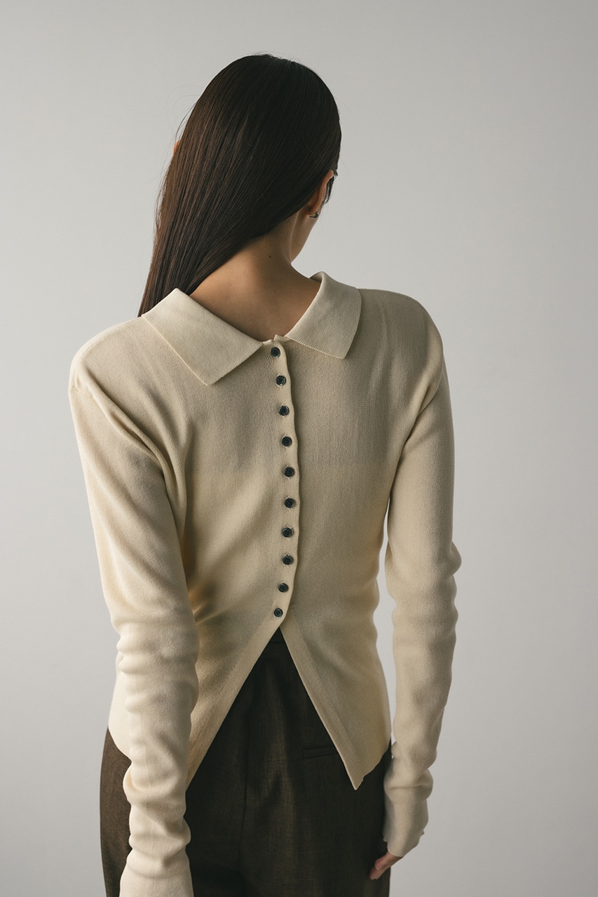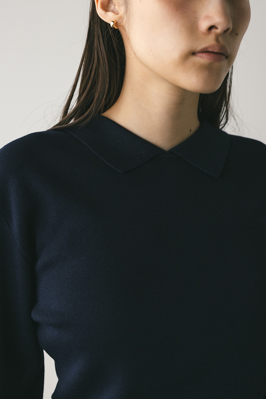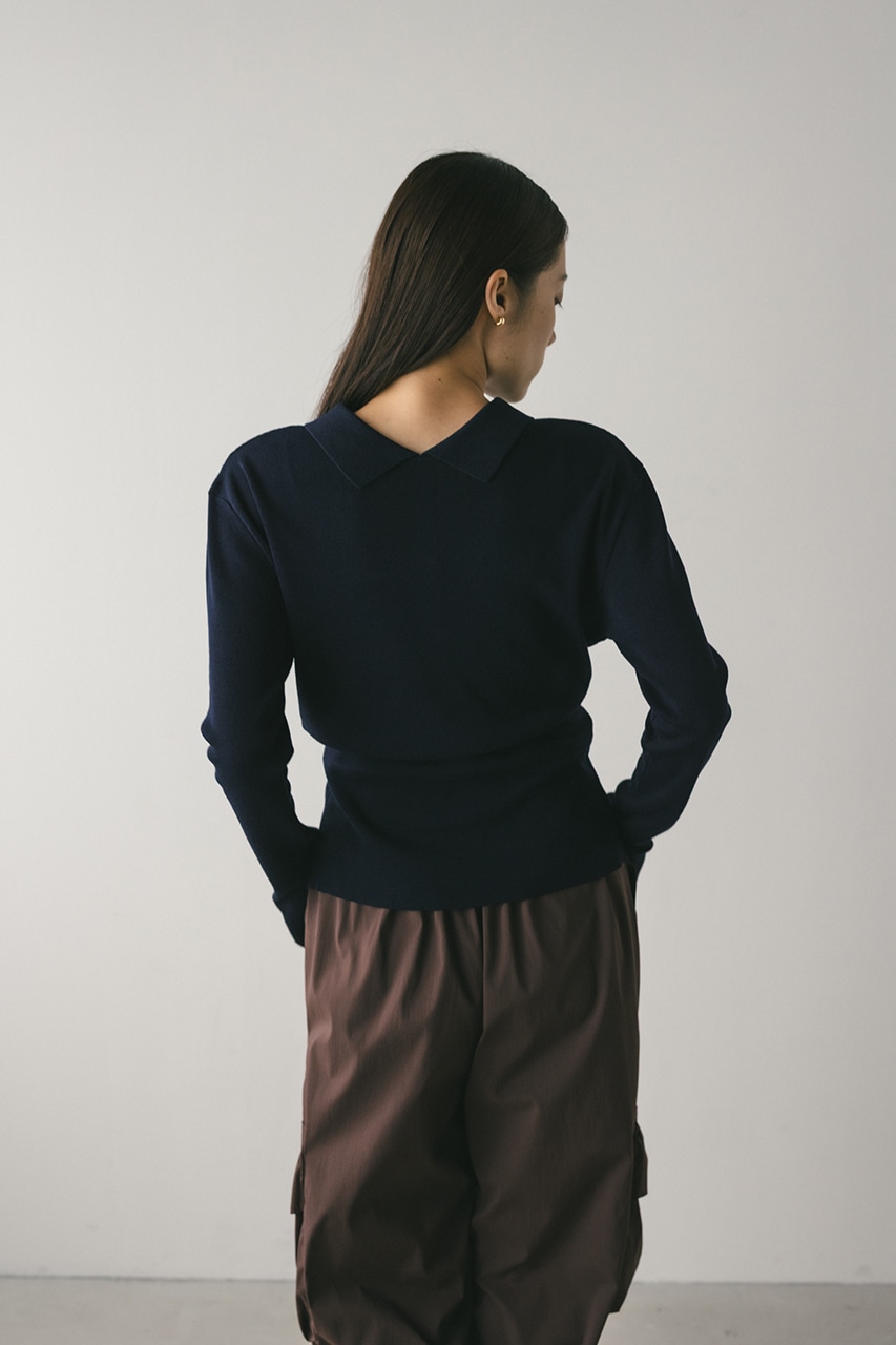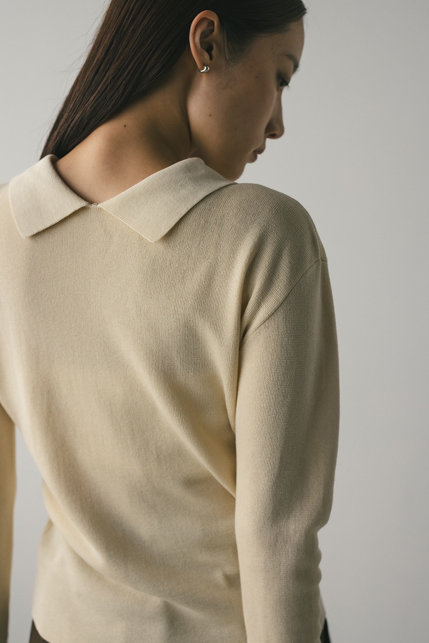 前後2WAYで着用可能なニットポロ。なめらかでさらりとした糸を使用。ビスコース混の微光沢が上品な印象に見せてくれます。総針に編み立てにしているのでボディーラインもひびきにくい一枚です。ストレッチあり、透け感なし。