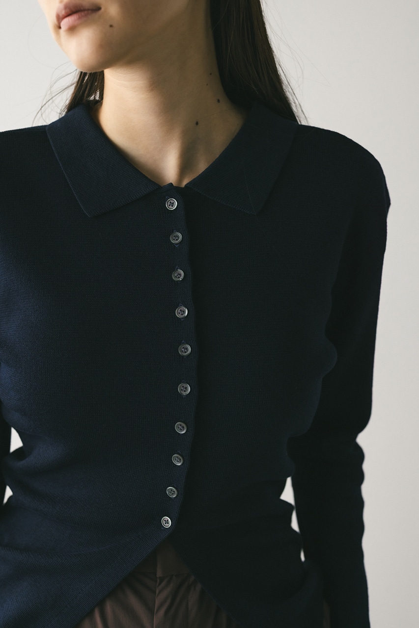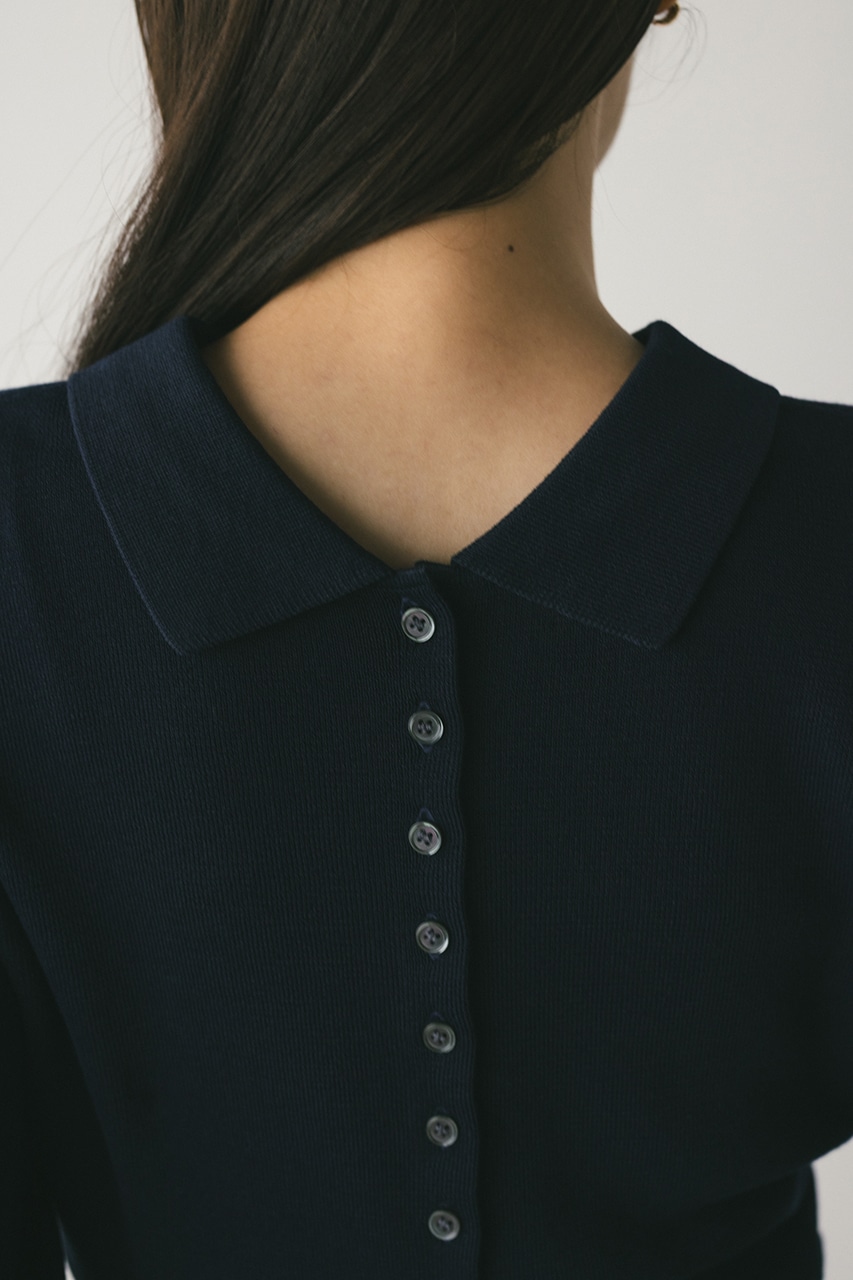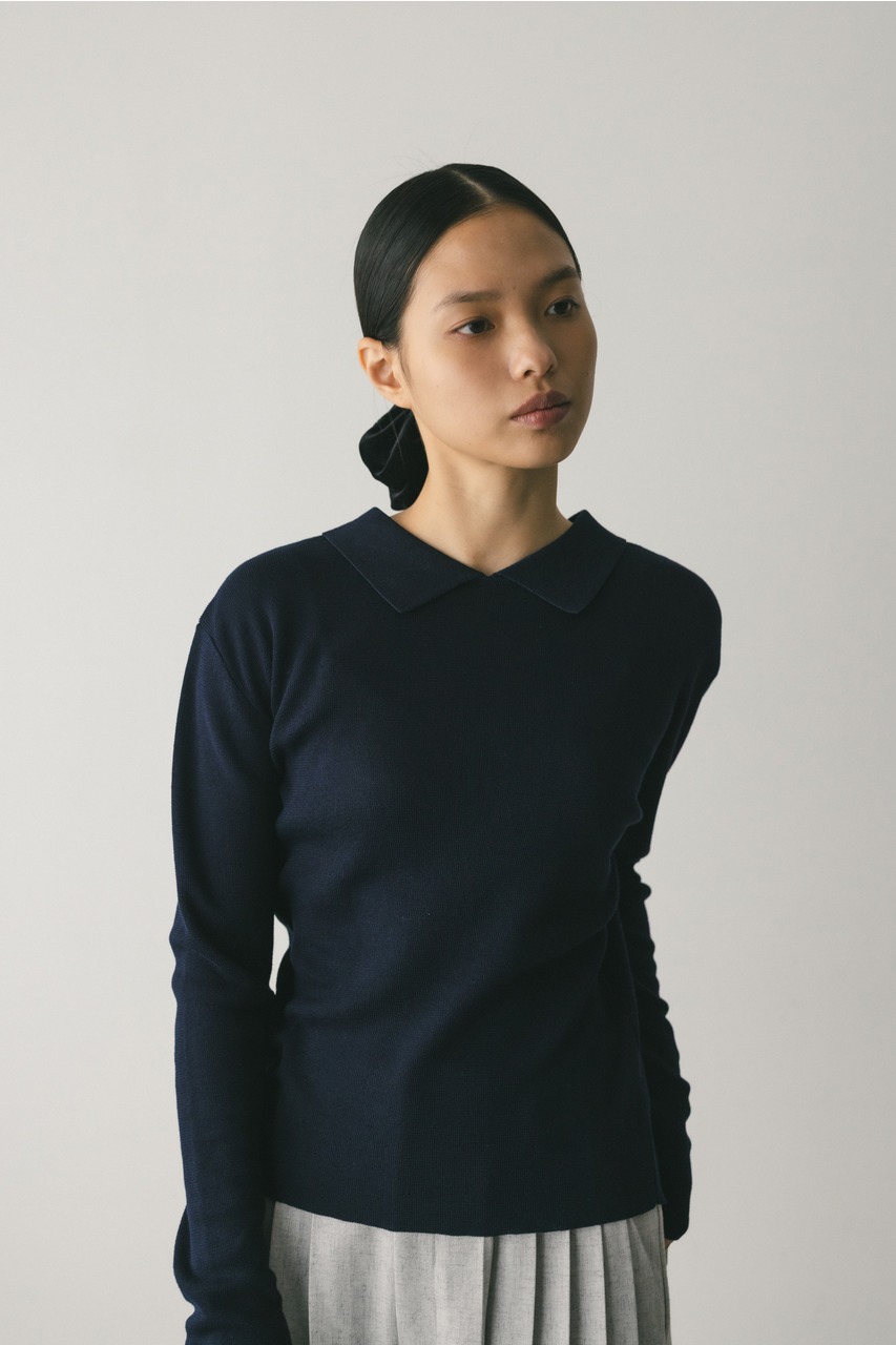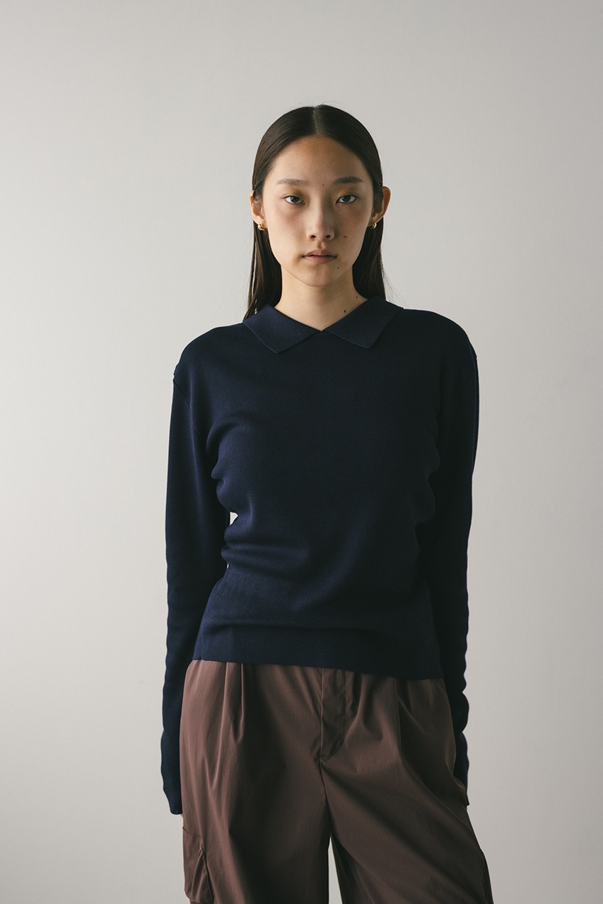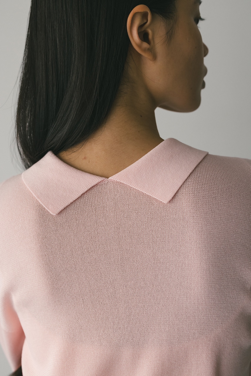 前後2WAYで着用可能なニットポロ。なめらかでさらりとした糸を使用。ビスコース混の微光沢が上品な印象に見せてくれます。総針に編み立てにしているのでボディーラインもひびきにくい一枚です。ストレッチあり、透け感なし。