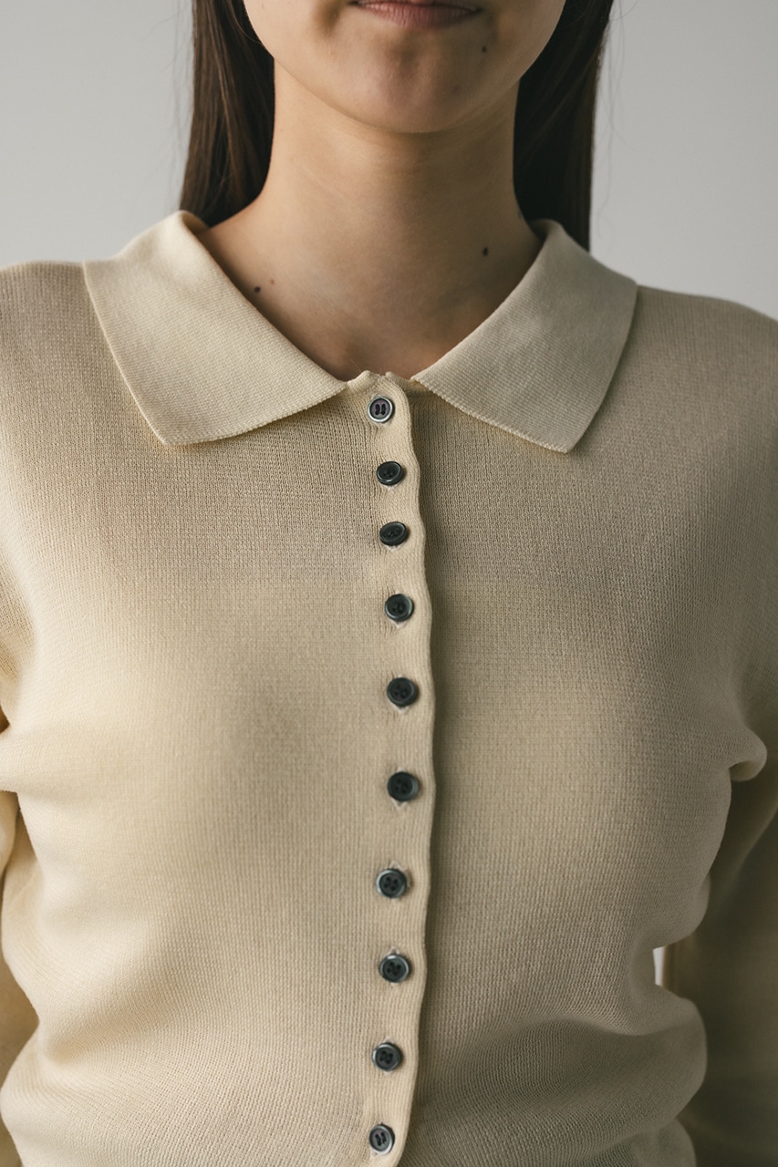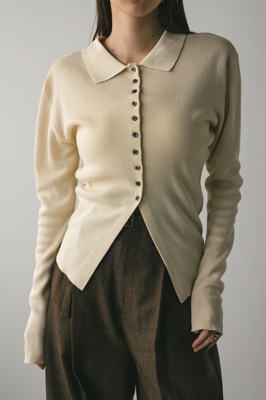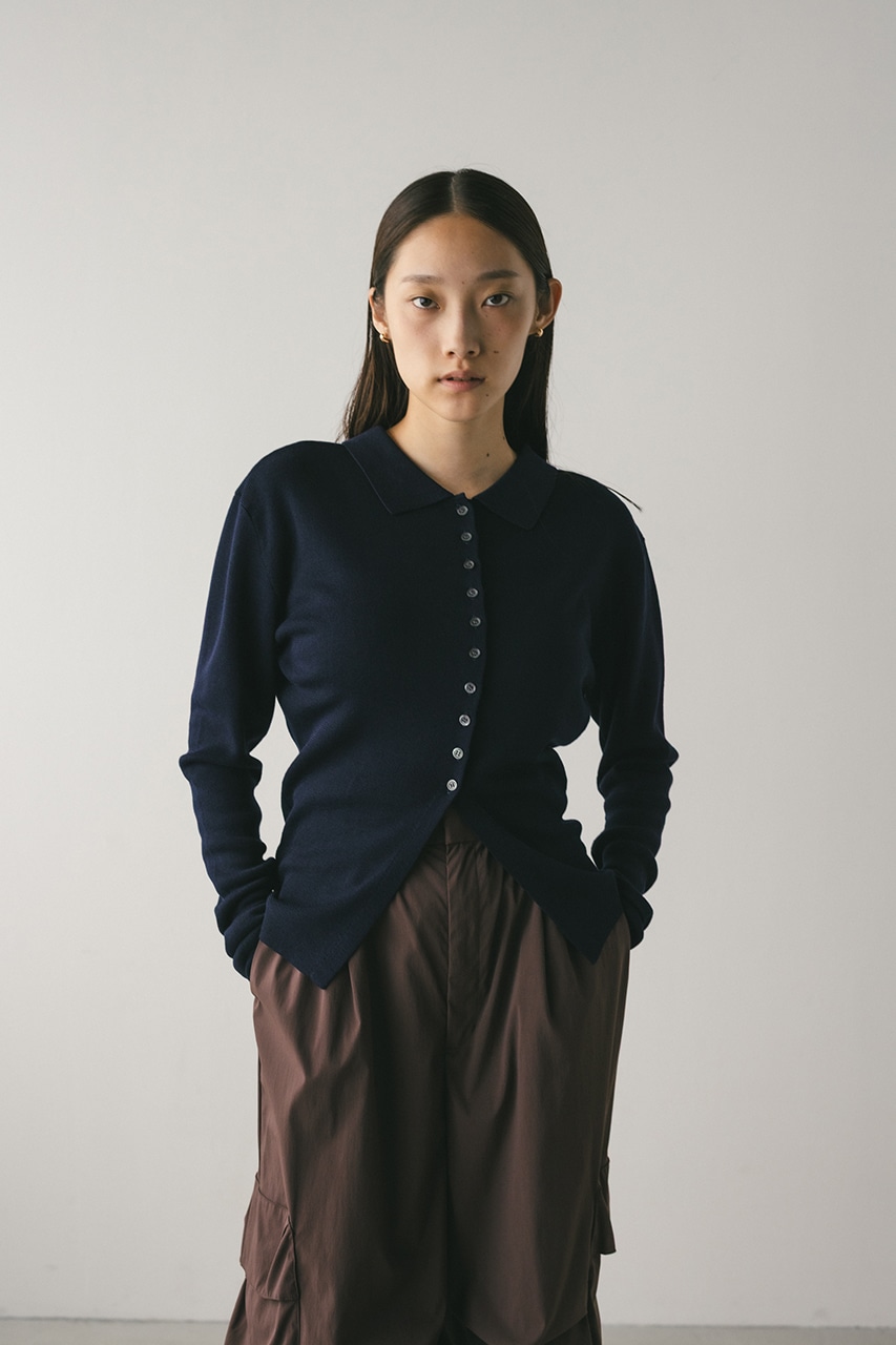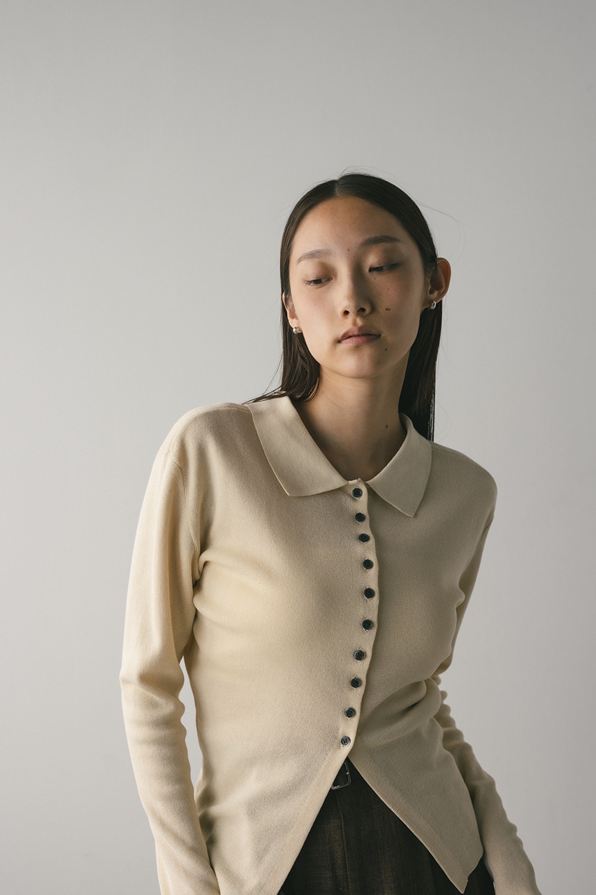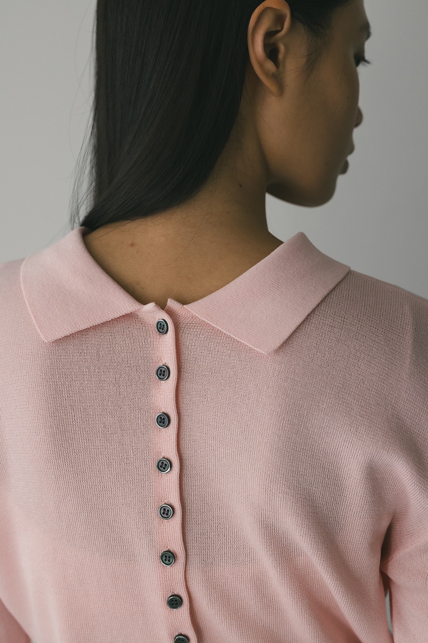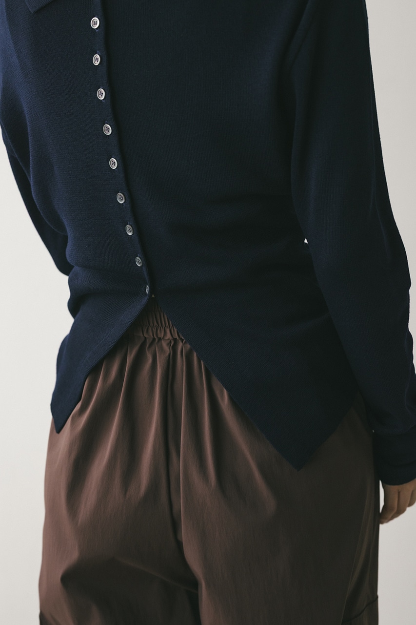 前後2WAYで着用可能なニットポロ。なめらかでさらりとした糸を使用。ビスコース混の微光沢が上品な印象に見せてくれます。総針に編み立てにしているのでボディーラインもひびきにくい一枚です。ストレッチあり、透け感なし。