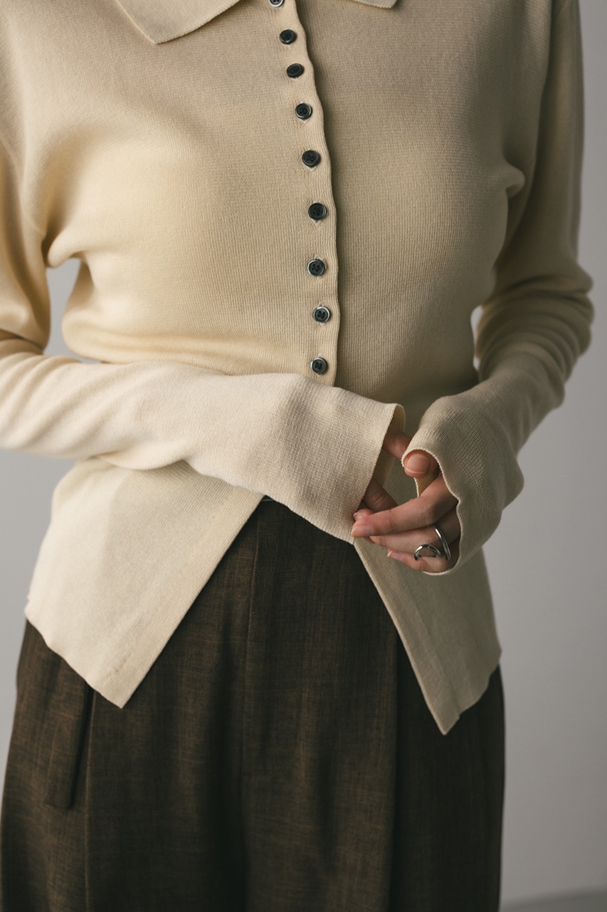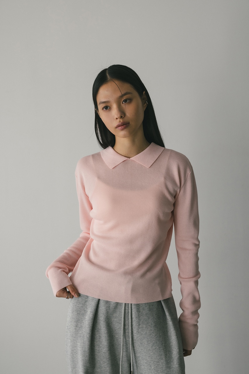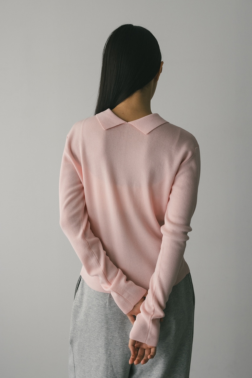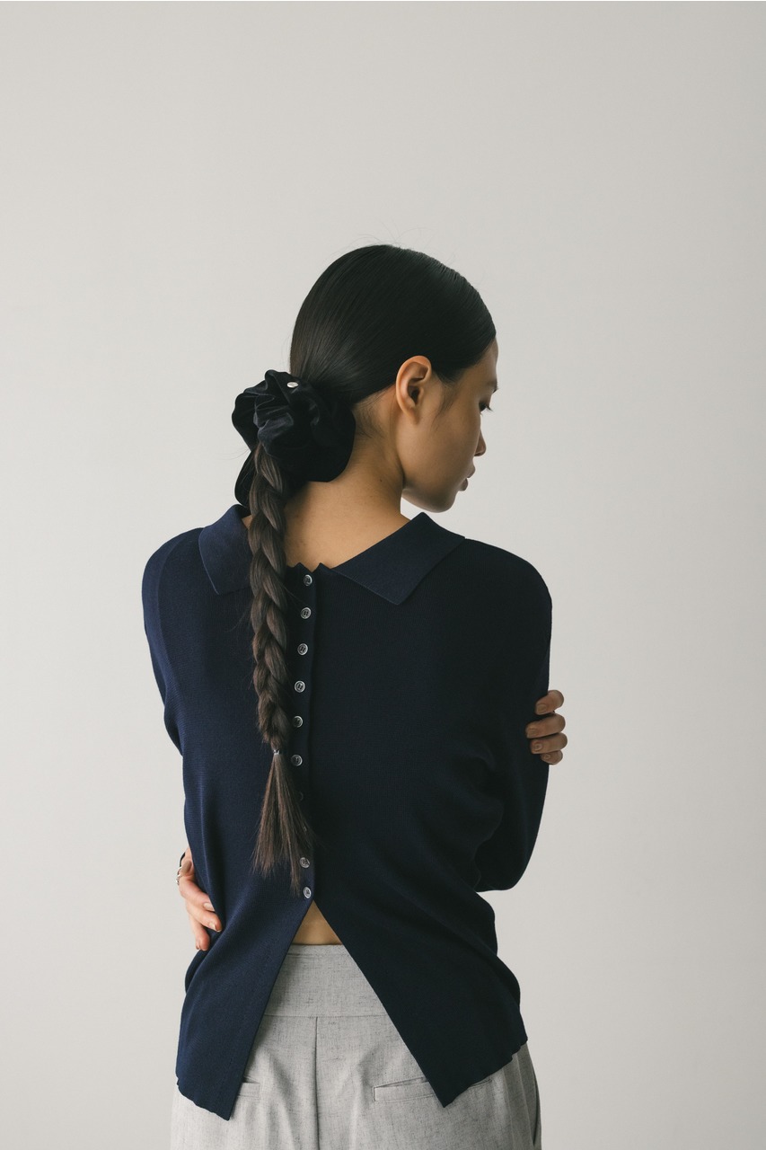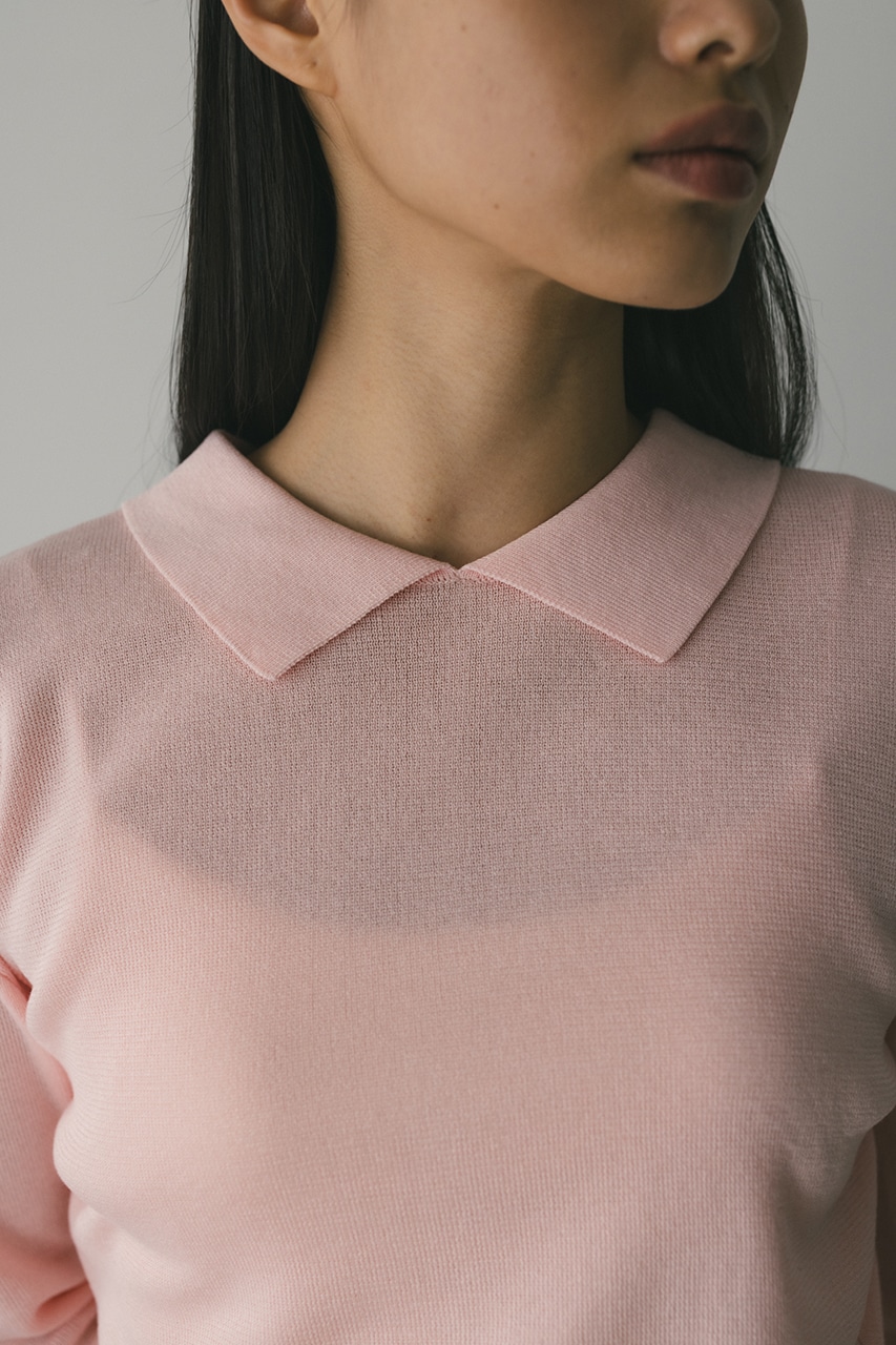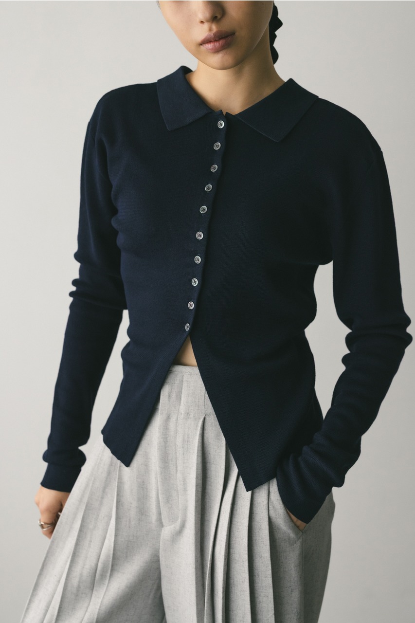前後2WAYで着用可能なニットポロ。なめらかでさらりとした糸を使用。ビスコース混の微光沢が上品な印象に見せてくれます。総針に編み立てにしているのでボディーラインもひびきにくい一枚です。ストレッチあり、透け感なし。