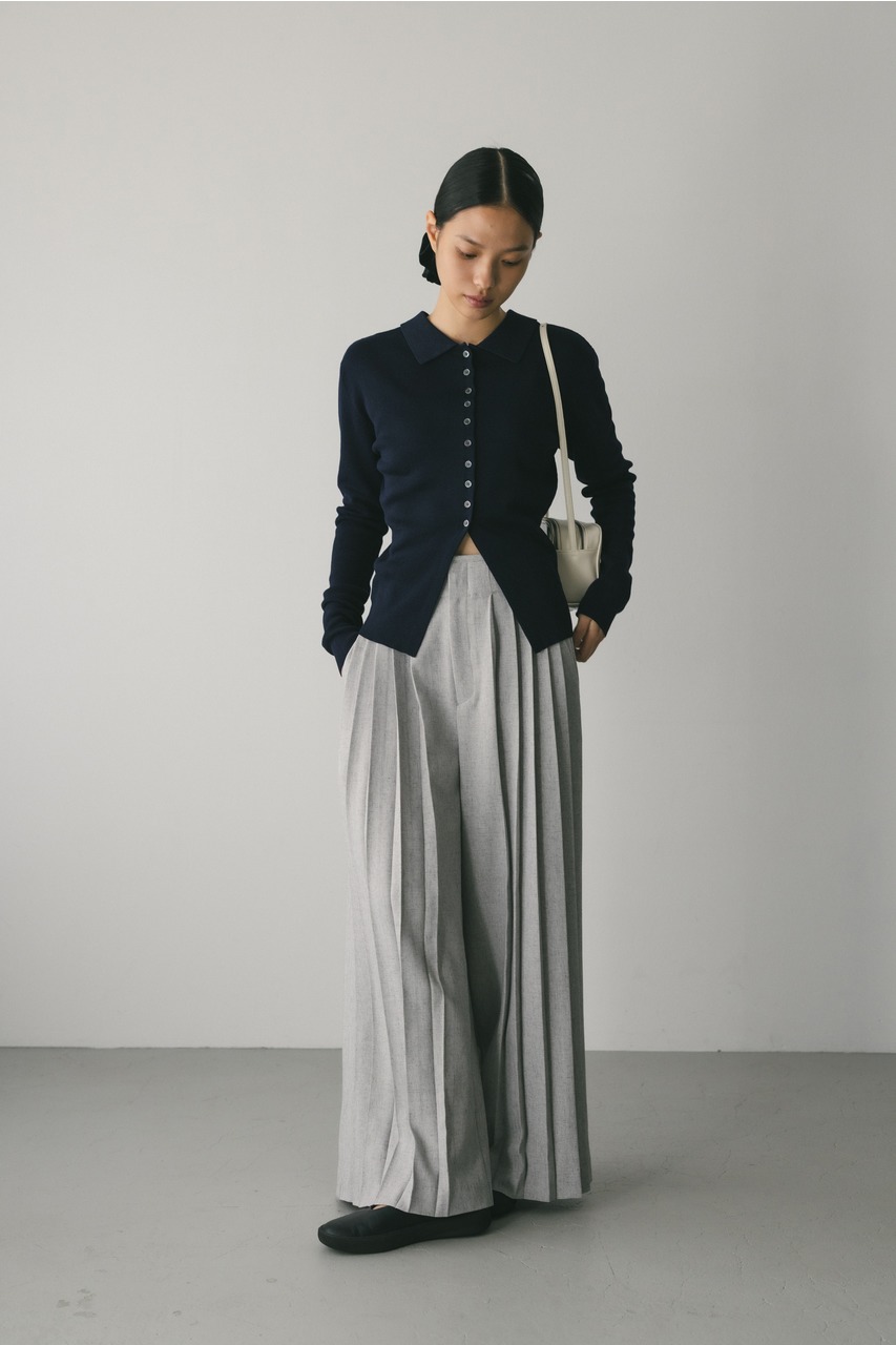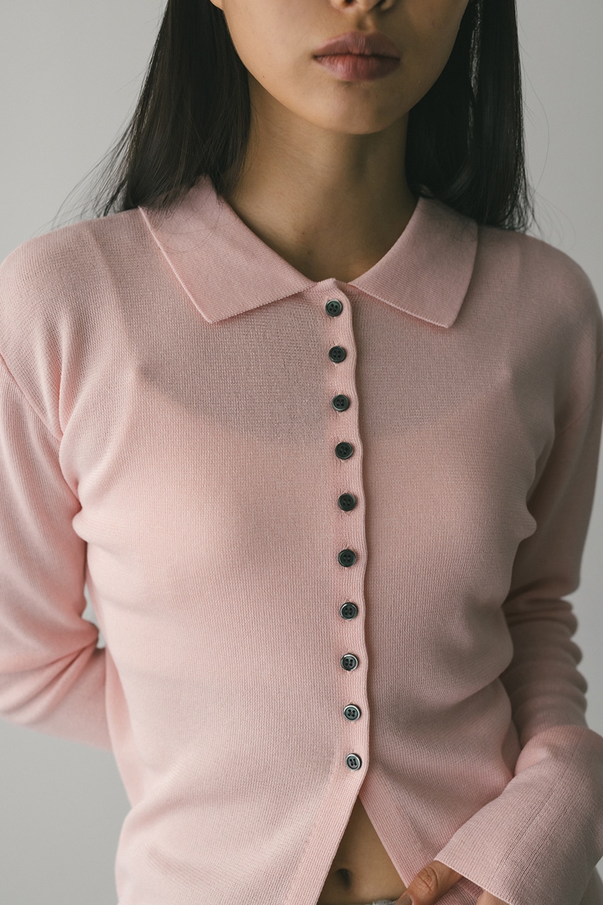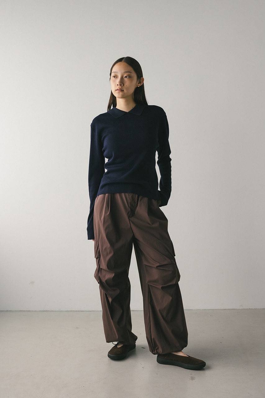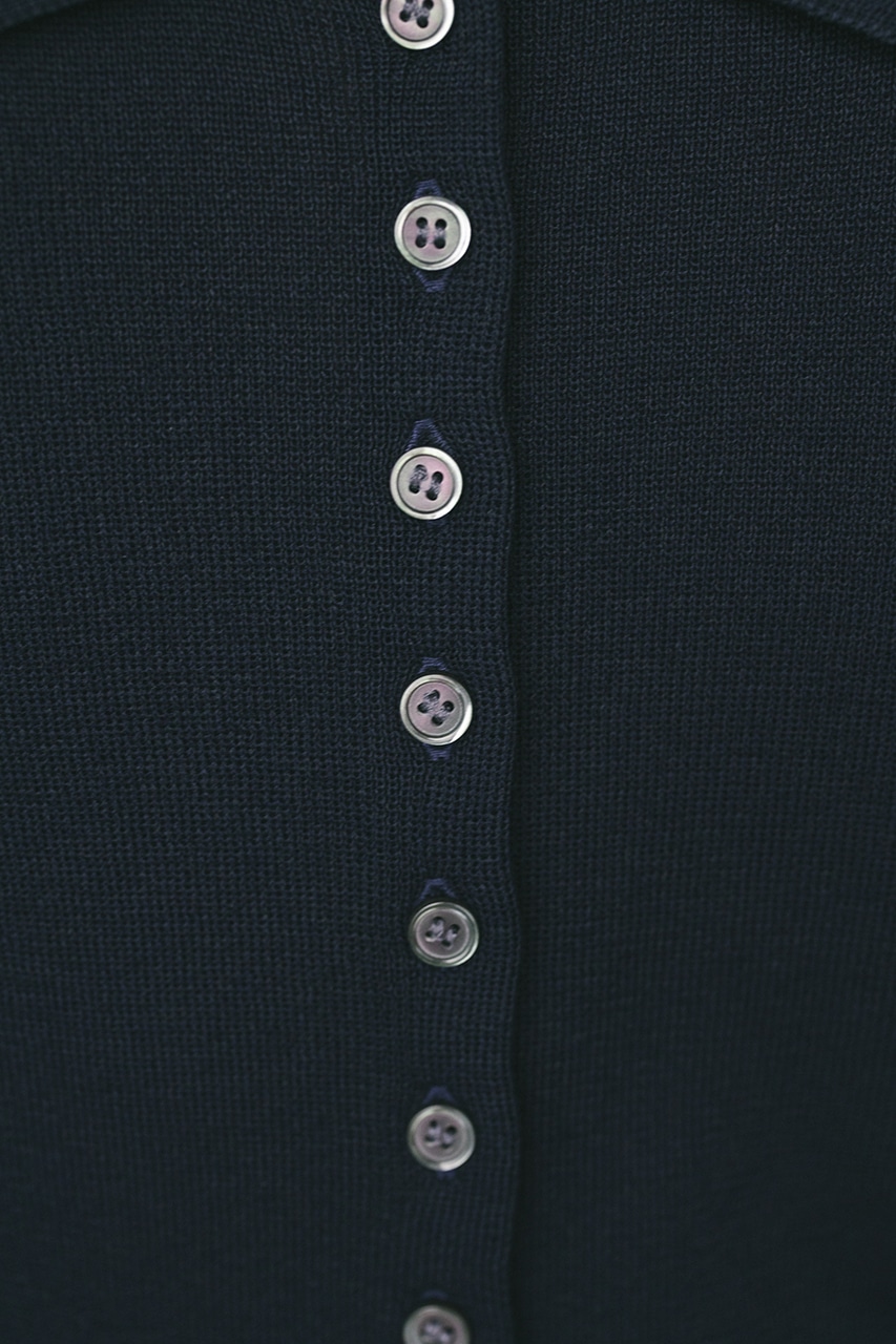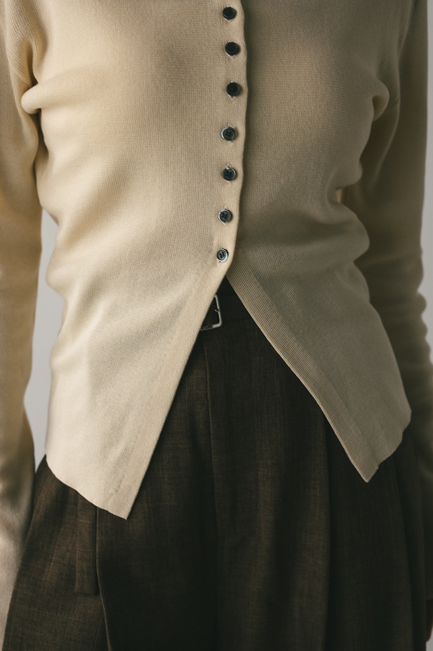 前後2WAYで着用可能なニットポロ。なめらかでさらりとした糸を使用。ビスコース混の微光沢が上品な印象に見せてくれます。総針に編み立てにしているのでボディーラインもひびきにくい一枚です。ストレッチあり、透け感なし。