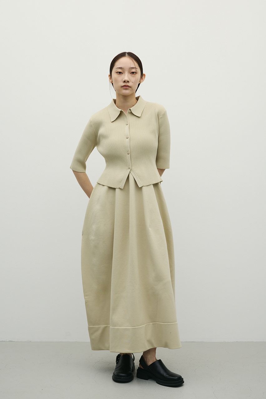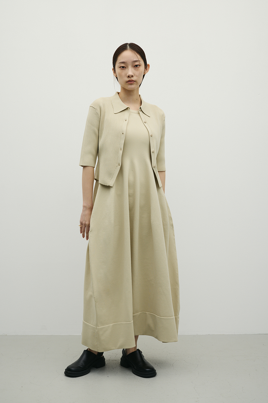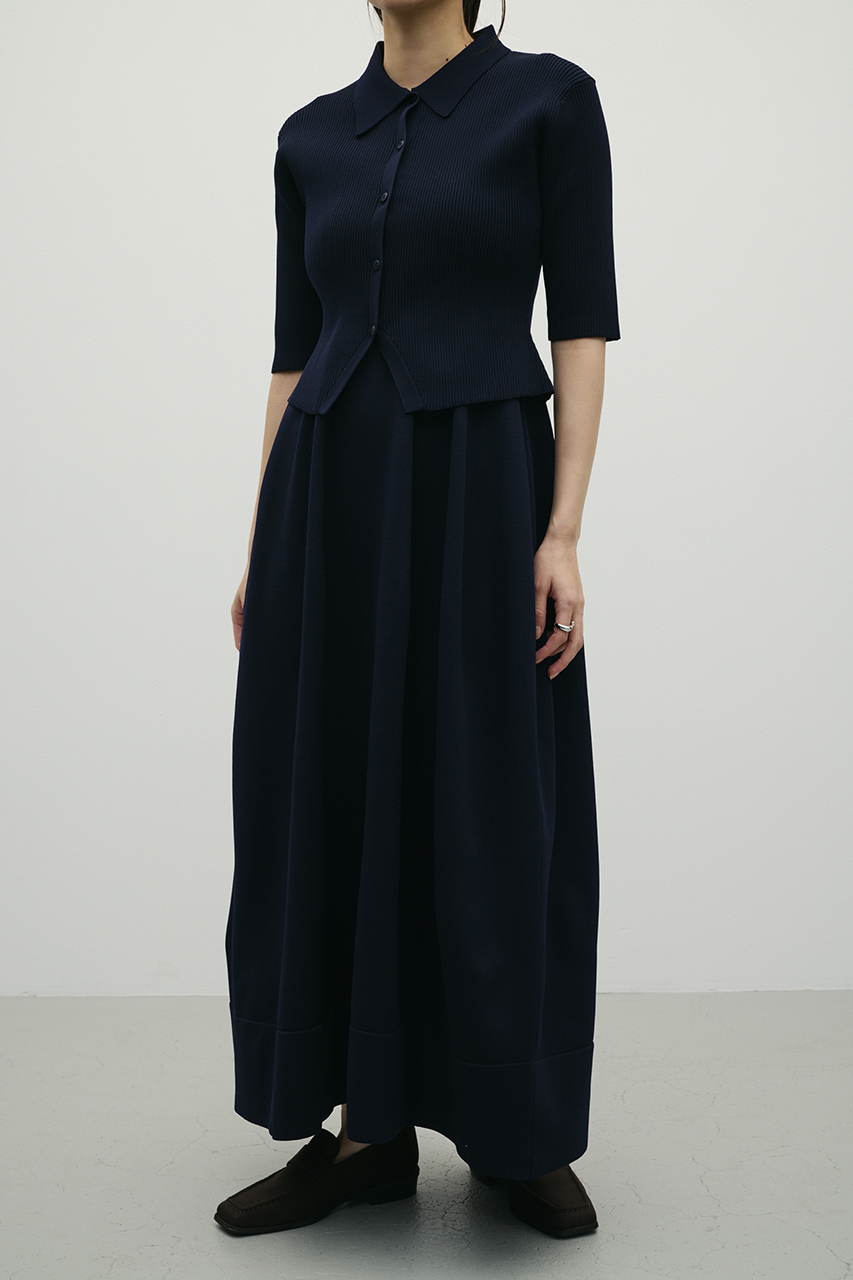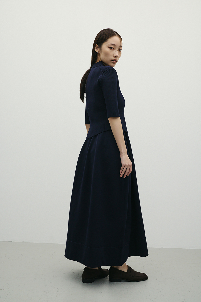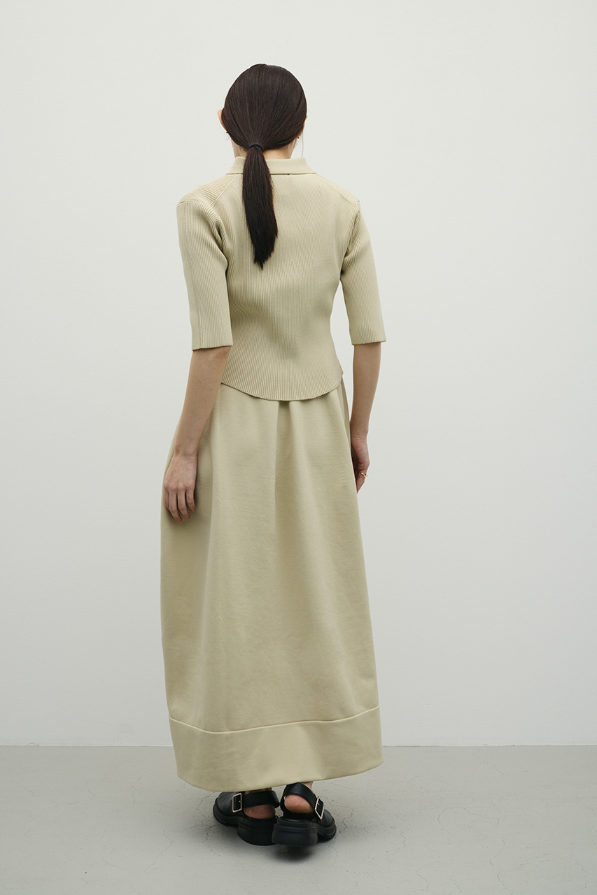 ポロニットとワンピースのセットアイテム。ワンピースはフォルム感のあるスカートシルエットにこだわり、上品でスタイルアップが叶う一枚。しっかりとしたリブ編みで仕上げているのでボディーラインがひびきにくいのもうれしいポイントです。ワンピースはポロニットの上からも着用頂けるので、様々なスタイリングを楽しんでいただけます。ストレッチあり、透け感なし。