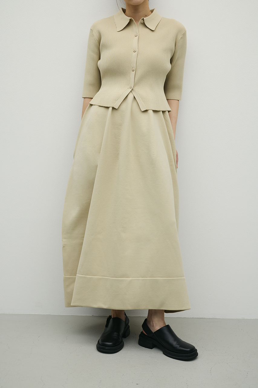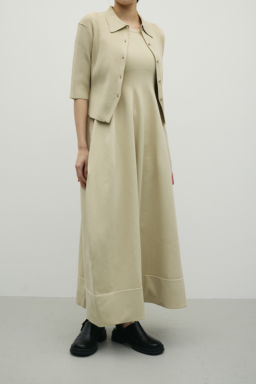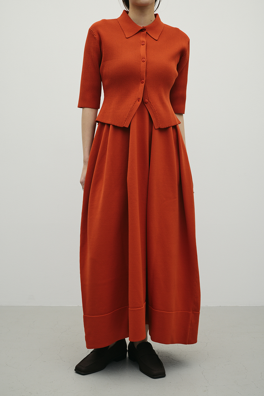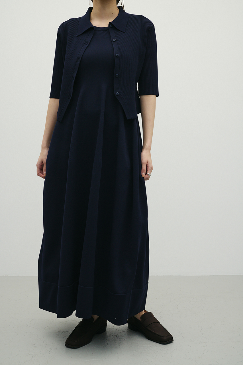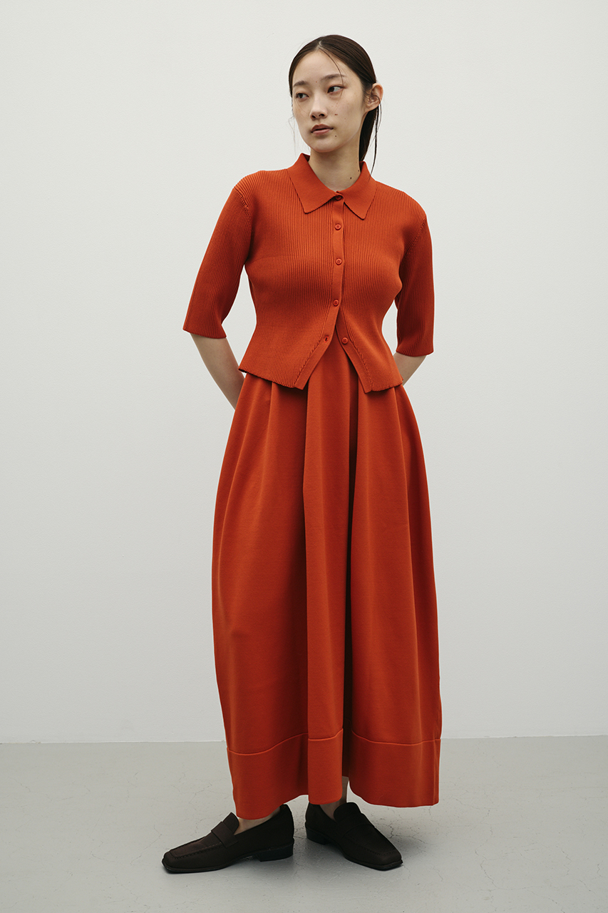 ポロニットとワンピースのセットアイテム。ワンピースはフォルム感のあるスカートシルエットにこだわり、上品でスタイルアップが叶う一枚。しっかりとしたリブ編みで仕上げているのでボディーラインがひびきにくいのもうれしいポイントです。ワンピースはポロニットの上からも着用頂けるので、様々なスタイリングを楽しんでいただけます。ストレッチあり、透け感なし。