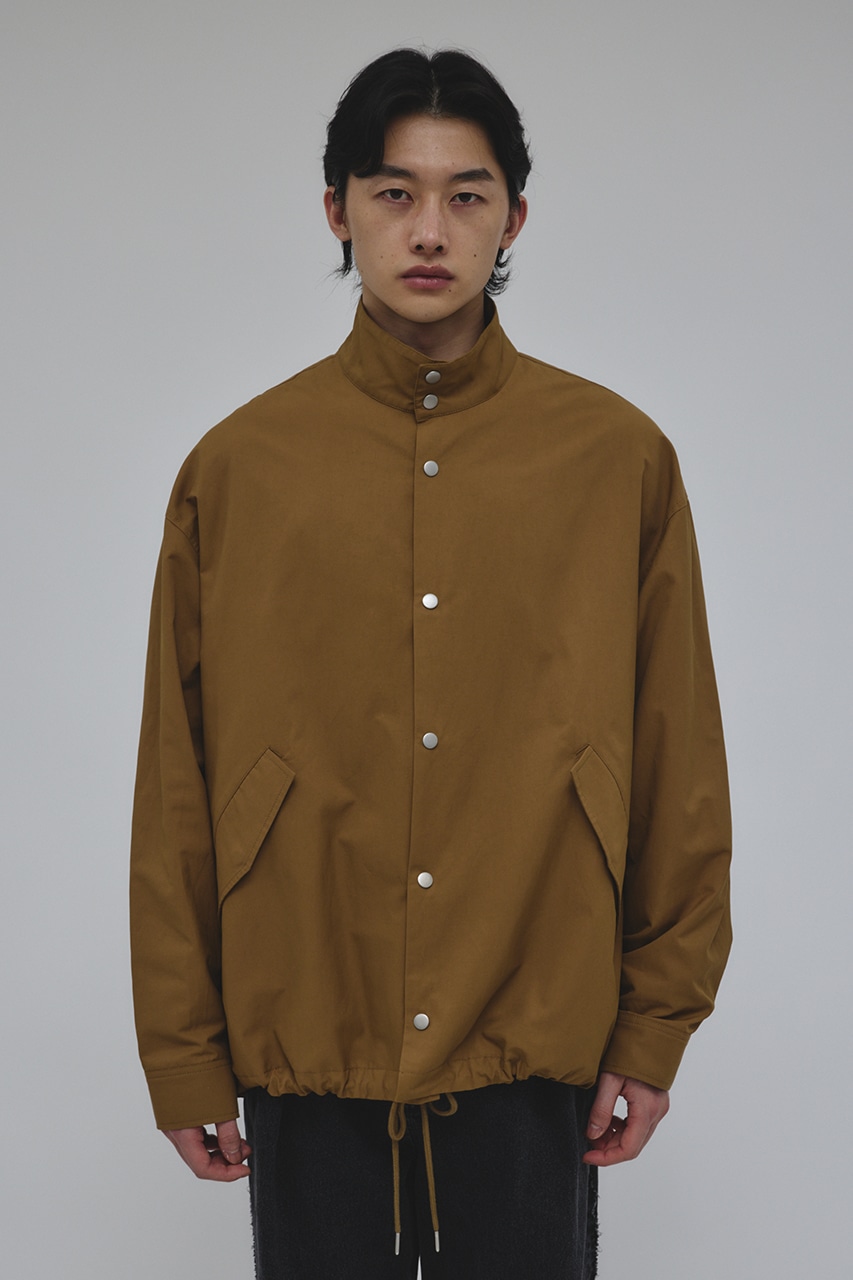 コットンナイロン混紡糸を使用したハリとコシのあるしっかりとした厚みのある生地で仕上げたブルゾン。コーチジャケットとモッズコートのデザインをミックスしたようなデザインがポイント。ワイドシルエットで裾のドローコードを絞ることでシルエット変化が可能です。ストレッチなし、透け感なし。