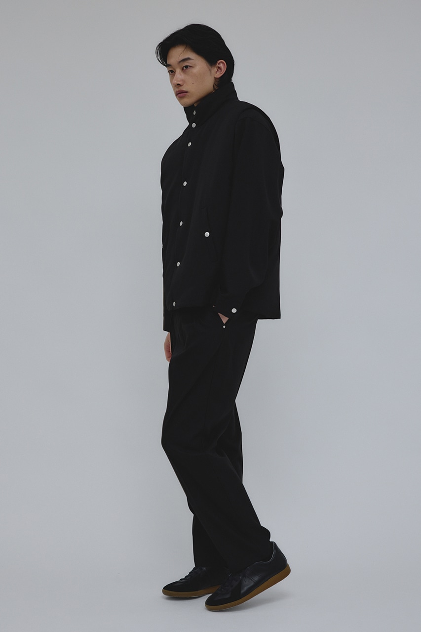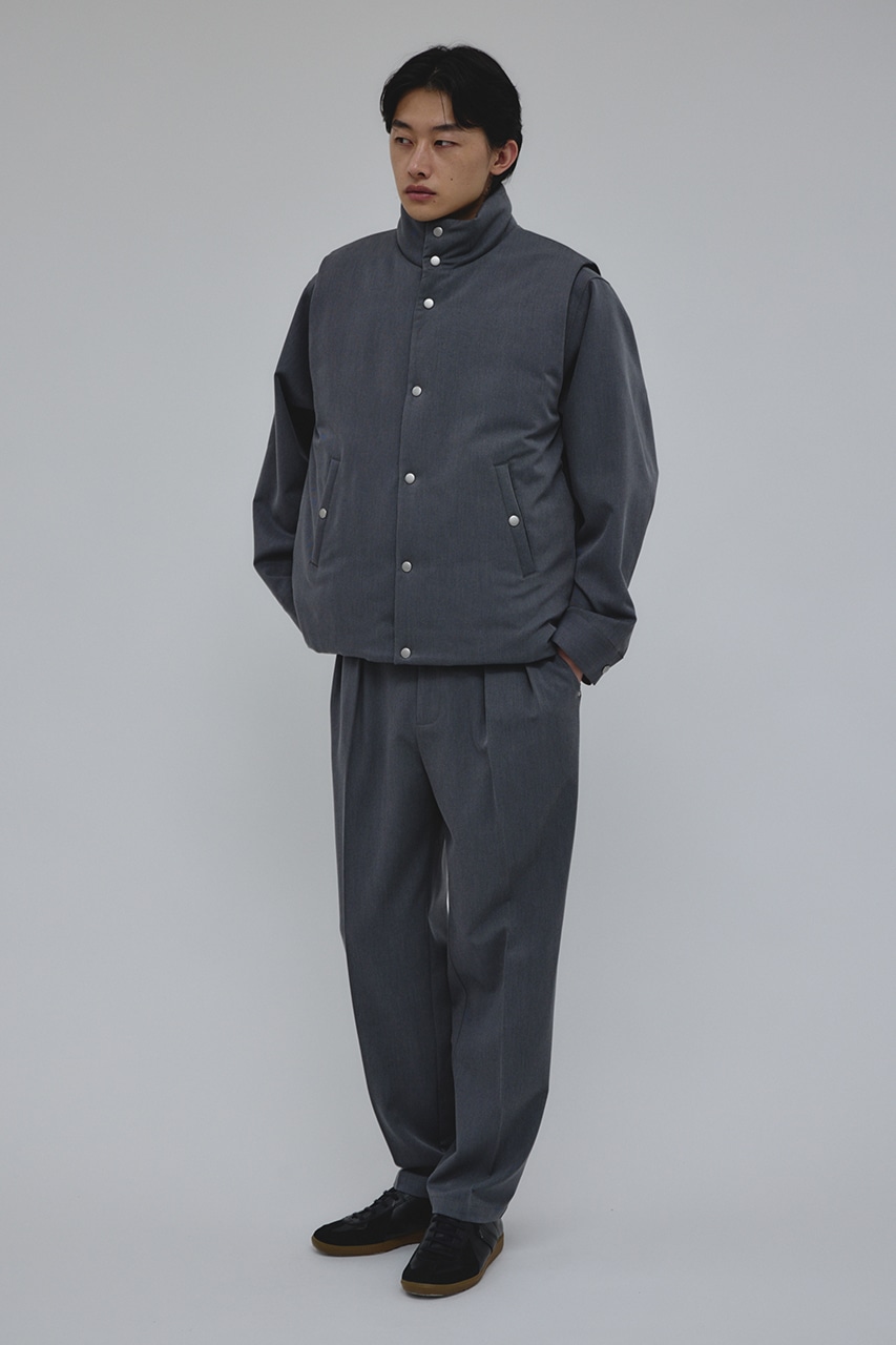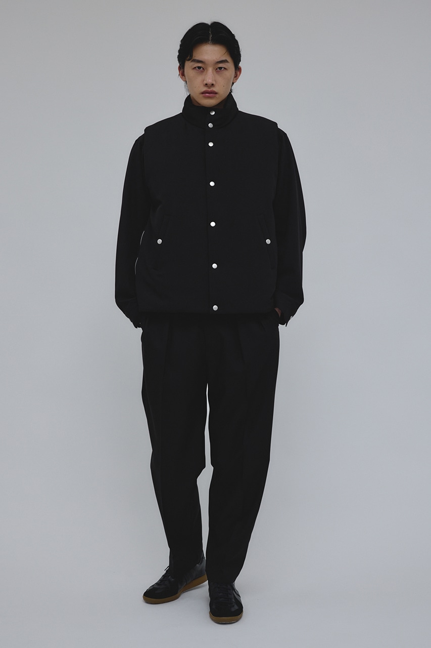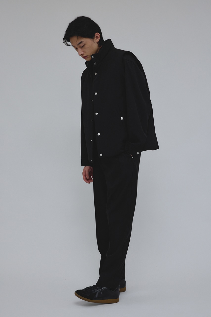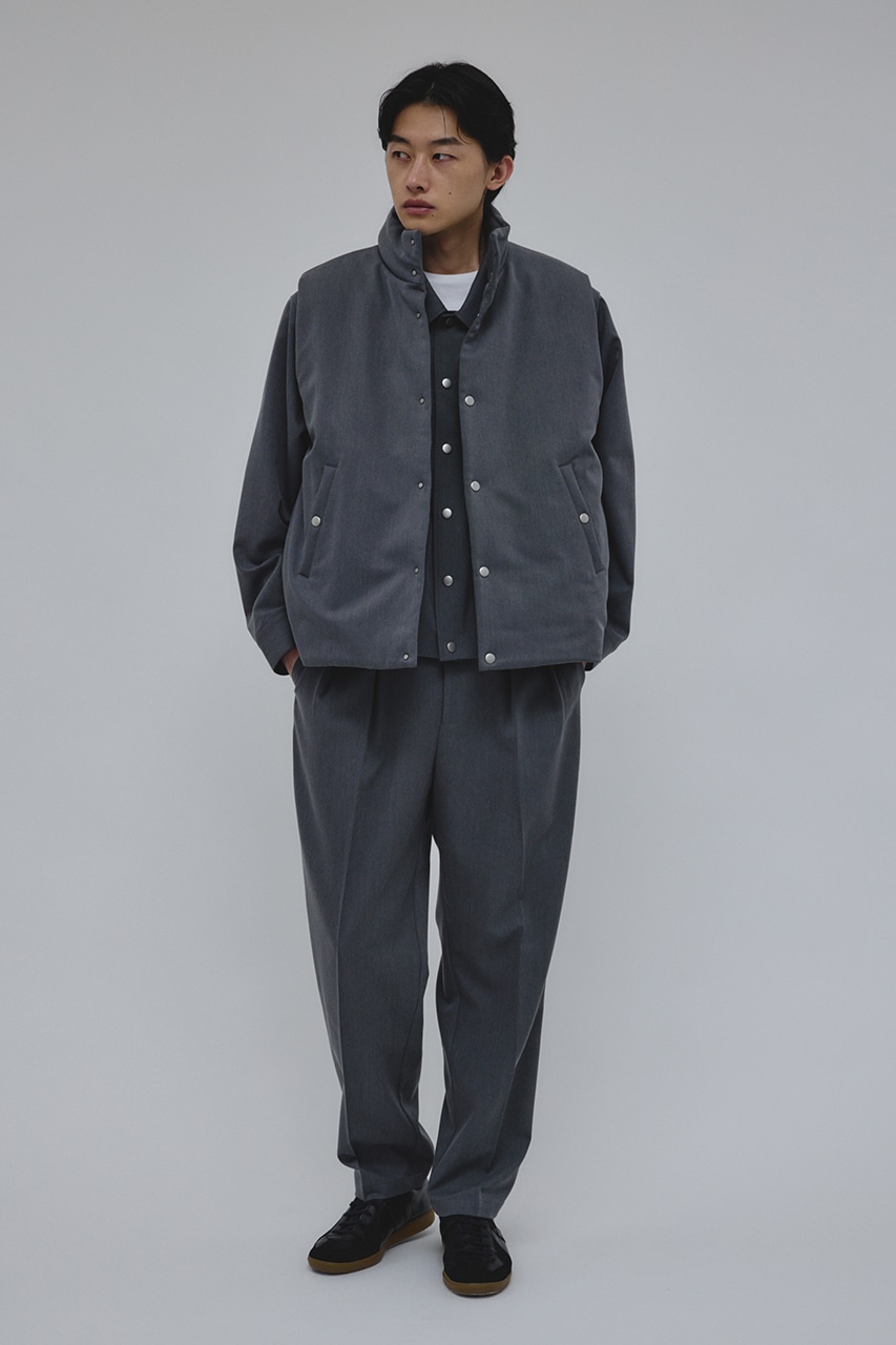 カジュアルながらも綺麗めの表情を持ったウールライクなポリエステルレーヨンツイルを使用したベスト。サイドファスナーの開閉で多様なスタイリングやレイヤードが楽しめます。ニットやカットソー、ジャケットの上からでも重ね着出来る汎用性の高さがポイントです。501IAK30-0091(シャーリングヘムジャケット)、501IAK31-0061(2タックテーパードパンツ)とセットアップ着用可能。ストレッチなし、透け感無し。