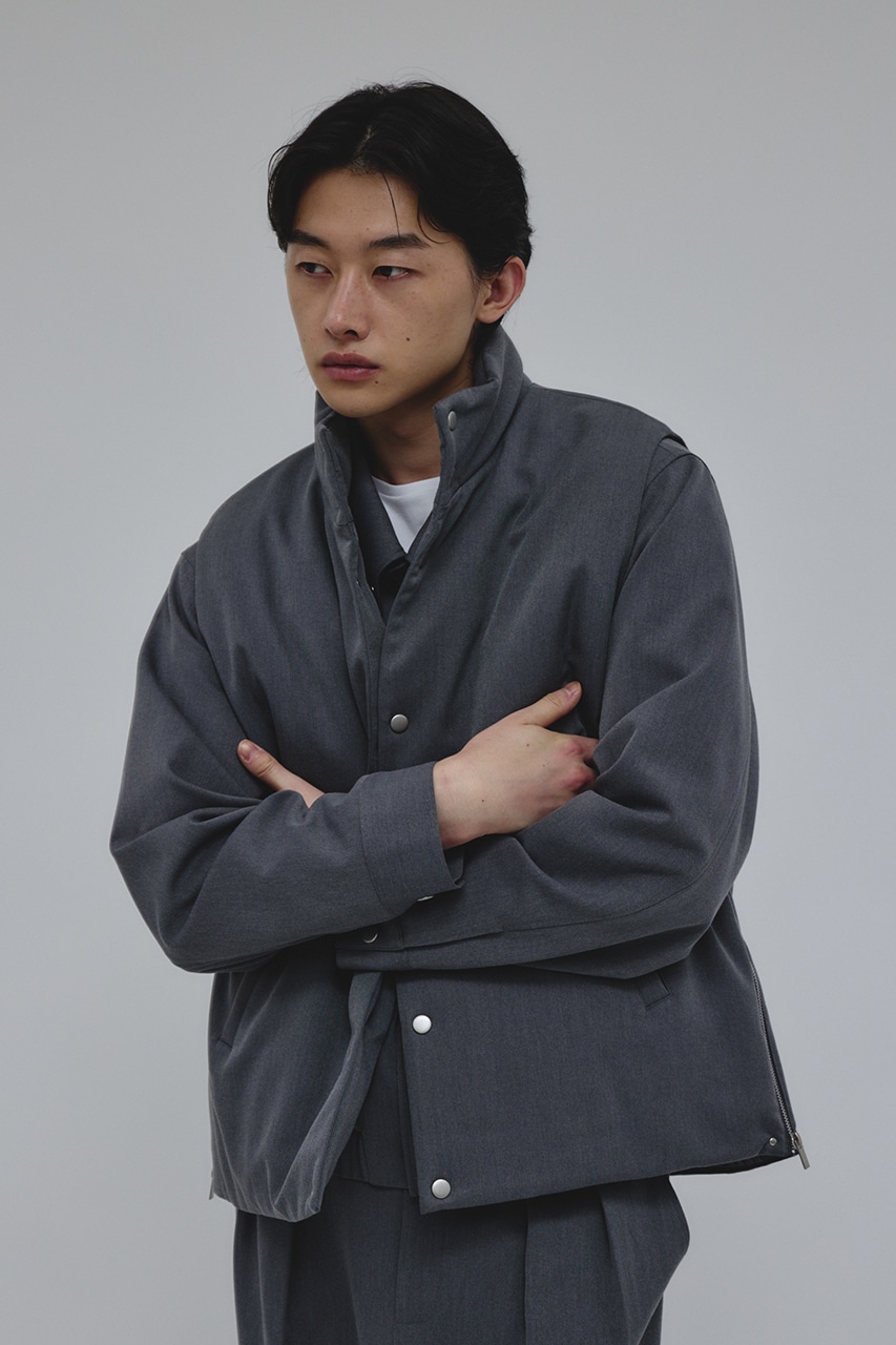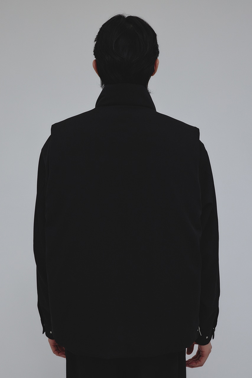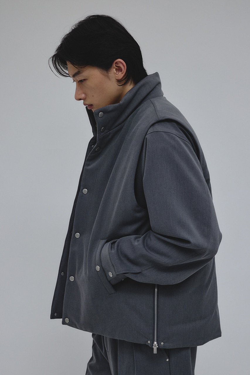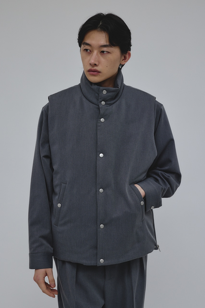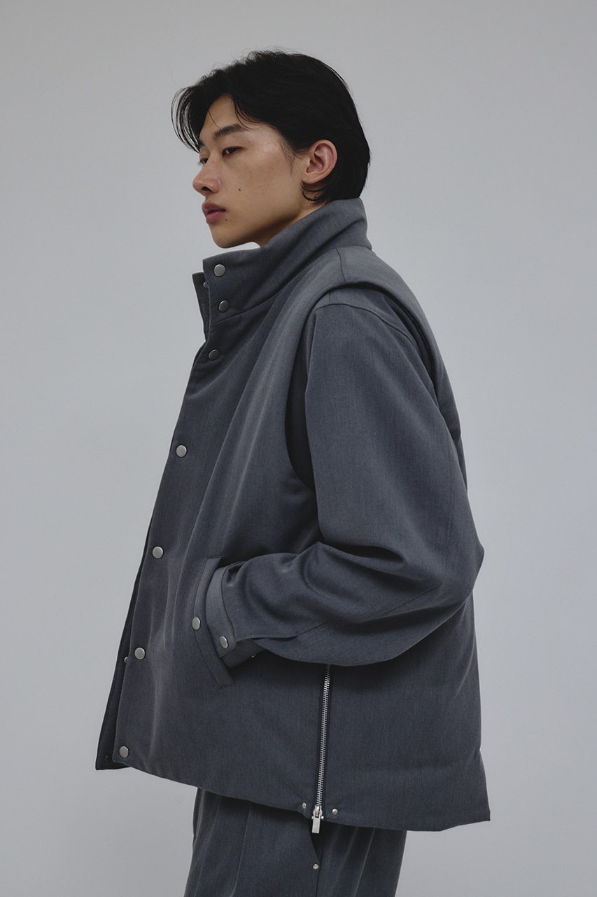 カジュアルながらも綺麗めの表情を持ったウールライクなポリエステルレーヨンツイルを使用したベスト。サイドファスナーの開閉で多様なスタイリングやレイヤードが楽しめます。ニットやカットソー、ジャケットの上からでも重ね着出来る汎用性の高さがポイントです。501IAK30-0091(シャーリングヘムジャケット)、501IAK31-0061(2タックテーパードパンツ)とセットアップ着用可能。ストレッチなし、透け感無し。