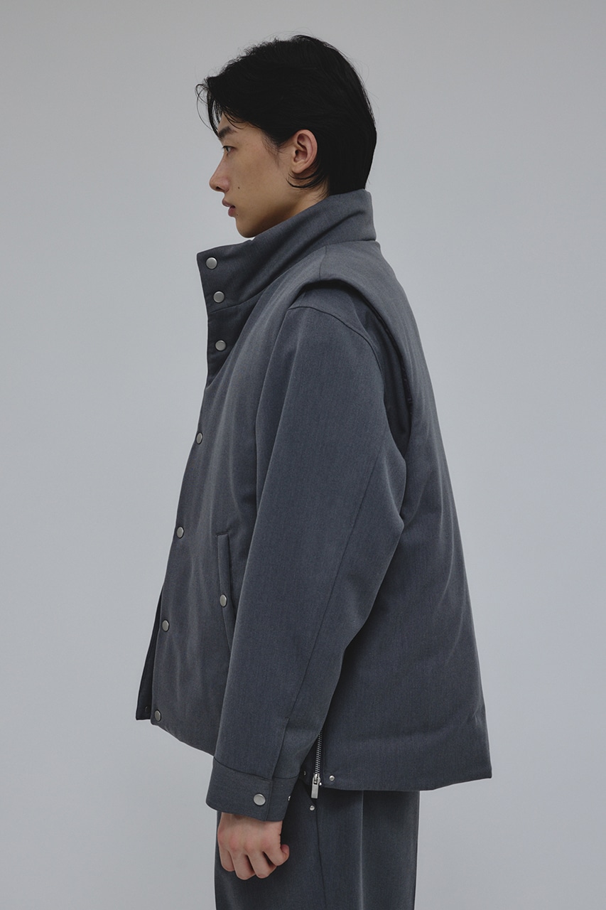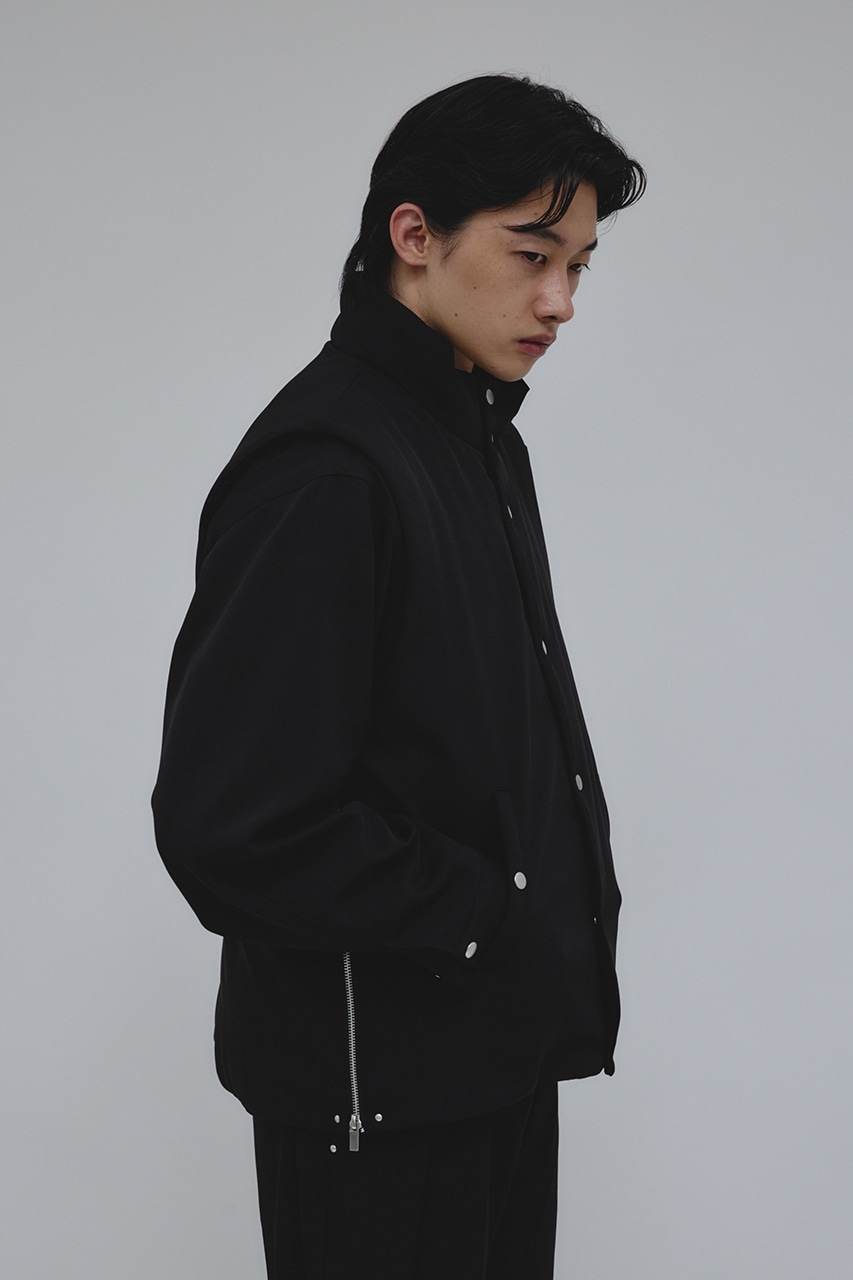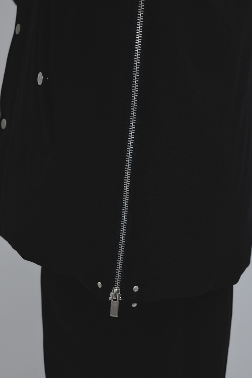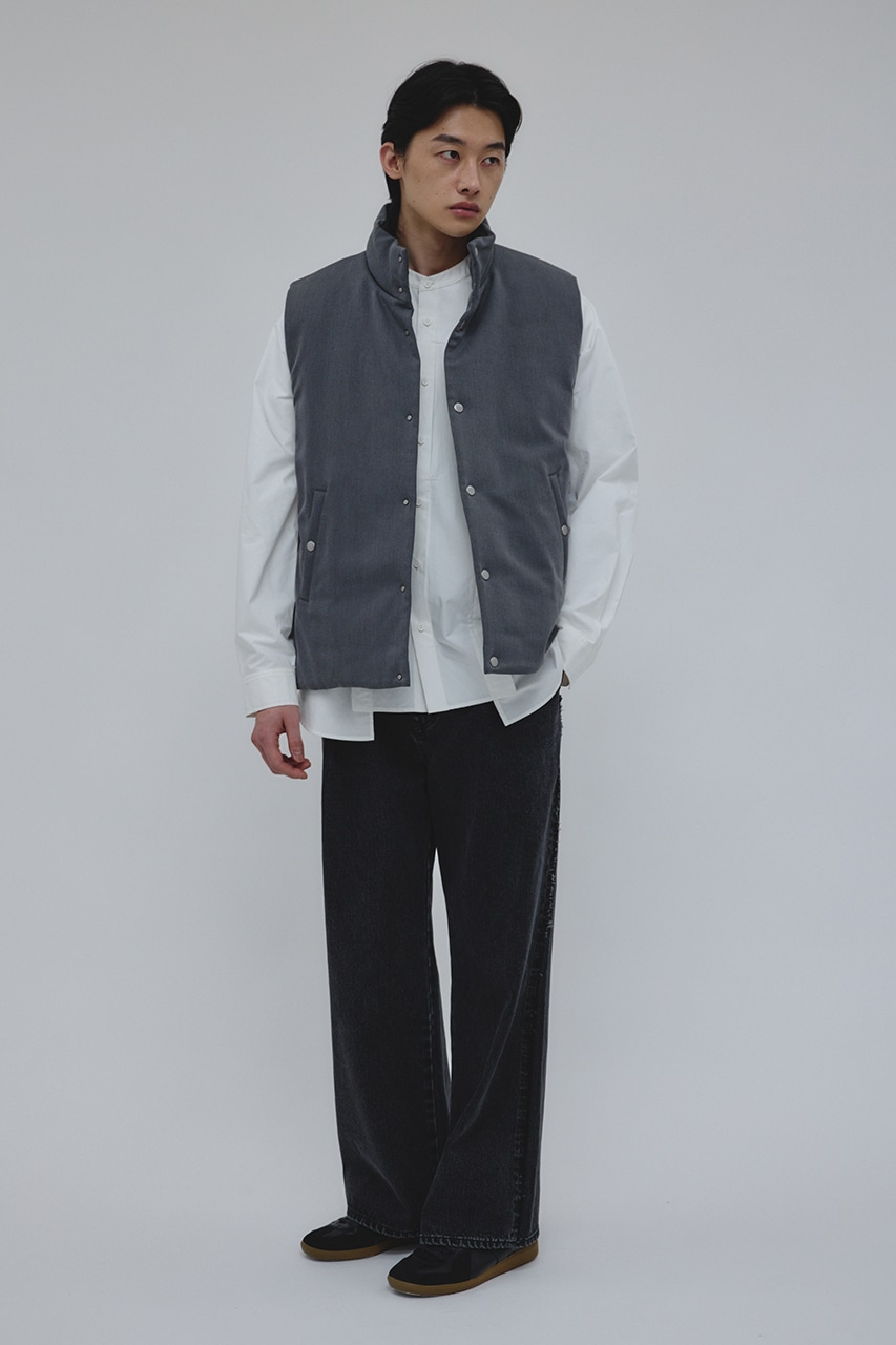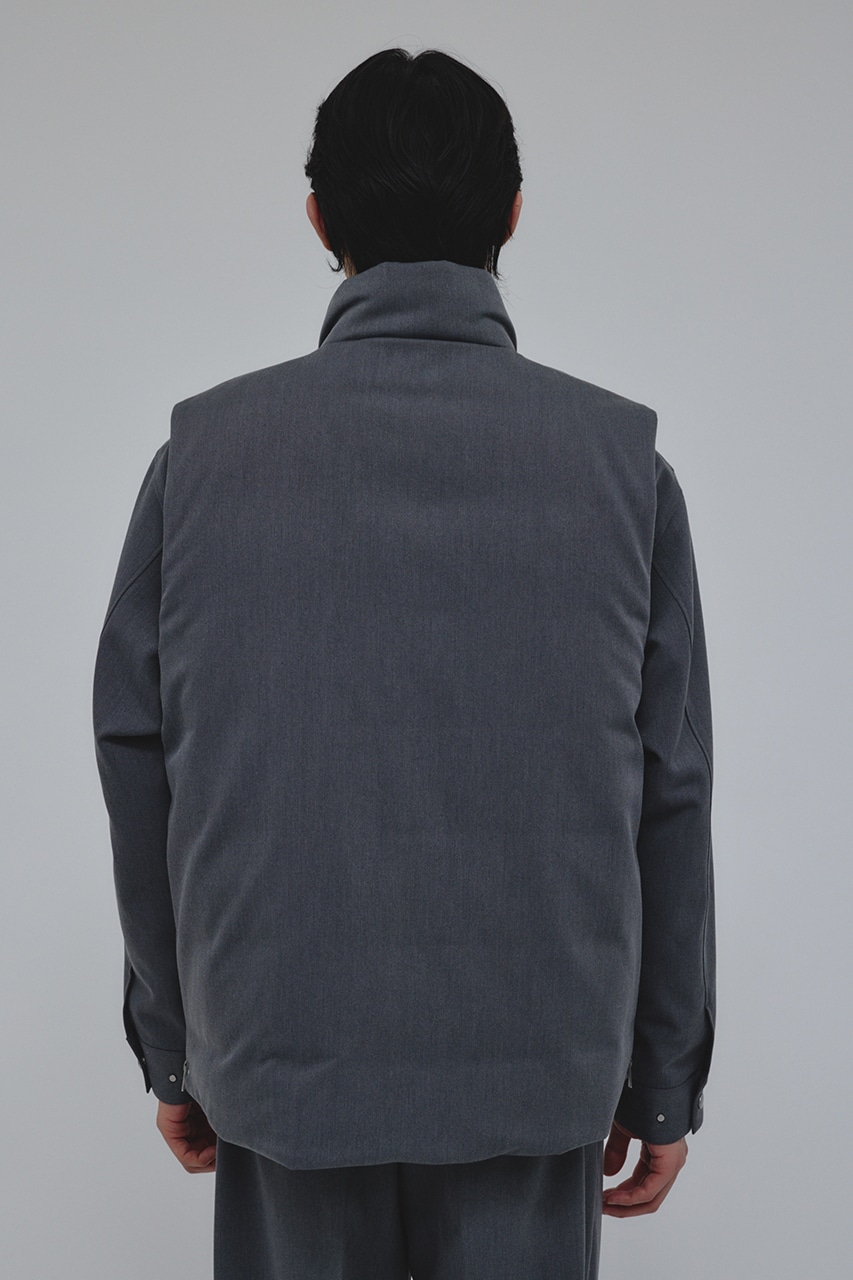 カジュアルながらも綺麗めの表情を持ったウールライクなポリエステルレーヨンツイルを使用したベスト。サイドファスナーの開閉で多様なスタイリングやレイヤードが楽しめます。ニットやカットソー、ジャケットの上からでも重ね着出来る汎用性の高さがポイントです。501IAK30-0091(シャーリングヘムジャケット)、501IAK31-0061(2タックテーパードパンツ)とセットアップ着用可能。ストレッチなし、透け感無し。