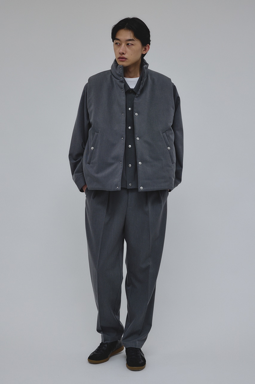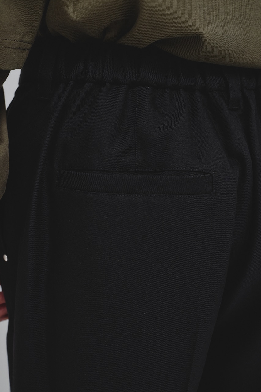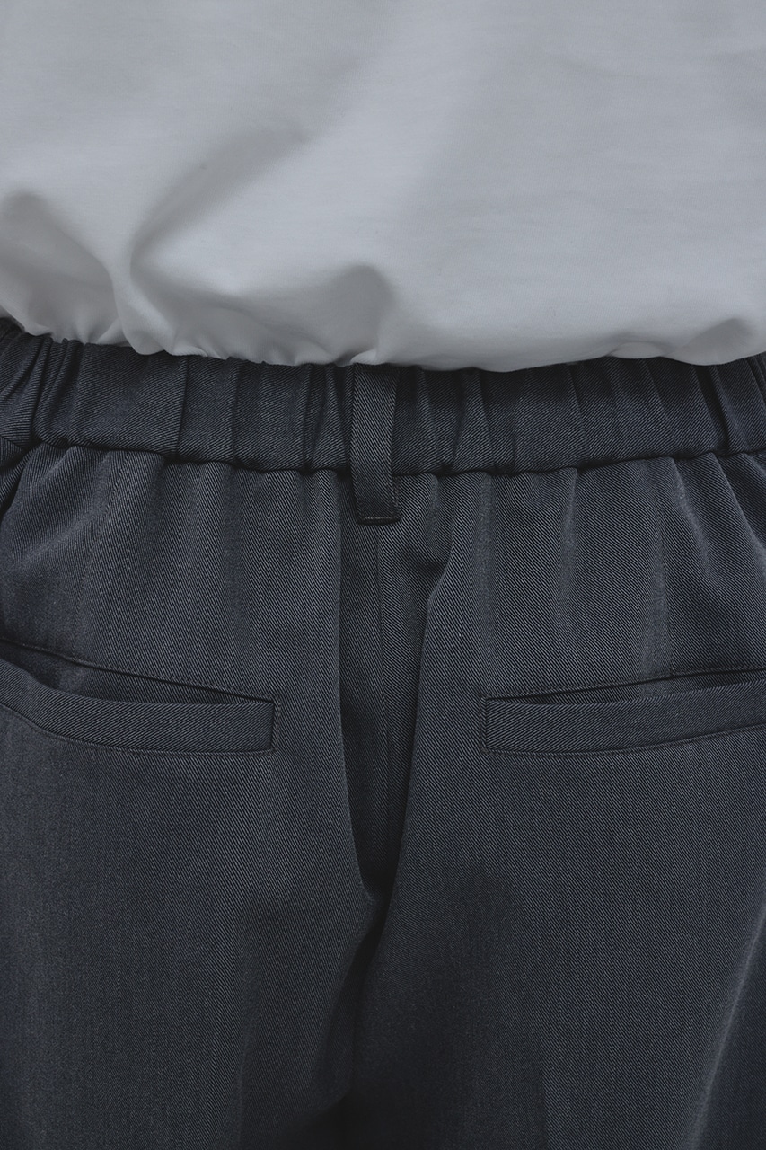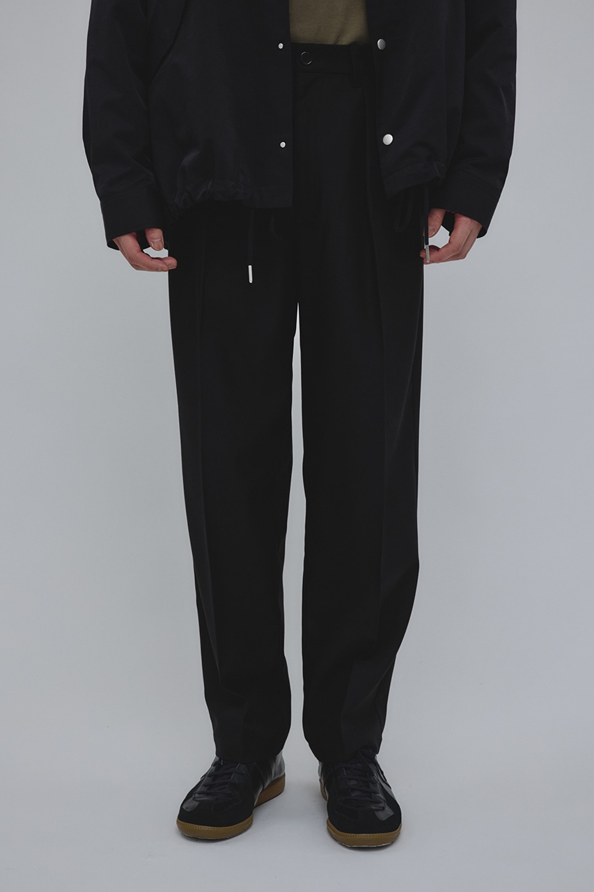 カジュアルながらも綺麗めの表情を持った、ウールライクなポリエステルレーヨンツイルを使用したパンツ。ヒップと渡りにゆとりを持たせたすっきりとしたテーパードシルエットでスタイルアップ出来る一枚。ウエストはシャーリング仕様。ベルト着用も対応可能です。501IAK30-0101(サイドジップパッファーベスト)、501IAK30-0091(シャーリングヘムジャケット)とセットアップ着用可能。ストレッチなし、透け感無し。