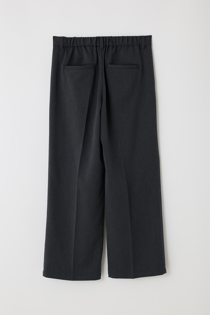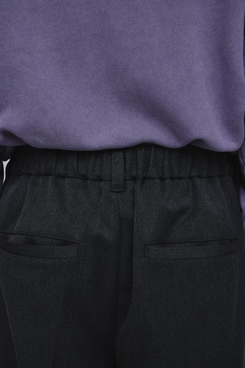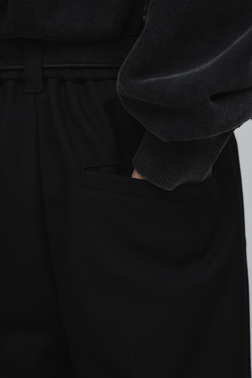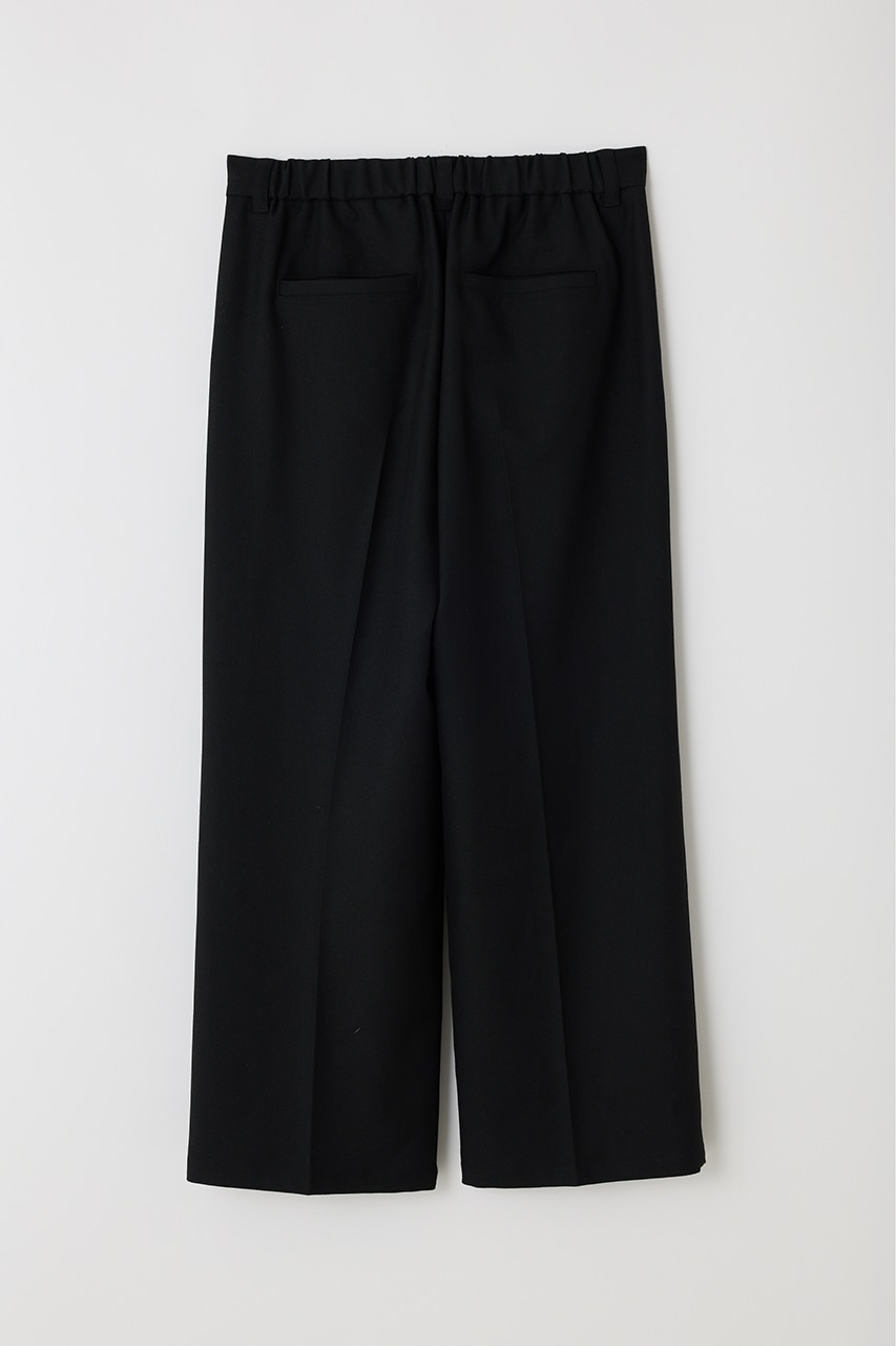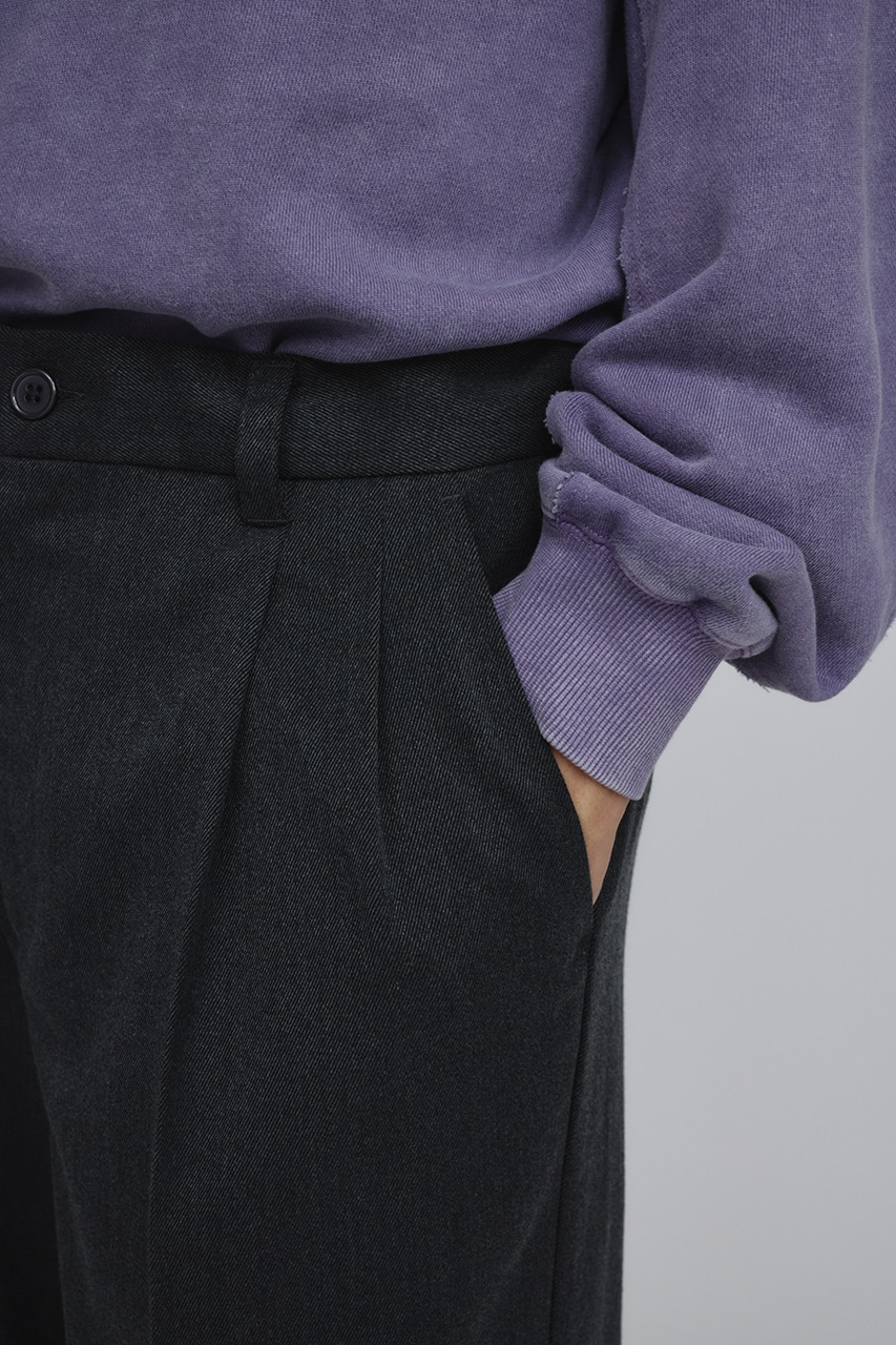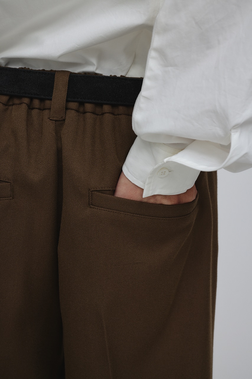 ウォーム感のあるTRツイルを使用したクリーンな表面感でしわになりにくく、落ち感のあるワイドトラウザー。ヒップ周りは2タックでゆとりを持たせ、着用頂きやすいように緩やかにワイドにテーパードするように仕上げた一枚。ウエスト背面側はシャーリング、フロント内部はスピンドルが入っているので、ストレスフリーに着用いただけます。透け感なし。ストレッチなし。