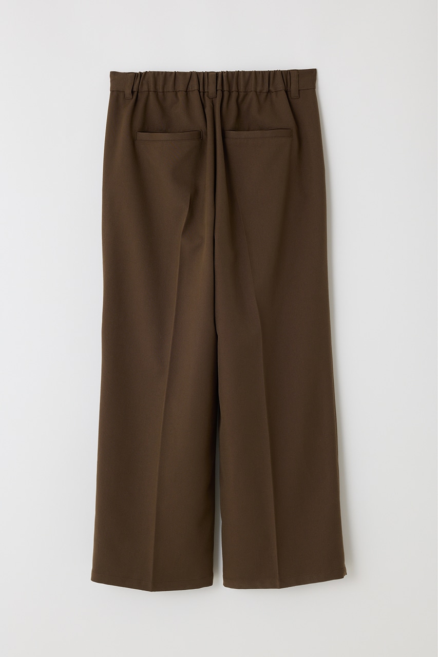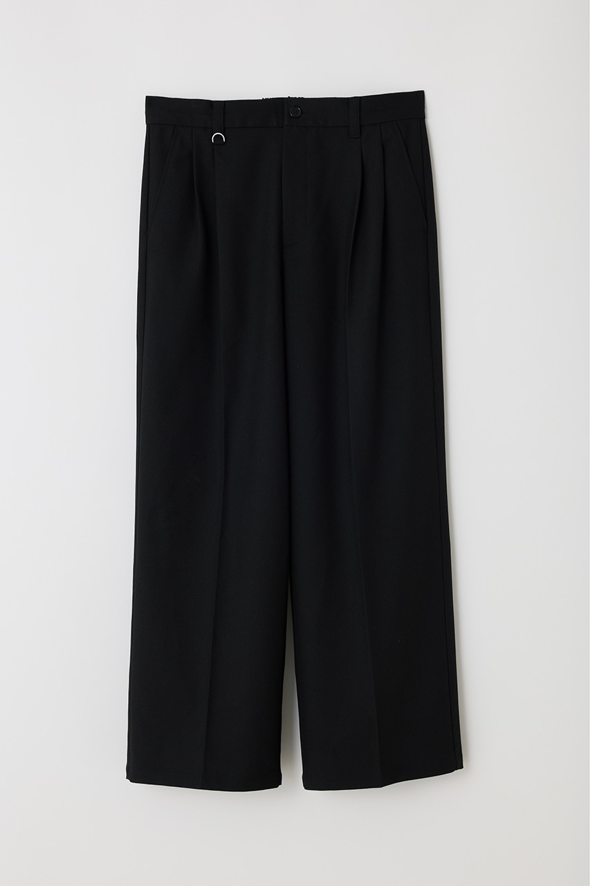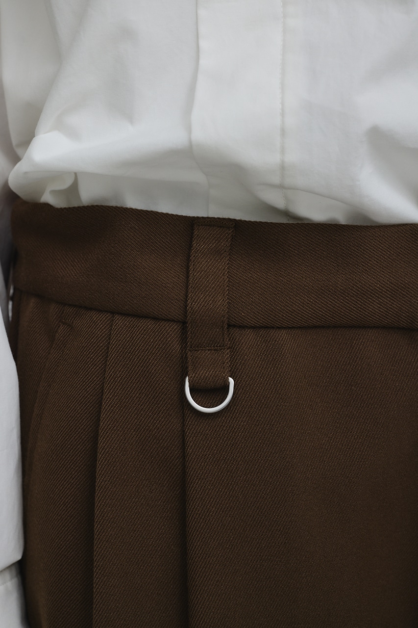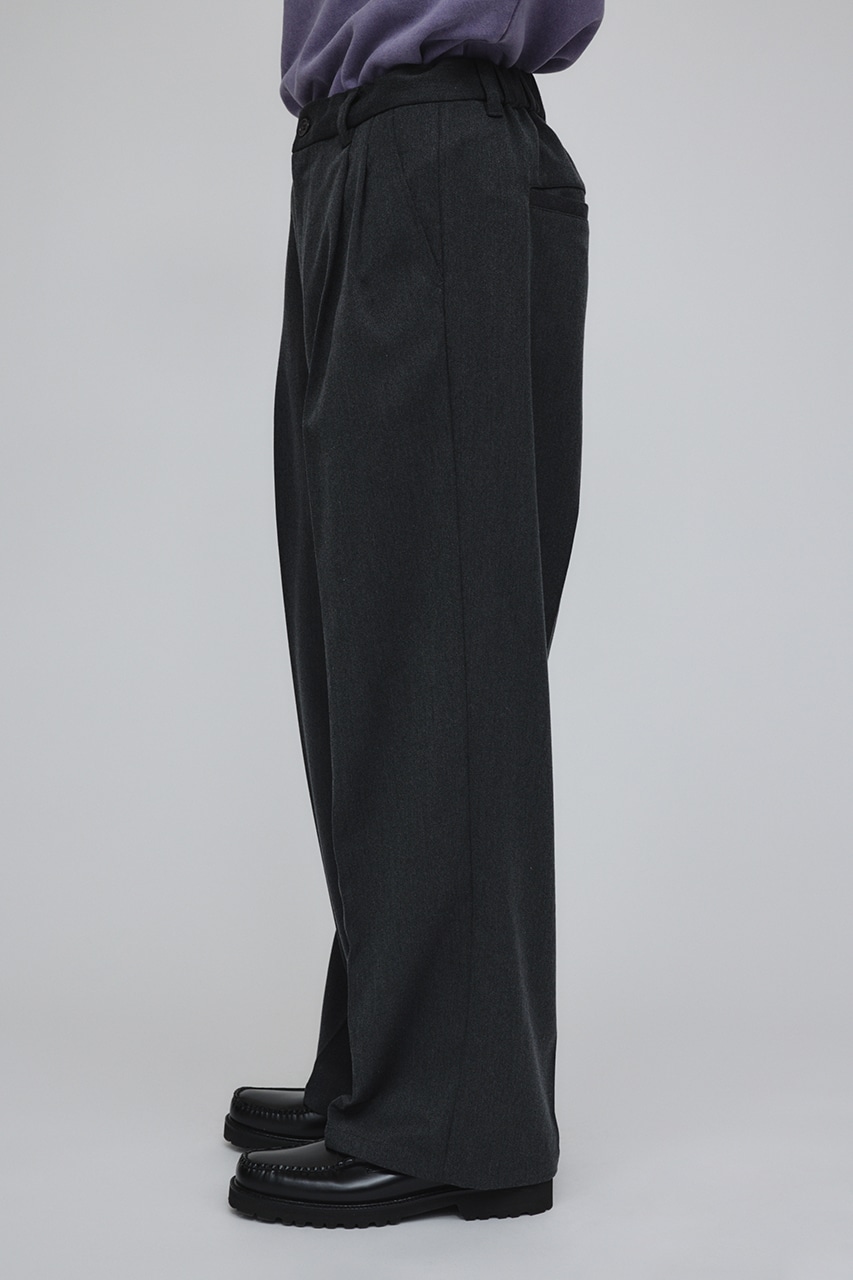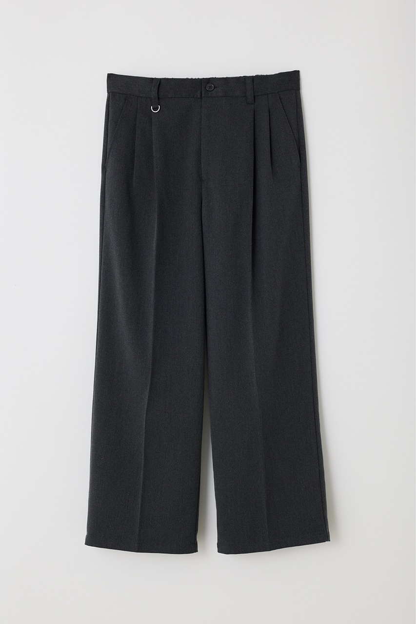 ウォーム感のあるTRツイルを使用したクリーンな表面感でしわになりにくく、落ち感のあるワイドトラウザー。ヒップ周りは2タックでゆとりを持たせ、着用頂きやすいように緩やかにワイドにテーパードするように仕上げた一枚。ウエスト背面側はシャーリング、フロント内部はスピンドルが入っているので、ストレスフリーに着用いただけます。透け感なし。ストレッチなし。