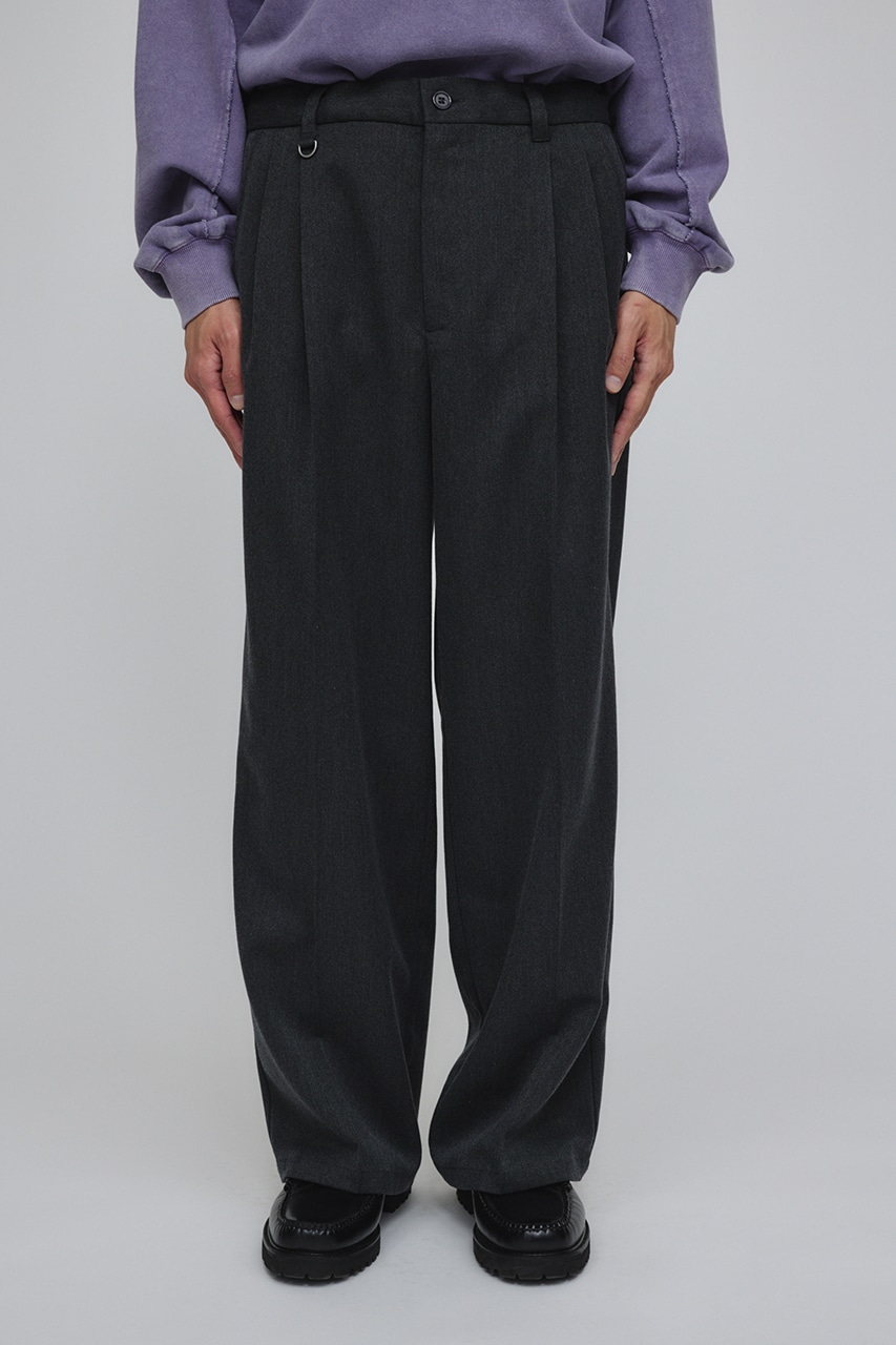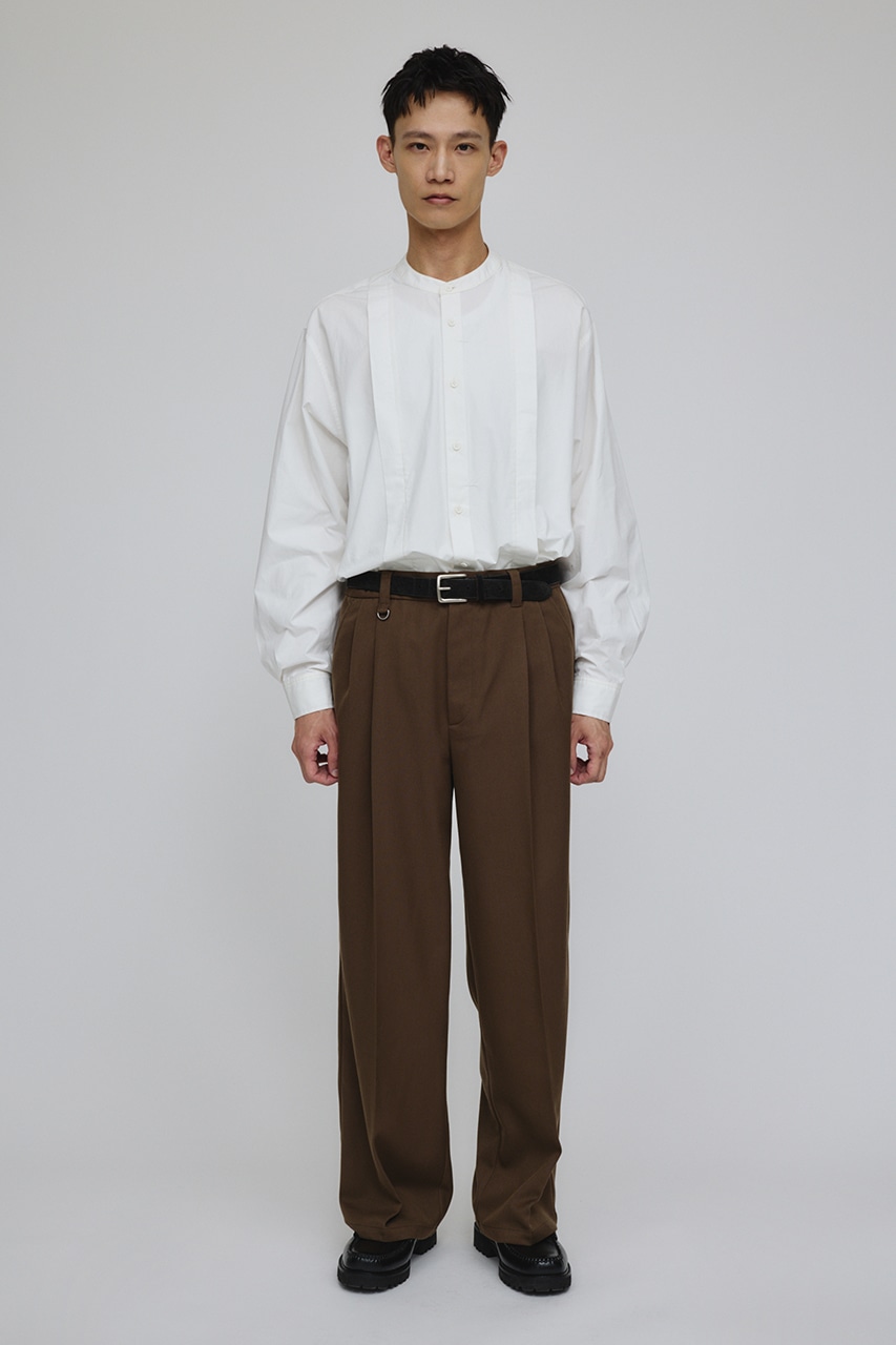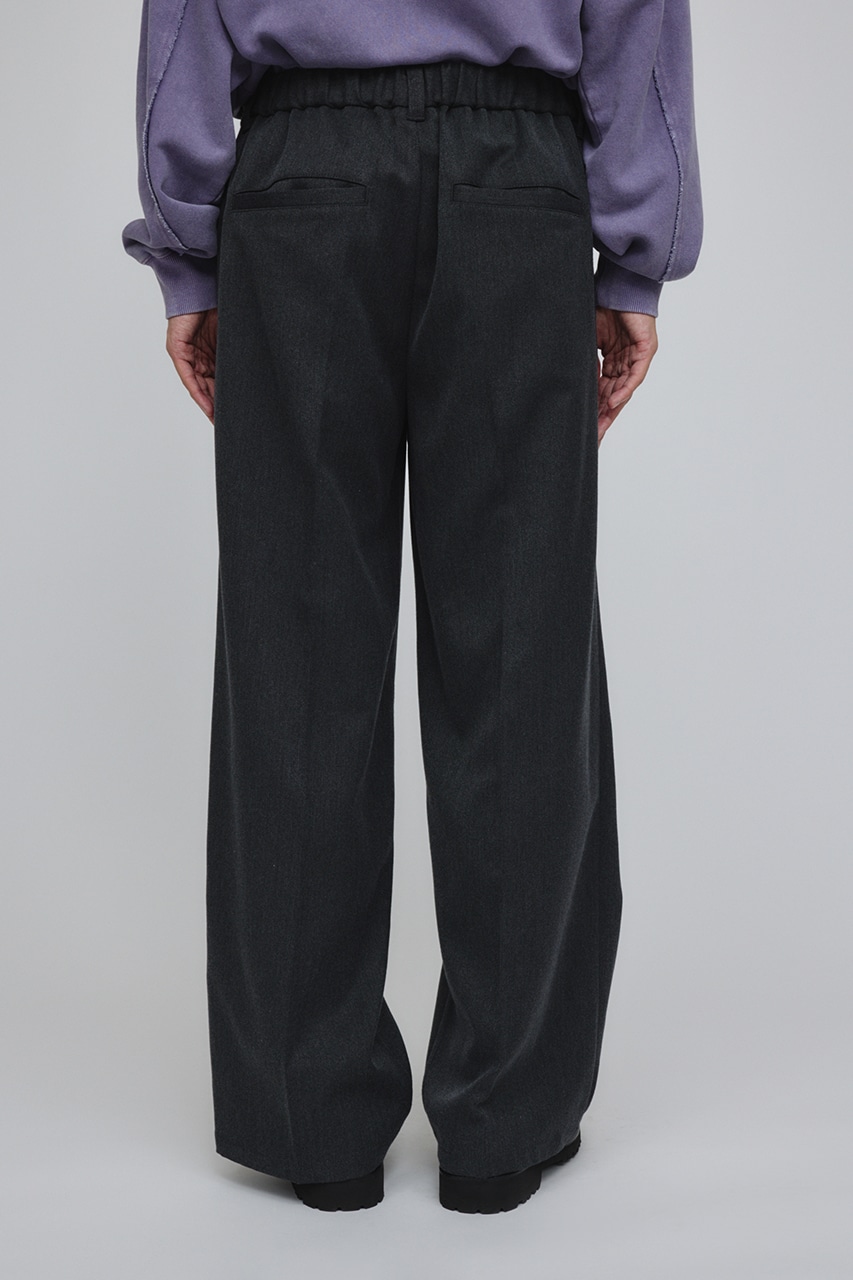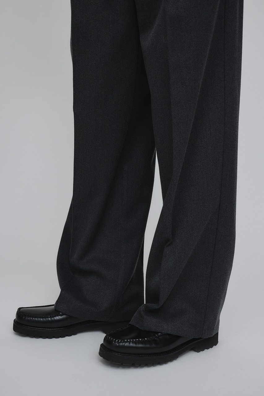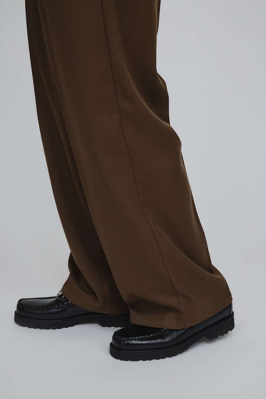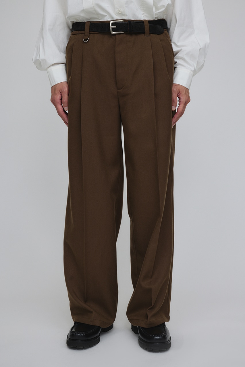 ウォーム感のあるTRツイルを使用したクリーンな表面感でしわになりにくく、落ち感のあるワイドトラウザー。ヒップ周りは2タックでゆとりを持たせ、着用頂きやすいように緩やかにワイドにテーパードするように仕上げた一枚。ウエスト背面側はシャーリング、フロント内部はスピンドルが入っているので、ストレスフリーに着用いただけます。透け感なし。ストレッチなし。