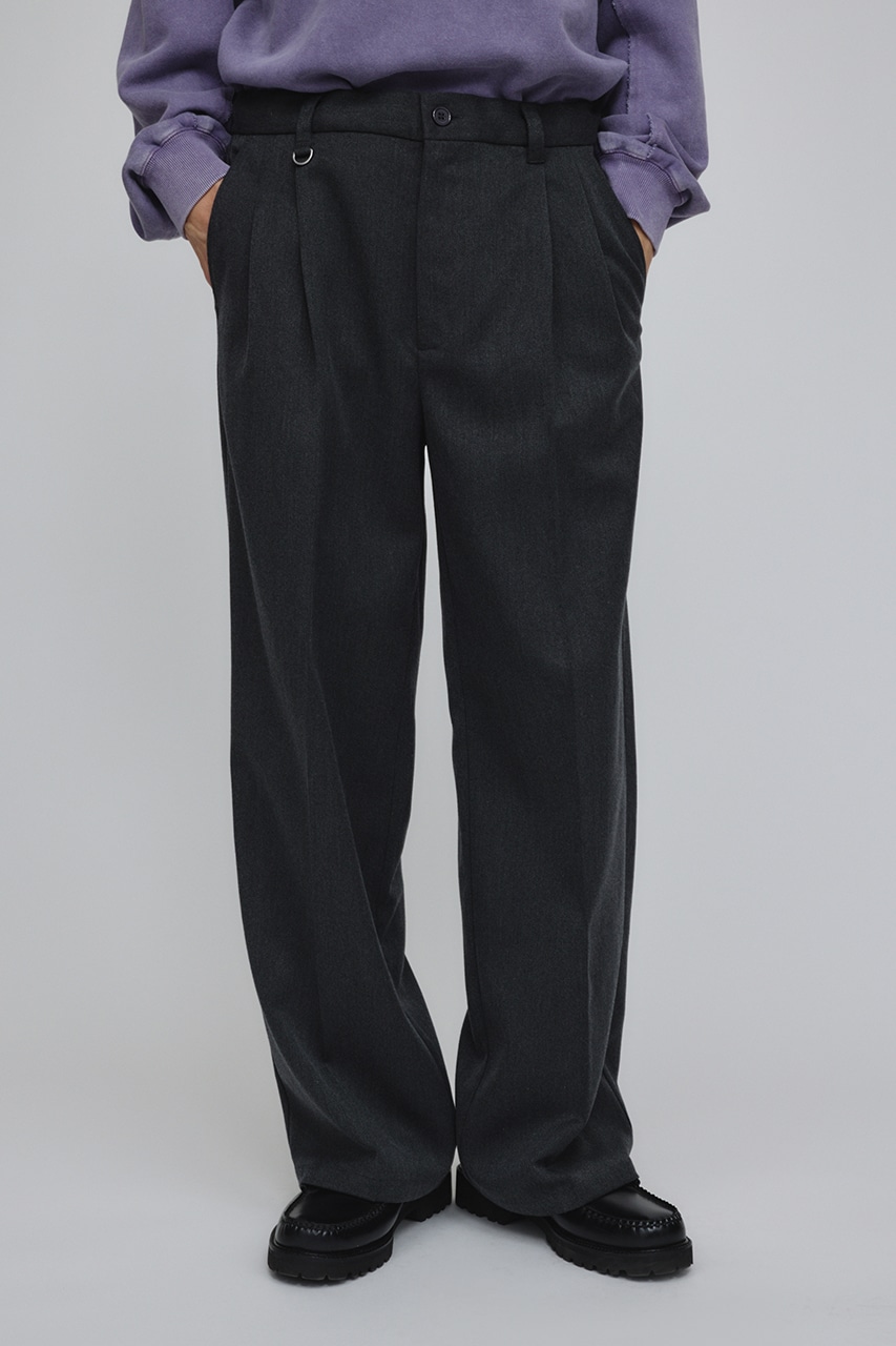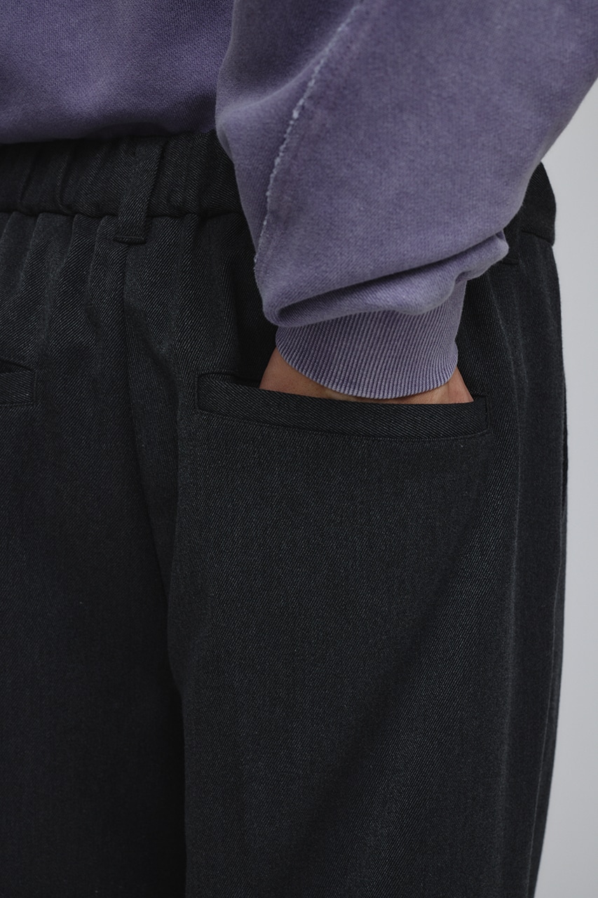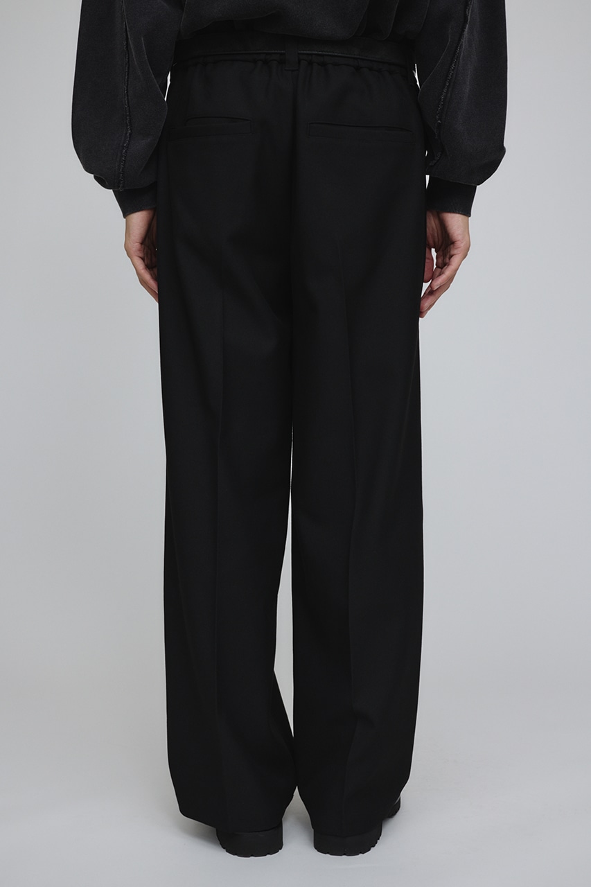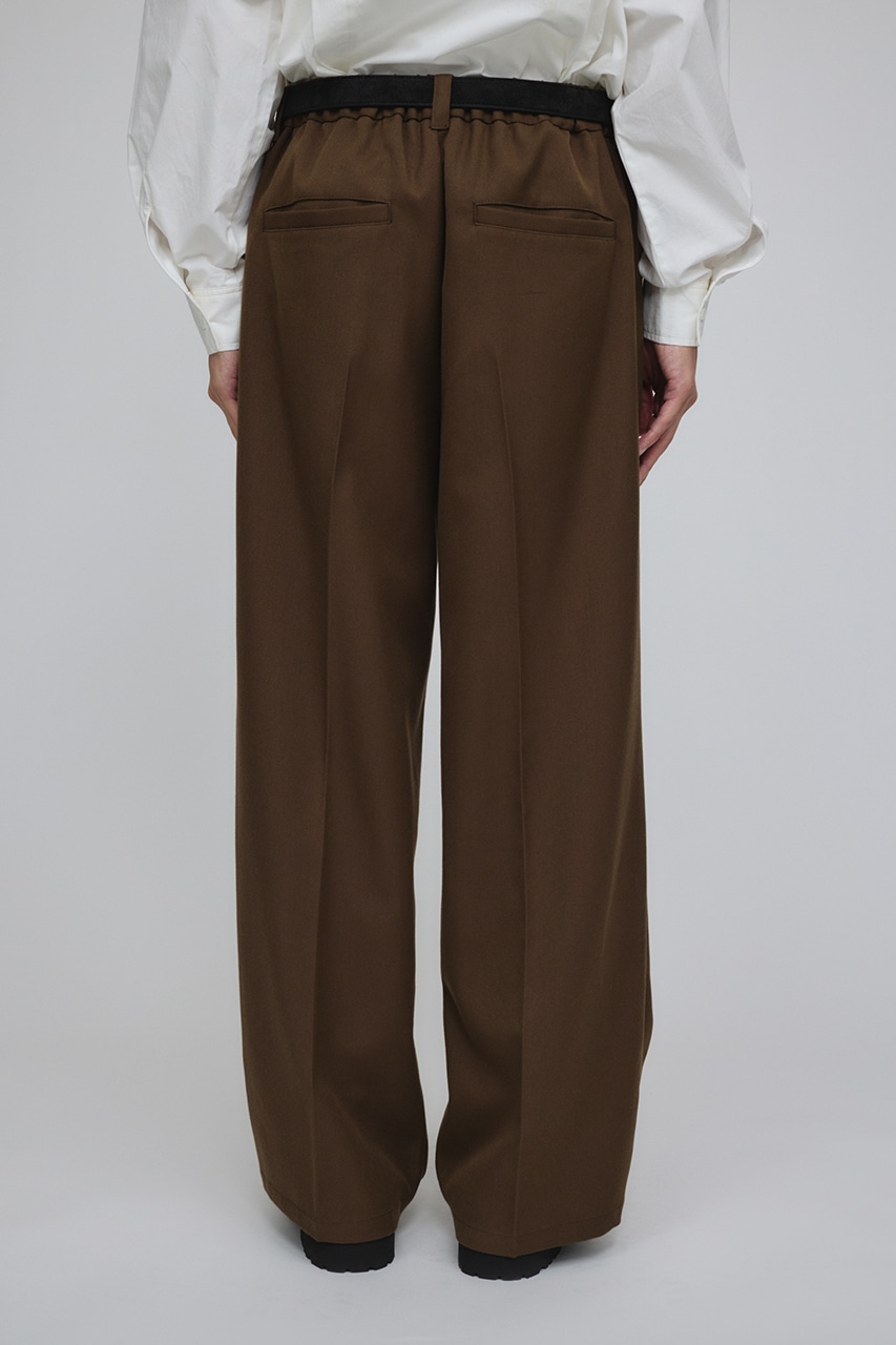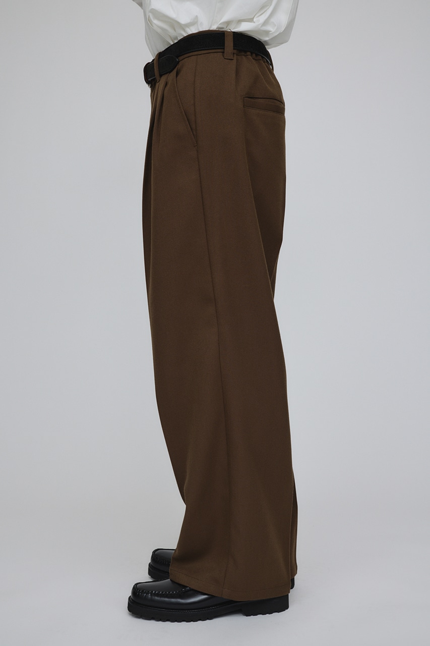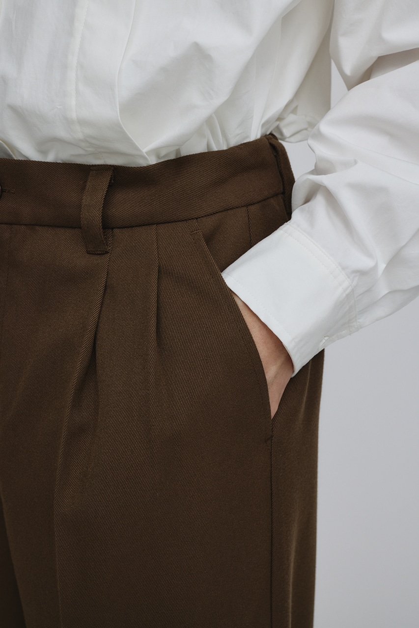 ウォーム感のあるTRツイルを使用したクリーンな表面感でしわになりにくく、落ち感のあるワイドトラウザー。ヒップ周りは2タックでゆとりを持たせ、着用頂きやすいように緩やかにワイドにテーパードするように仕上げた一枚。ウエスト背面側はシャーリング、フロント内部はスピンドルが入っているので、ストレスフリーに着用いただけます。透け感なし。ストレッチなし。