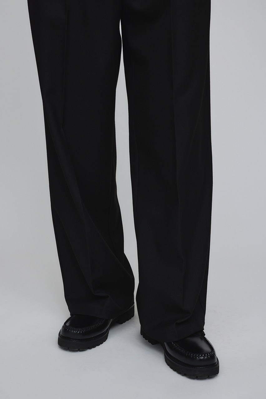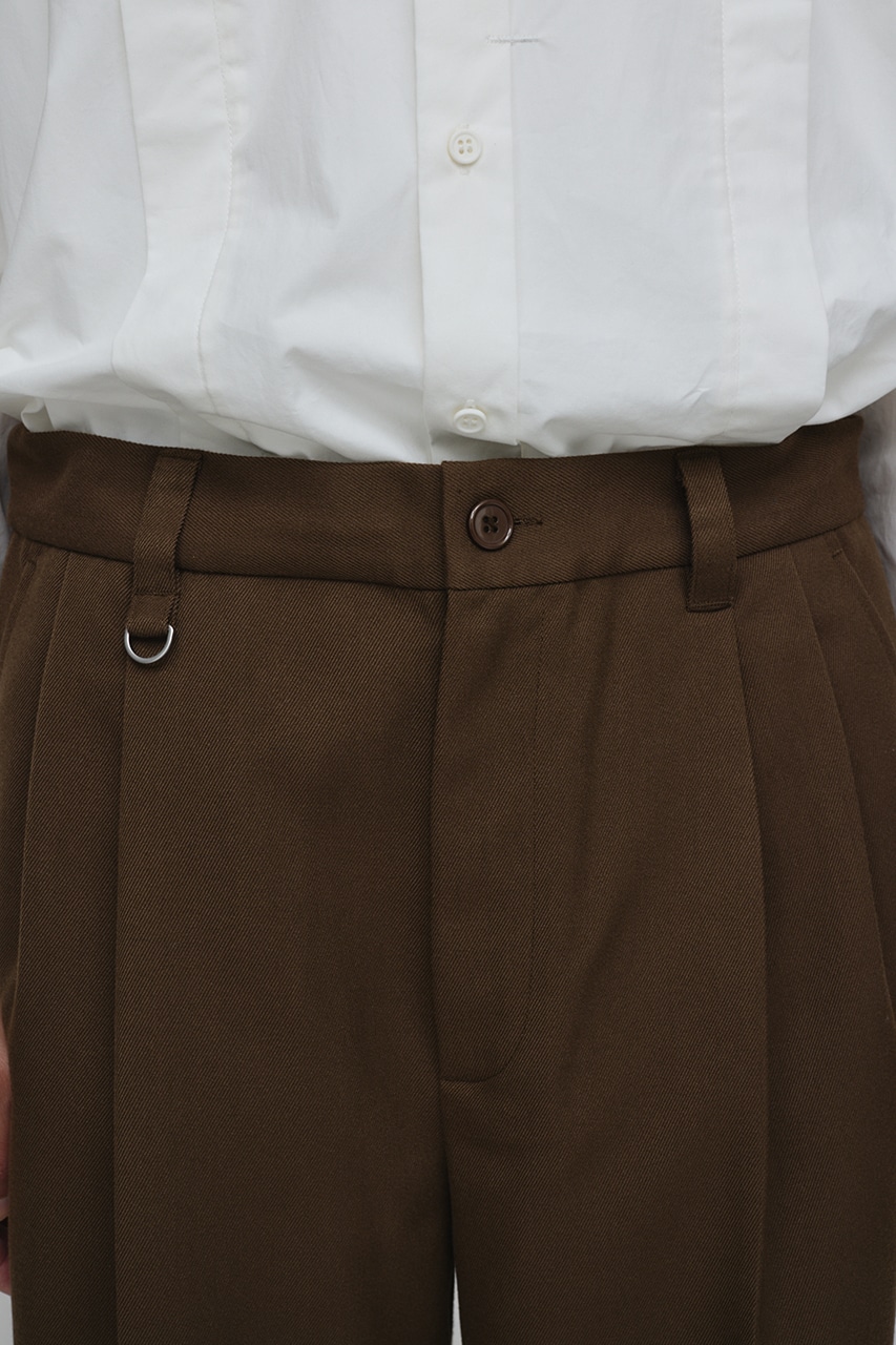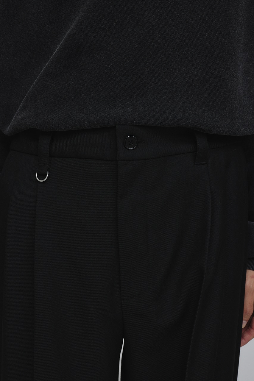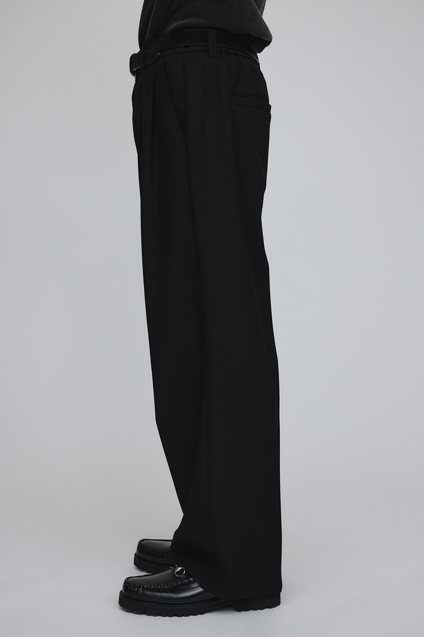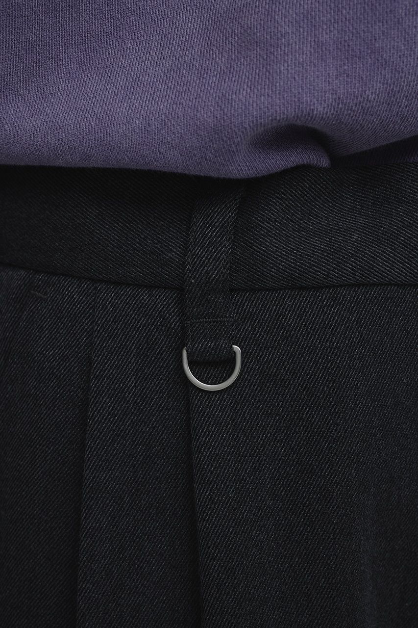 ウォーム感のあるTRツイルを使用したクリーンな表面感でしわになりにくく、落ち感のあるワイドトラウザー。ヒップ周りは2タックでゆとりを持たせ、着用頂きやすいように緩やかにワイドにテーパードするように仕上げた一枚。ウエスト背面側はシャーリング、フロント内部はスピンドルが入っているので、ストレスフリーに着用いただけます。透け感なし。ストレッチなし。