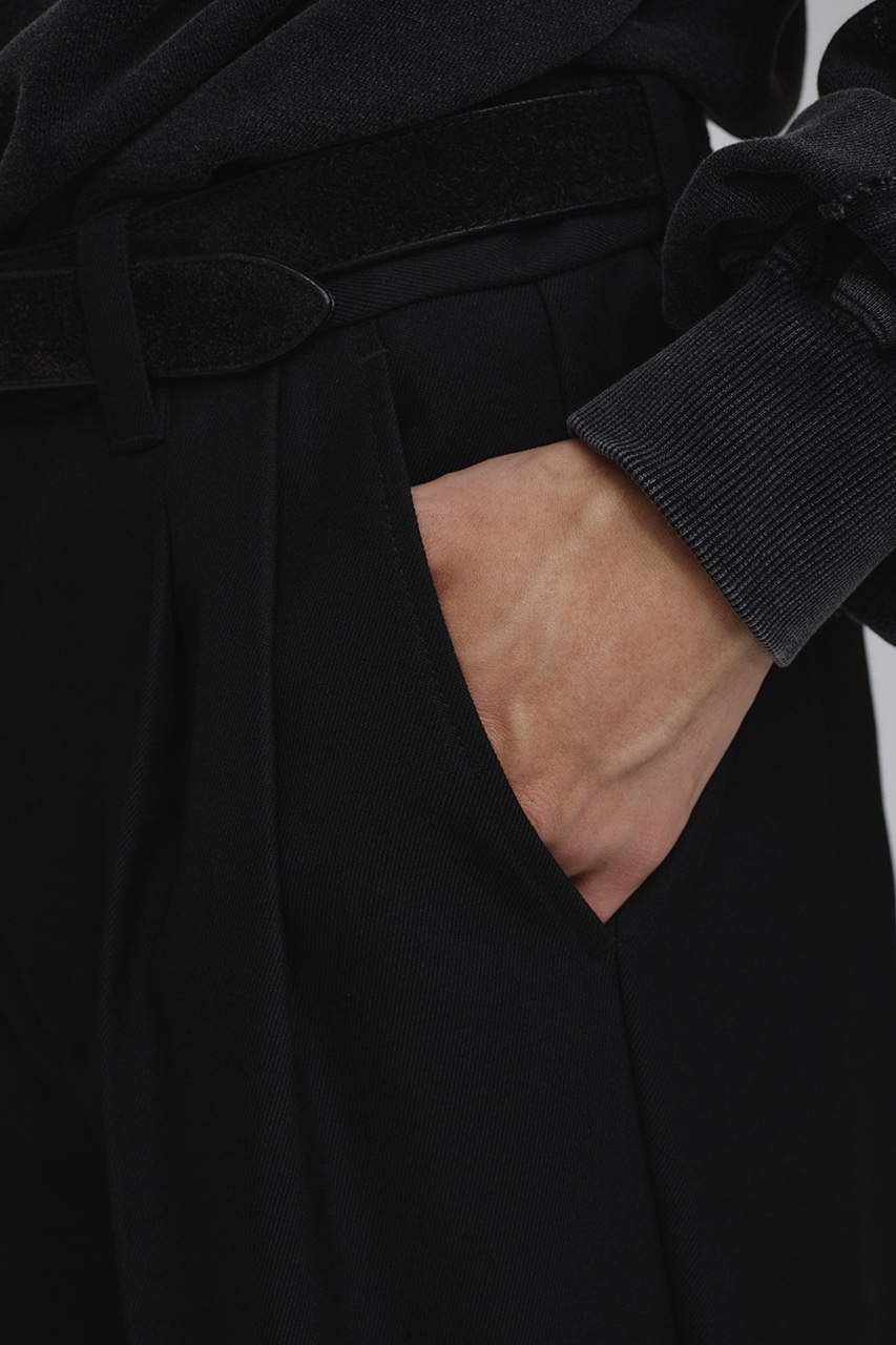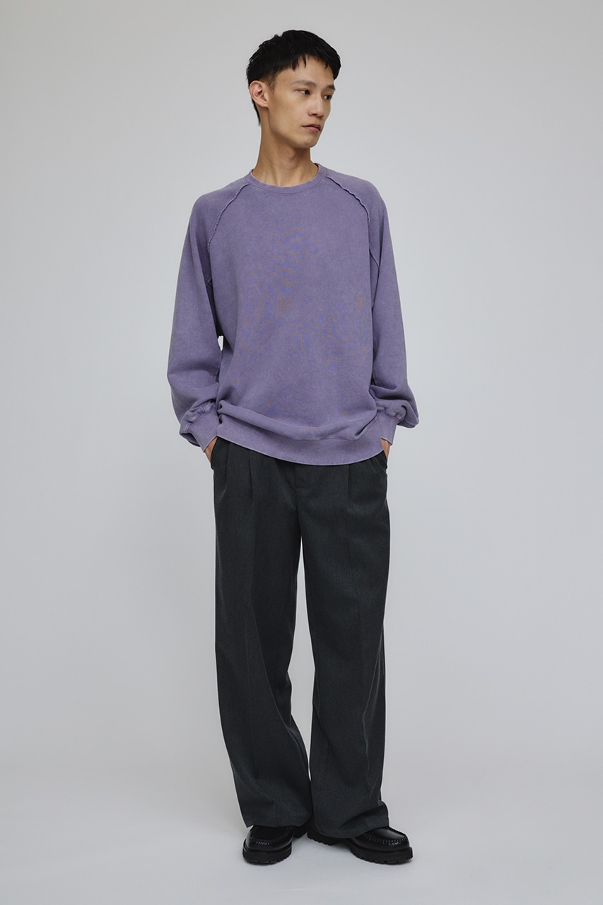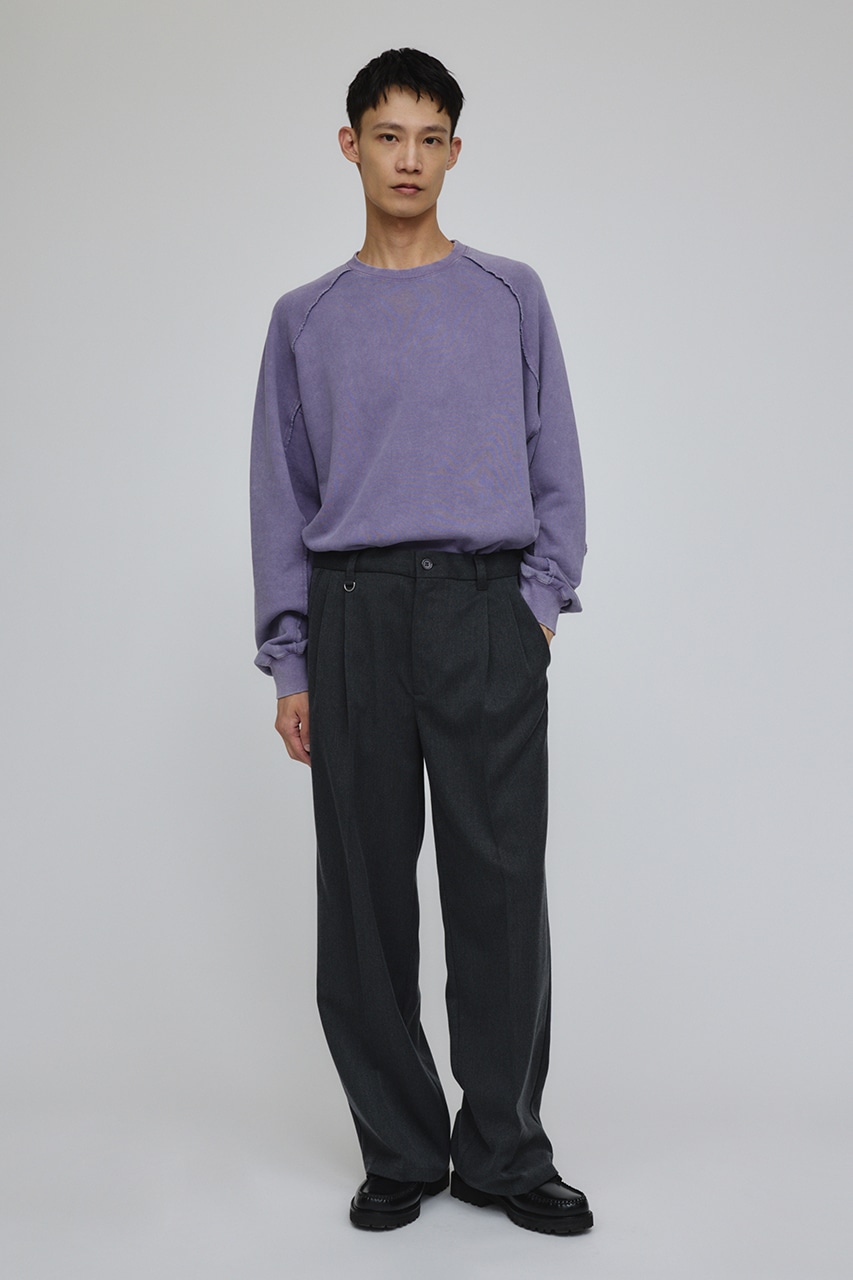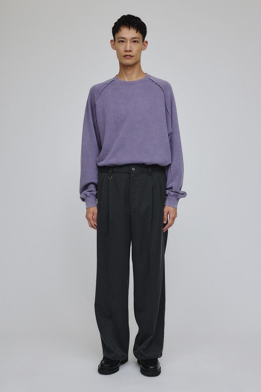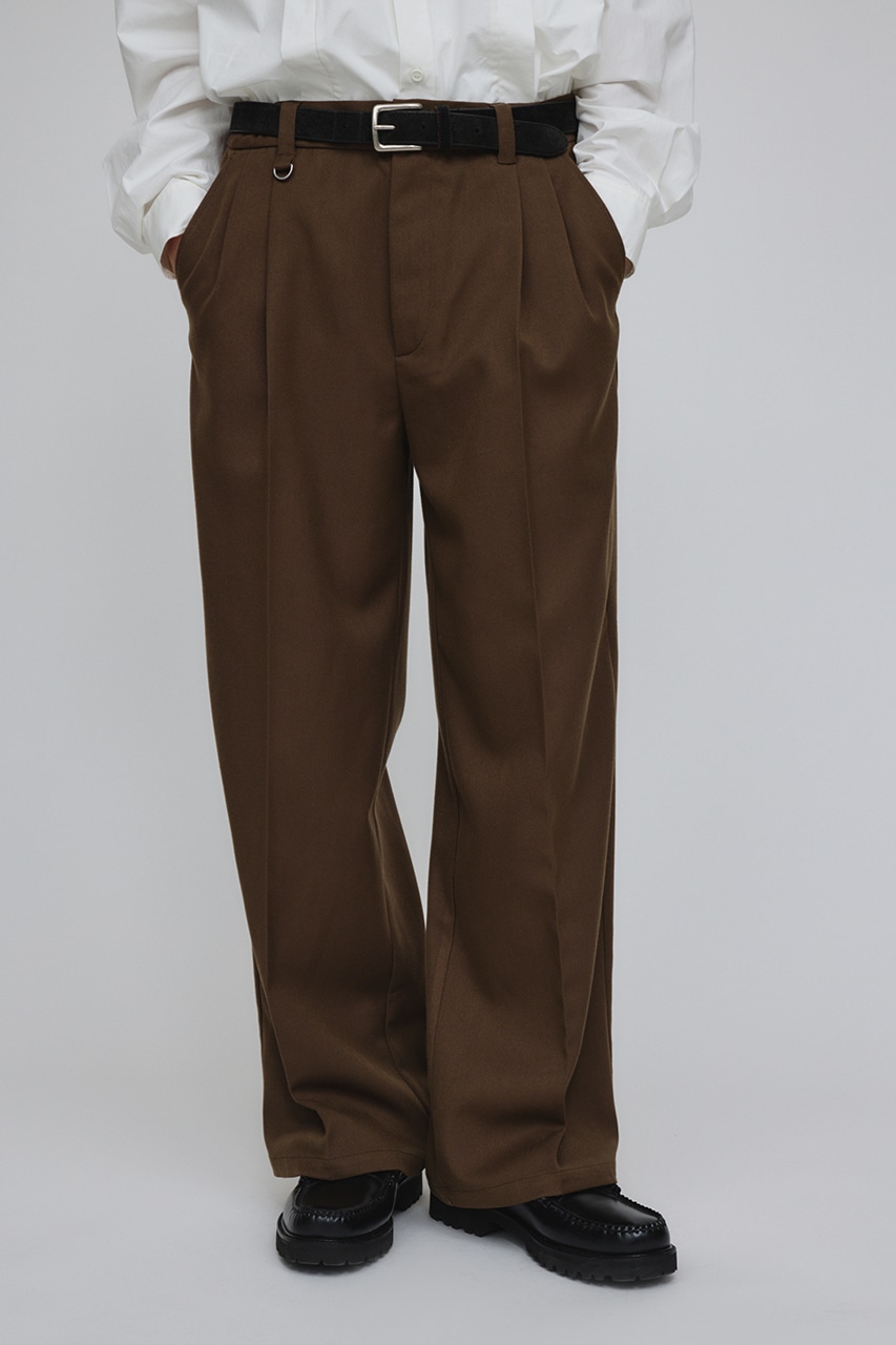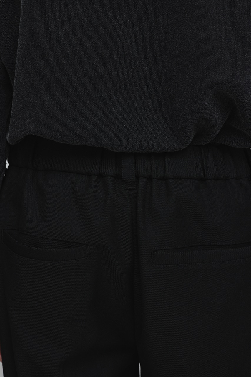 ウォーム感のあるTRツイルを使用したクリーンな表面感でしわになりにくく、落ち感のあるワイドトラウザー。ヒップ周りは2タックでゆとりを持たせ、着用頂きやすいように緩やかにワイドにテーパードするように仕上げた一枚。ウエスト背面側はシャーリング、フロント内部はスピンドルが入っているので、ストレスフリーに着用いただけます。透け感なし。ストレッチなし。