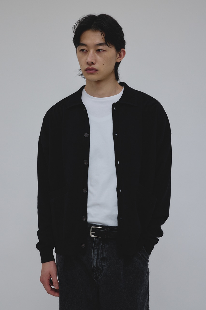 12ゲージウールブレンドの天竺編みで仕上げたニットカーディガン。カットソーの上からも羽織れ、ミドルレイヤーとしてアウターの中間着としても使える汎用性の高いアイテムです。シンプルながらも衿や身頃の編み地変化でアクセントを加えています。ストレッチあり、透け感なし。