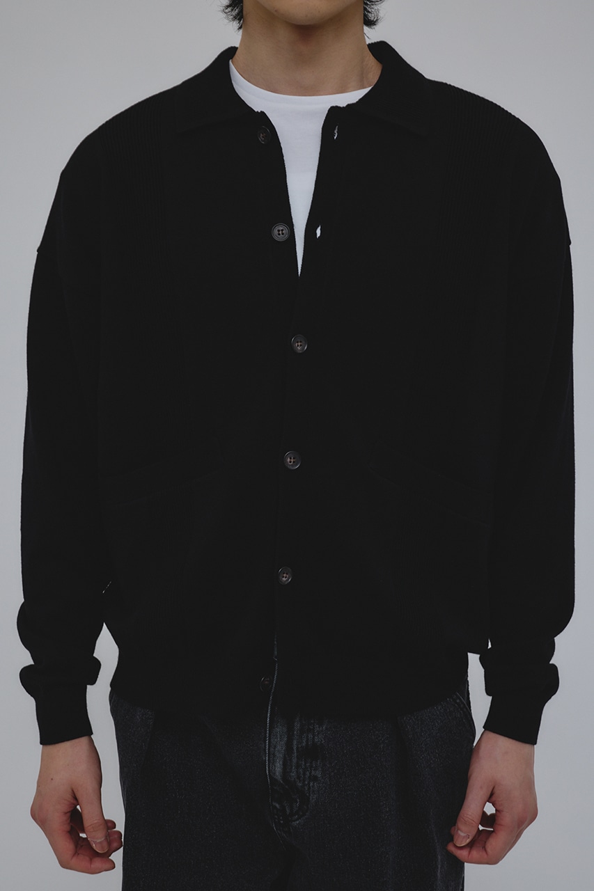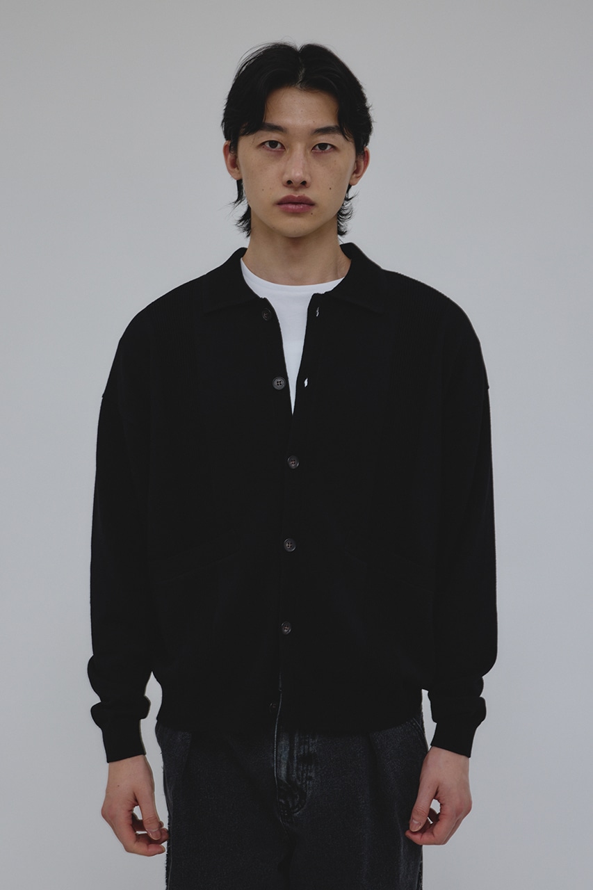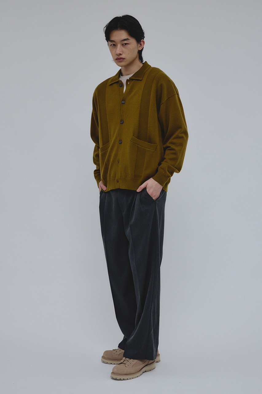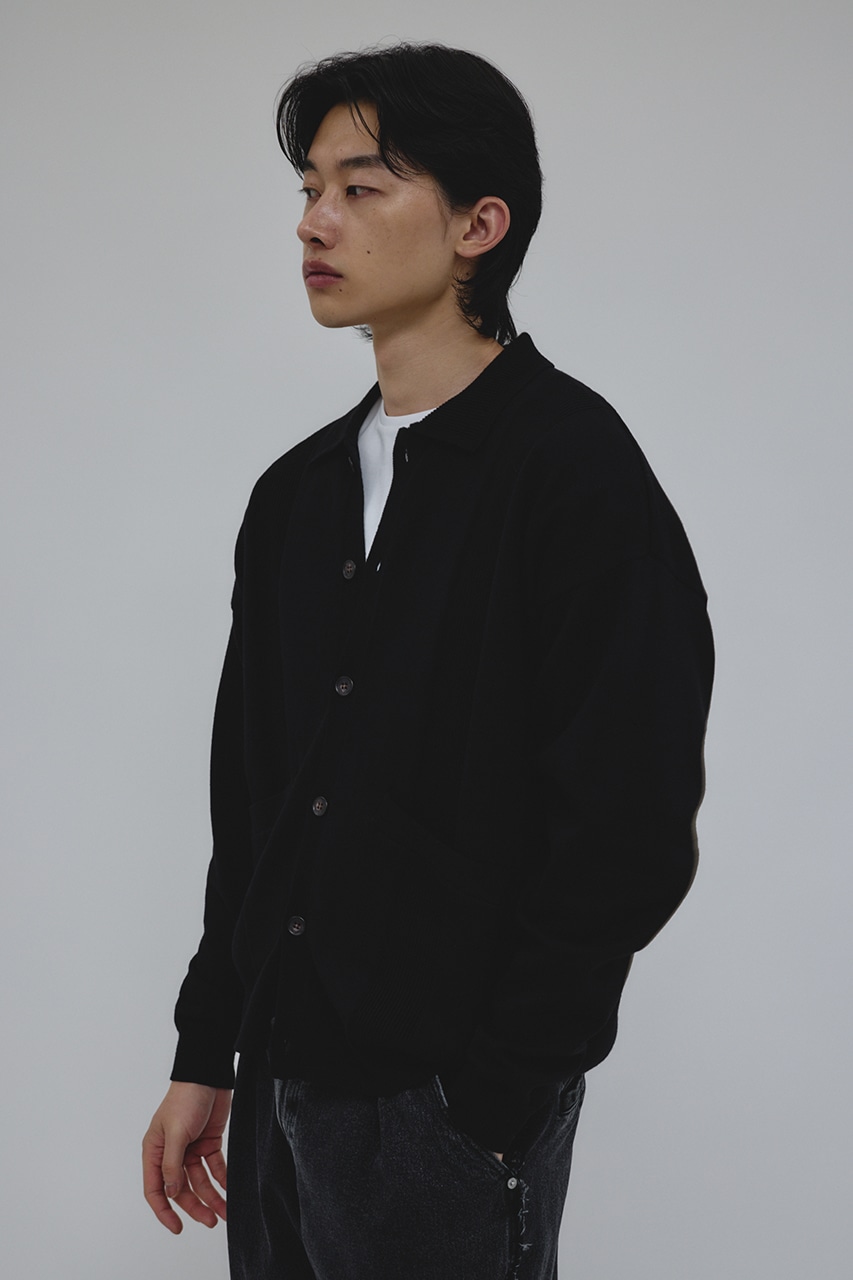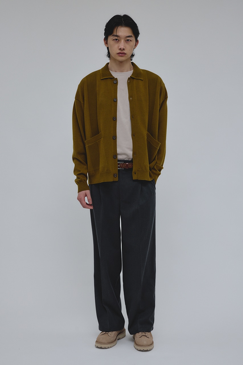 12ゲージウールブレンドの天竺編みで仕上げたニットカーディガン。カットソーの上からも羽織れ、ミドルレイヤーとしてアウターの中間着としても使える汎用性の高いアイテムです。シンプルながらも衿や身頃の編み地変化でアクセントを加えています。ストレッチあり、透け感なし。