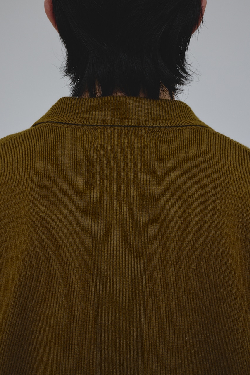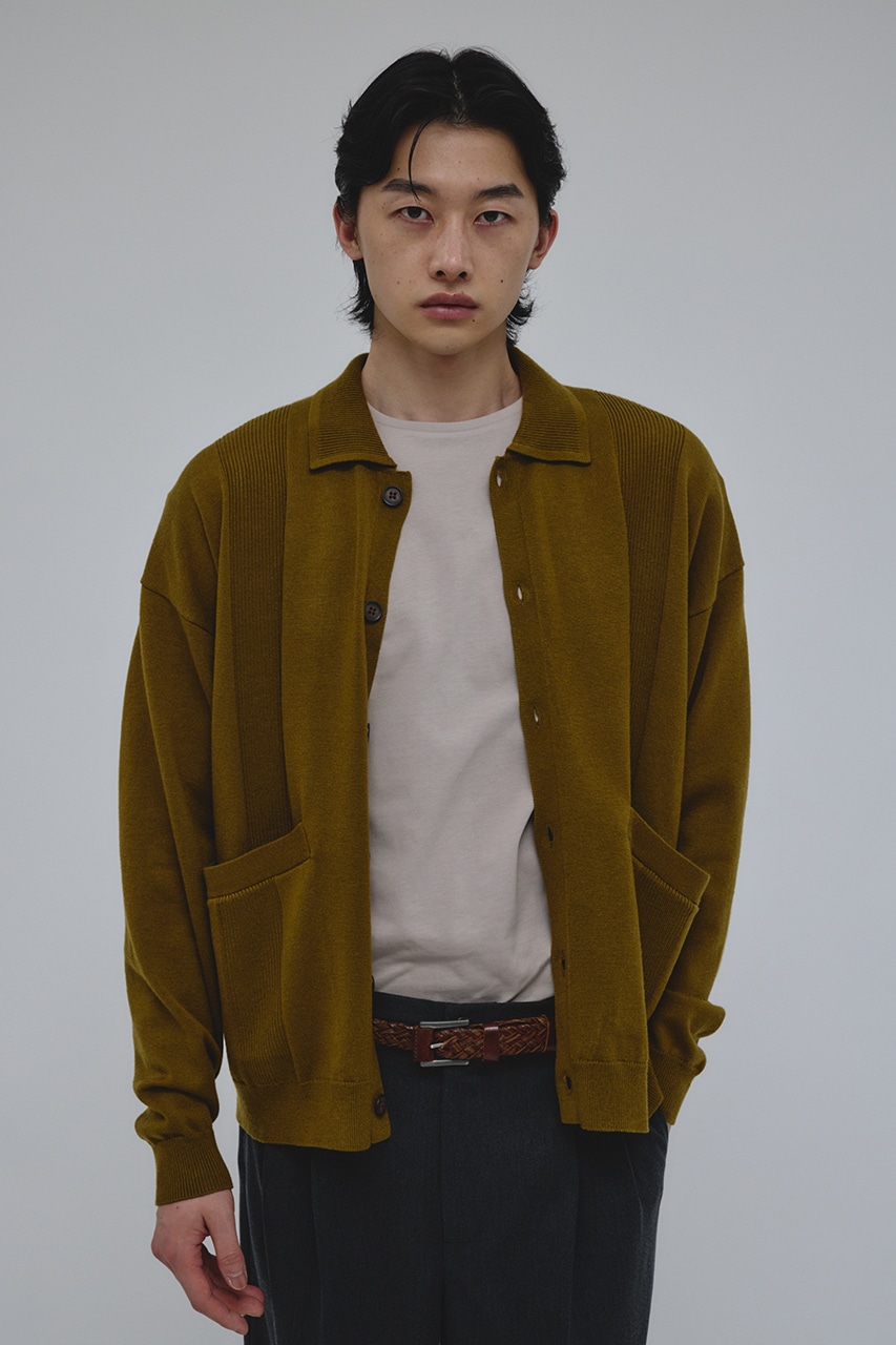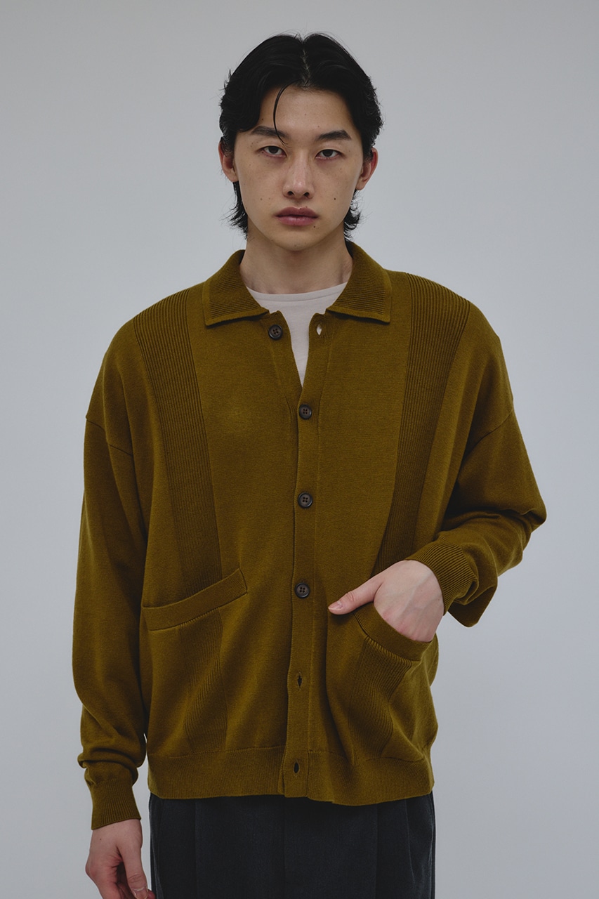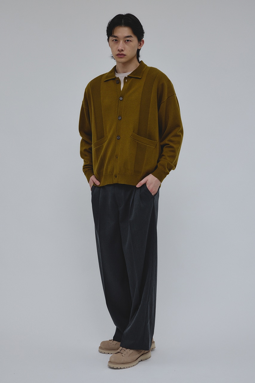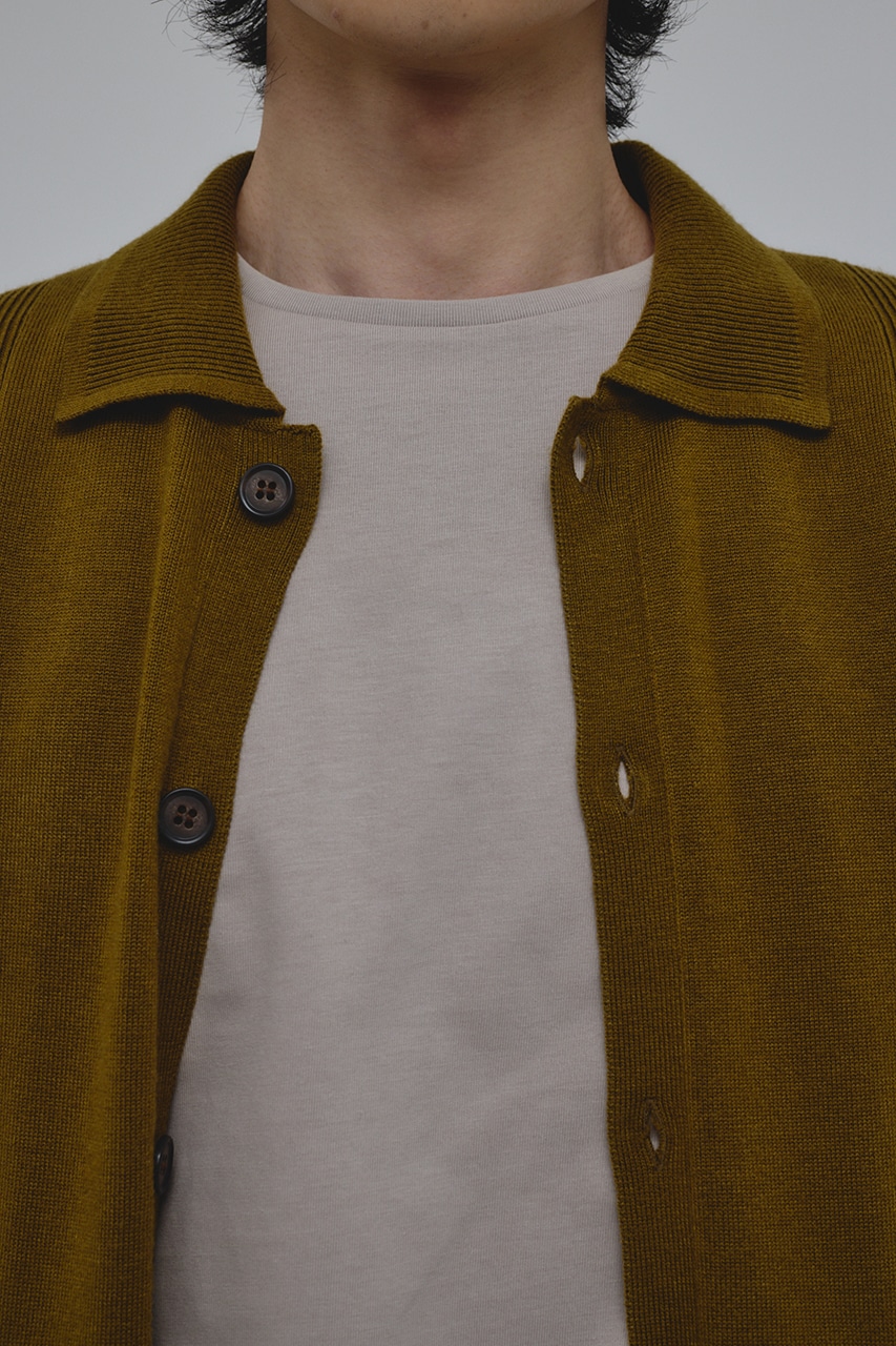 12ゲージウールブレンドの天竺編みで仕上げたニットカーディガン。カットソーの上からも羽織れ、ミドルレイヤーとしてアウターの中間着としても使える汎用性の高いアイテムです。シンプルながらも衿や身頃の編み地変化でアクセントを加えています。ストレッチあり、透け感なし。