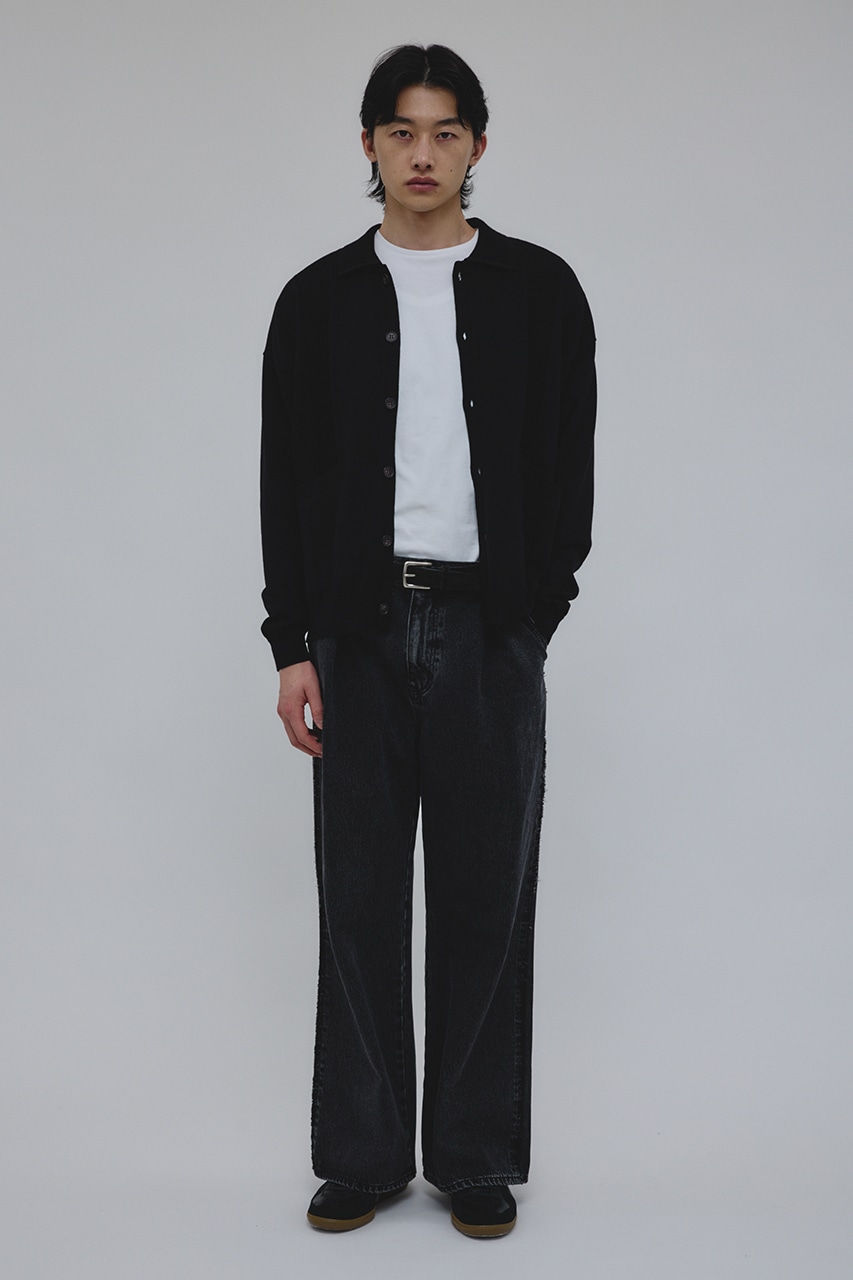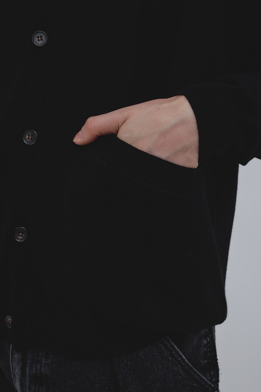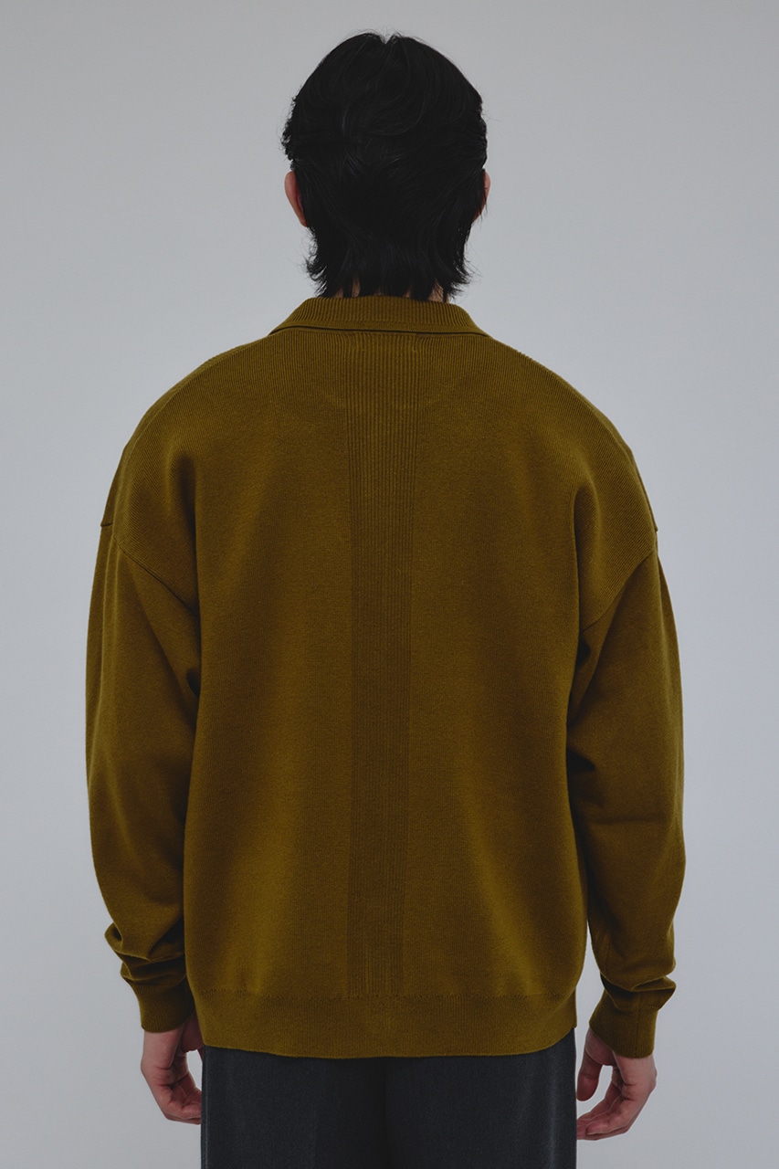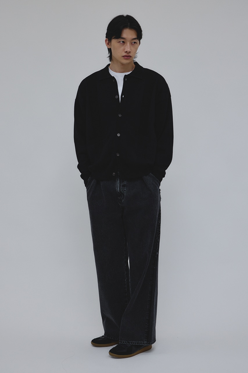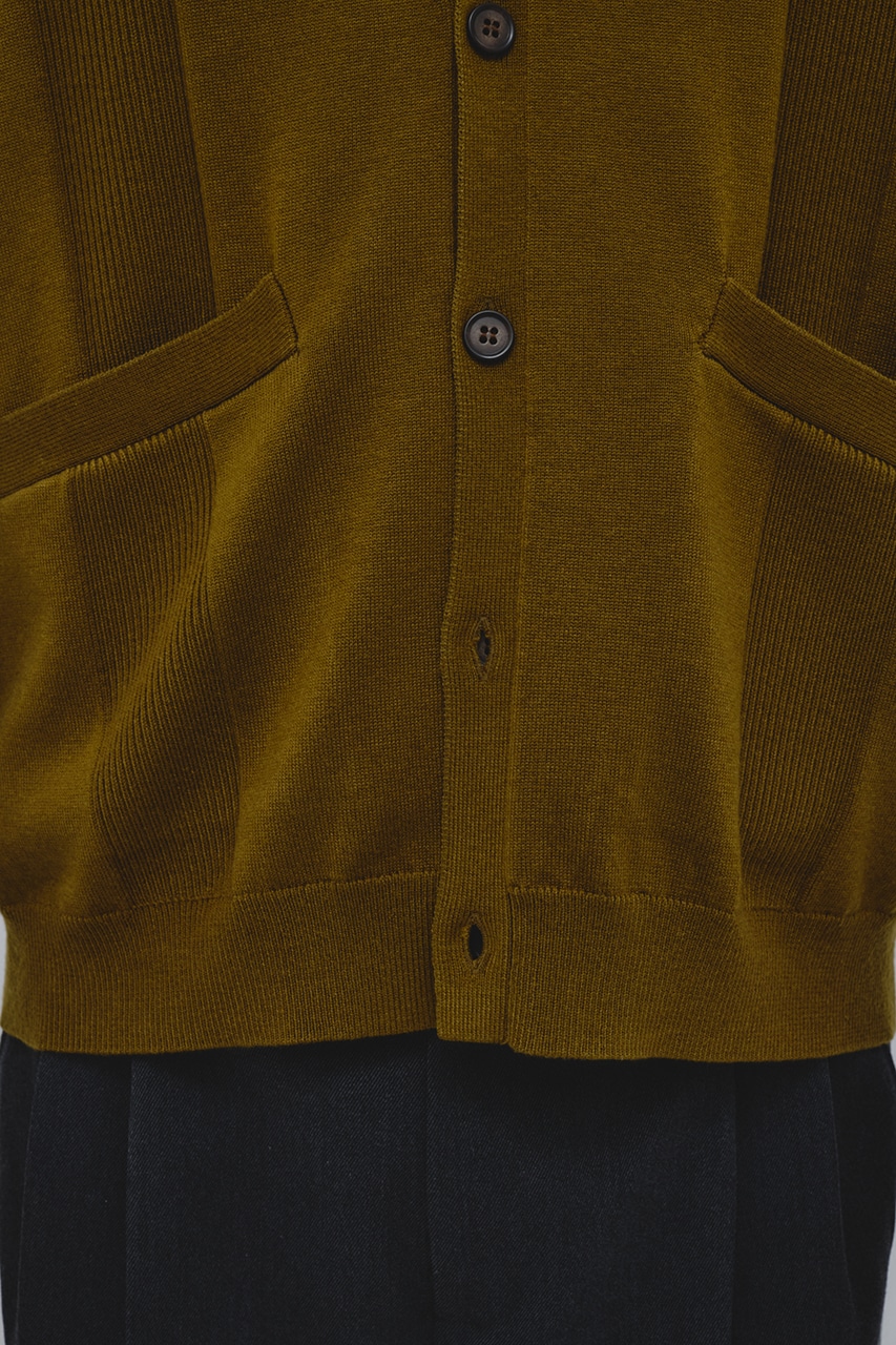 12ゲージウールブレンドの天竺編みで仕上げたニットカーディガン。カットソーの上からも羽織れ、ミドルレイヤーとしてアウターの中間着としても使える汎用性の高いアイテムです。シンプルながらも衿や身頃の編み地変化でアクセントを加えています。ストレッチあり、透け感なし。