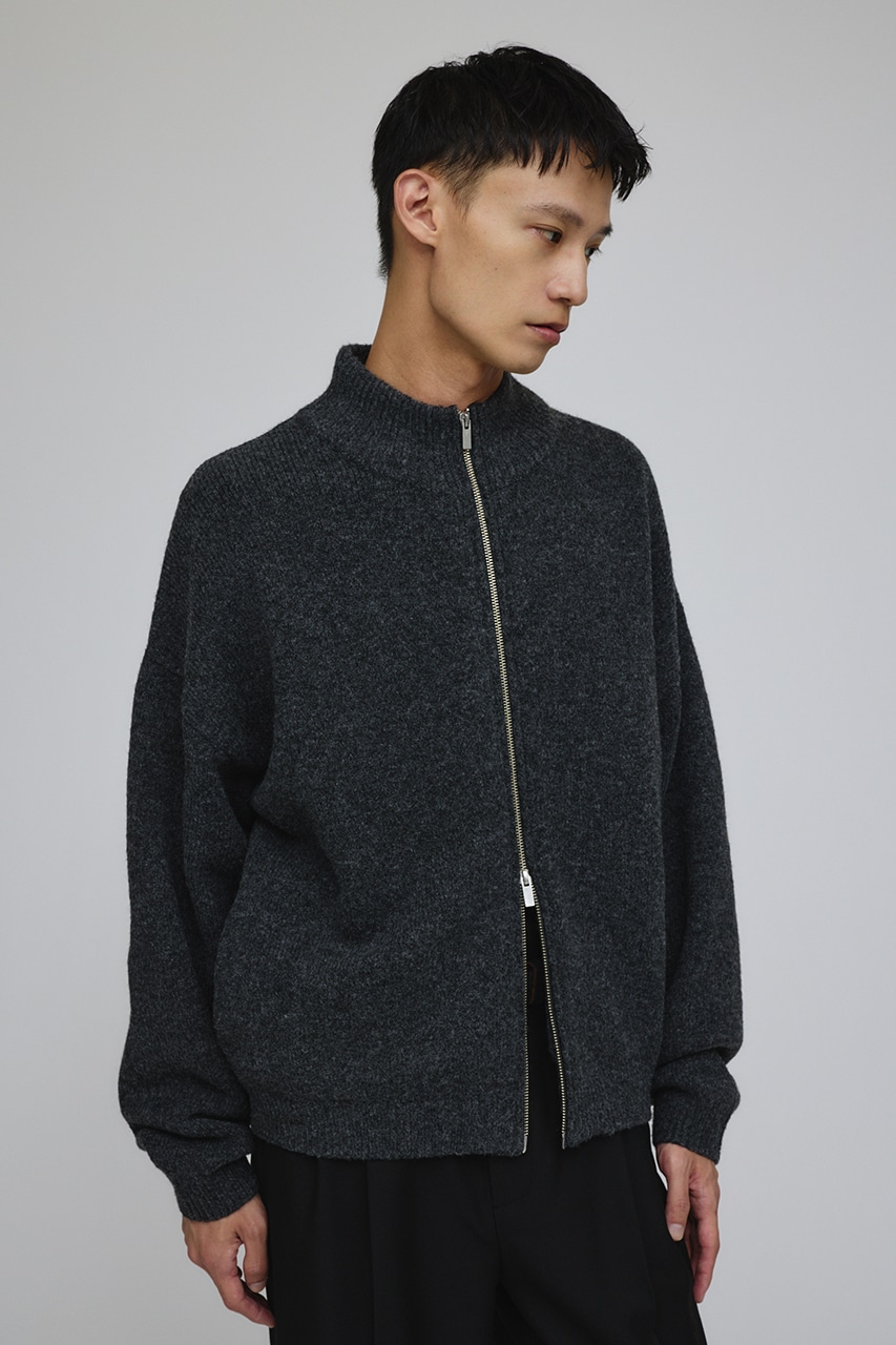 ウォーム感のある5ゲージのアクリルナイロン糸にポリウレタン混紡糸をミックスしたシャギーニット。通常のニットに比べ弾力とキックバックに優れ、型崩れしにくいのが特徴。ブルゾン感覚でもミドルレイヤーとしても活躍するアイテムです。ストレッチあり、透け感なし。