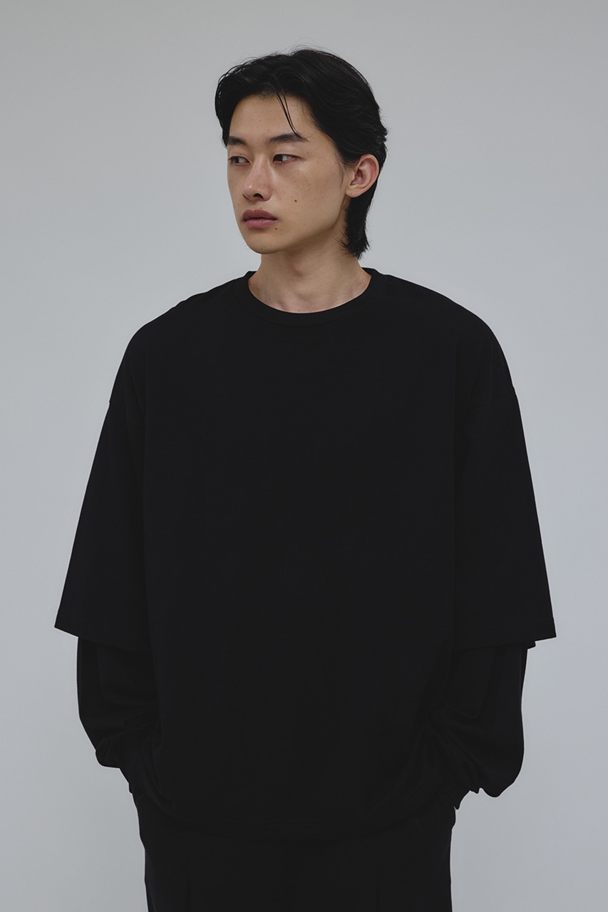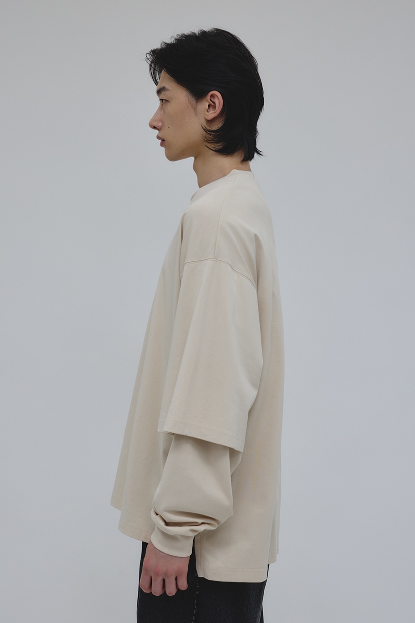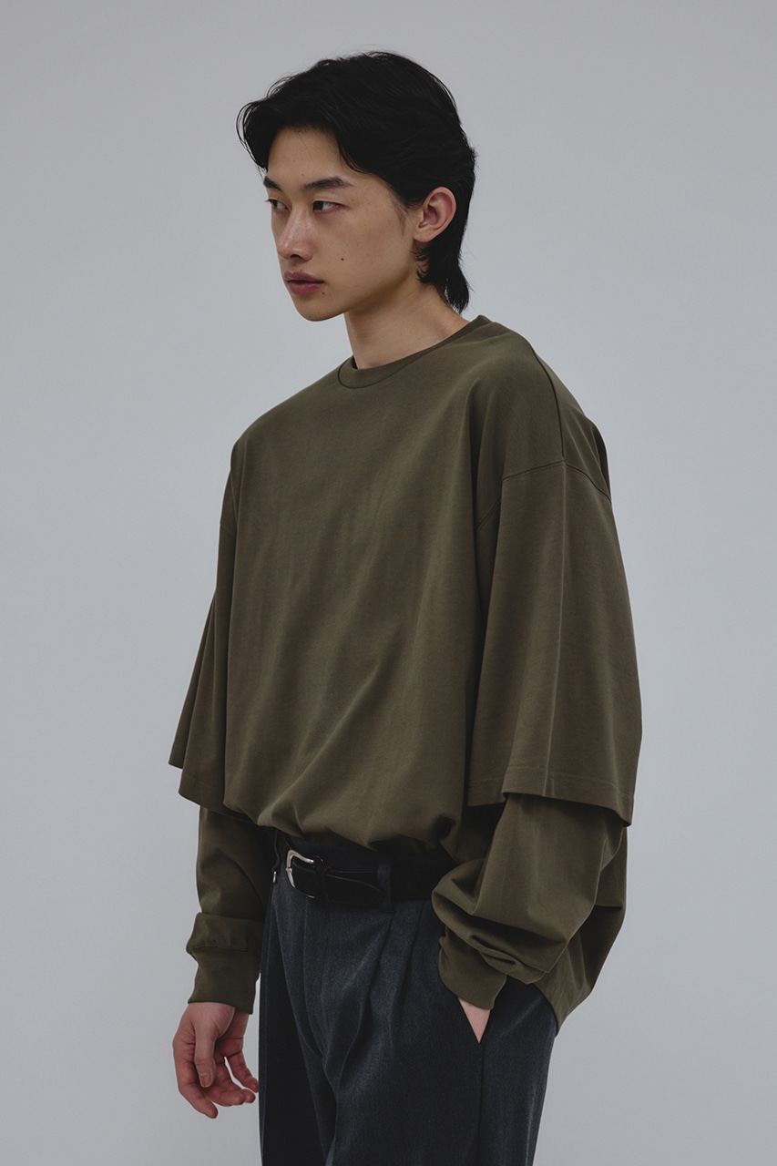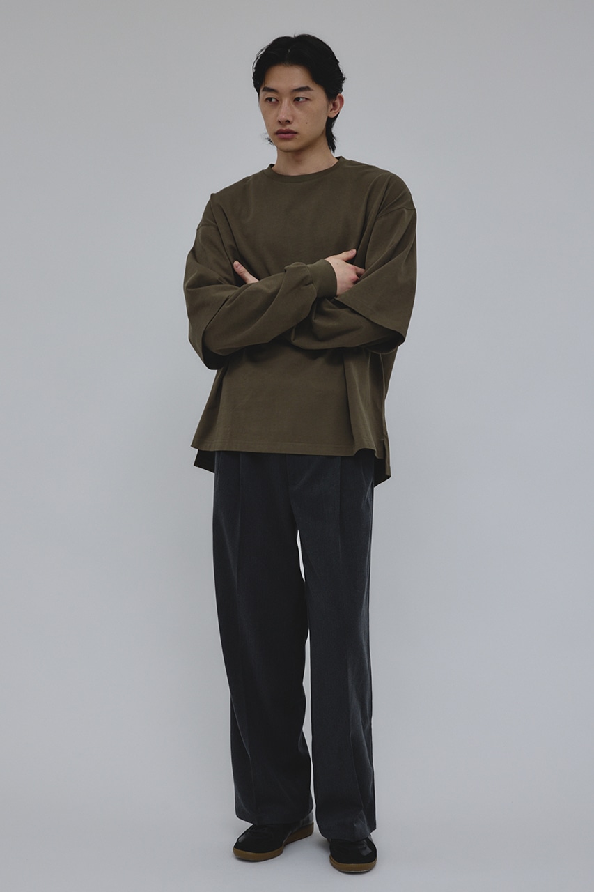 32番双糸天竺を使用したシンプルながら高級感のある目面が特徴のロンT。さらりとした独特な肌触りとシルクのような落ち感が叶うシリコンバイオ加工を採用。ストレスを感じさせない最高の着心地と、大人っぽい表情が魅力です。ゆとりのあるサイズ感一枚でレイヤードが完成します。ストレッチあり、透け感なし。