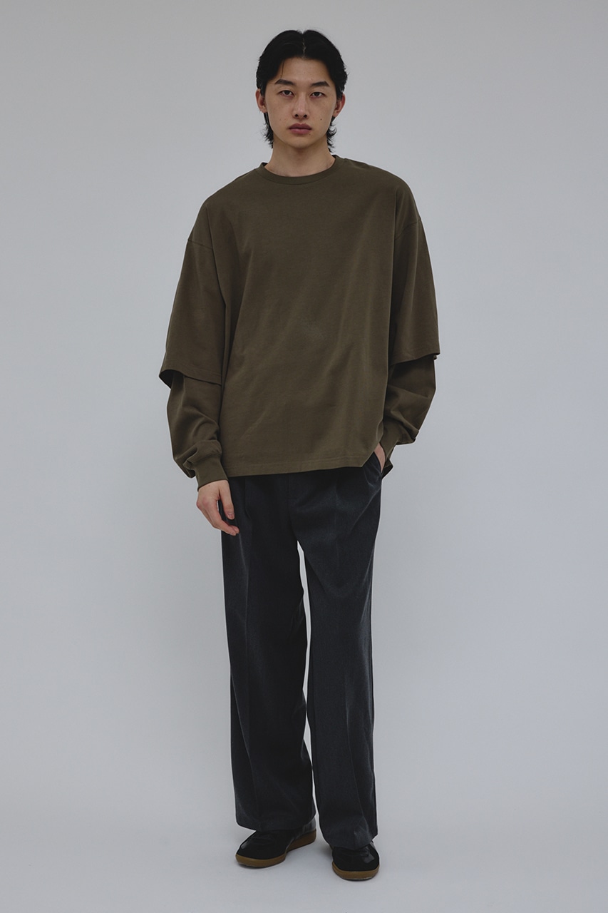 32番双糸天竺を使用したシンプルながら高級感のある目面が特徴のロンT。さらりとした独特な肌触りとシルクのような落ち感が叶うシリコンバイオ加工を採用。ストレスを感じさせない最高の着心地と、大人っぽい表情が魅力です。ゆとりのあるサイズ感一枚でレイヤードが完成します。ストレッチあり、透け感なし。